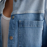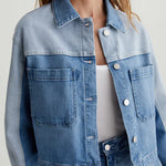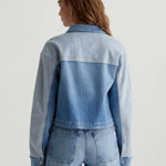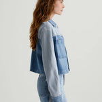 AG Jeans Juliana Jacket in Wanderlust. The Juliana shirt jacket has a cropped, boxy shape in Italian stretch denim. It's done in a light indigo shade and features reverse-side paneling for colorblocked contrast. Topped by a pointed collar, the style finishes with a button placket and workwear-inspired patch pockets at the front.