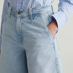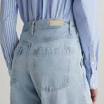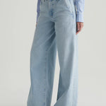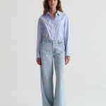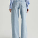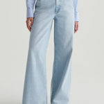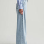 AG Stella Jean in Idol. Stella is a low-slung palazzo pant crafted from Drapey Rigid Denim in a cotton-lyocell blend. Featuring a bleached-out light blue wash, this pair has slant front pockets and a super-wide cut through the legs.
