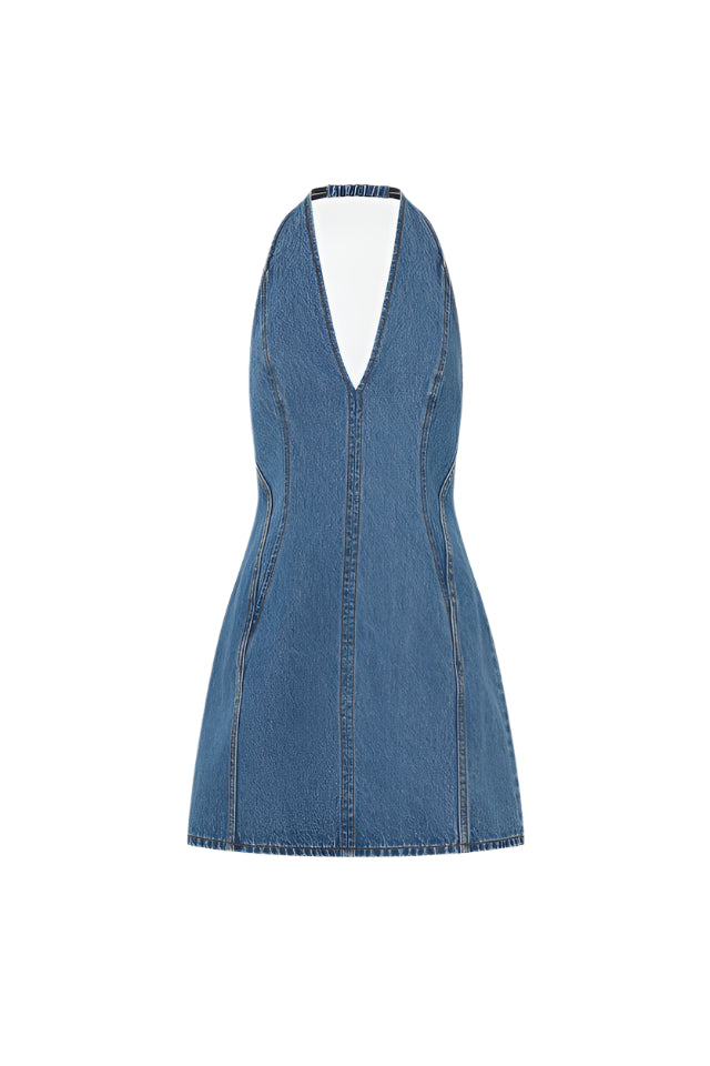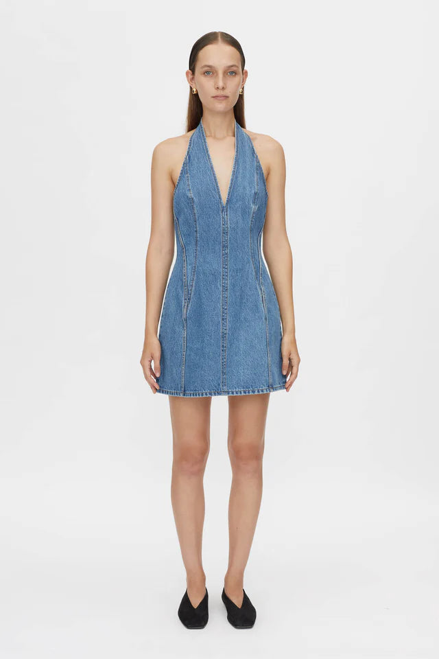 Camilla and Marc Cascadia Denim Mini Dress in Classic Blue. The Cascadia Denim Mini Dress is crafted from a cotton-blend fabric in a fitted, halter-style mini dress silhouette. This dress features a V-neck and centre back zip closure.