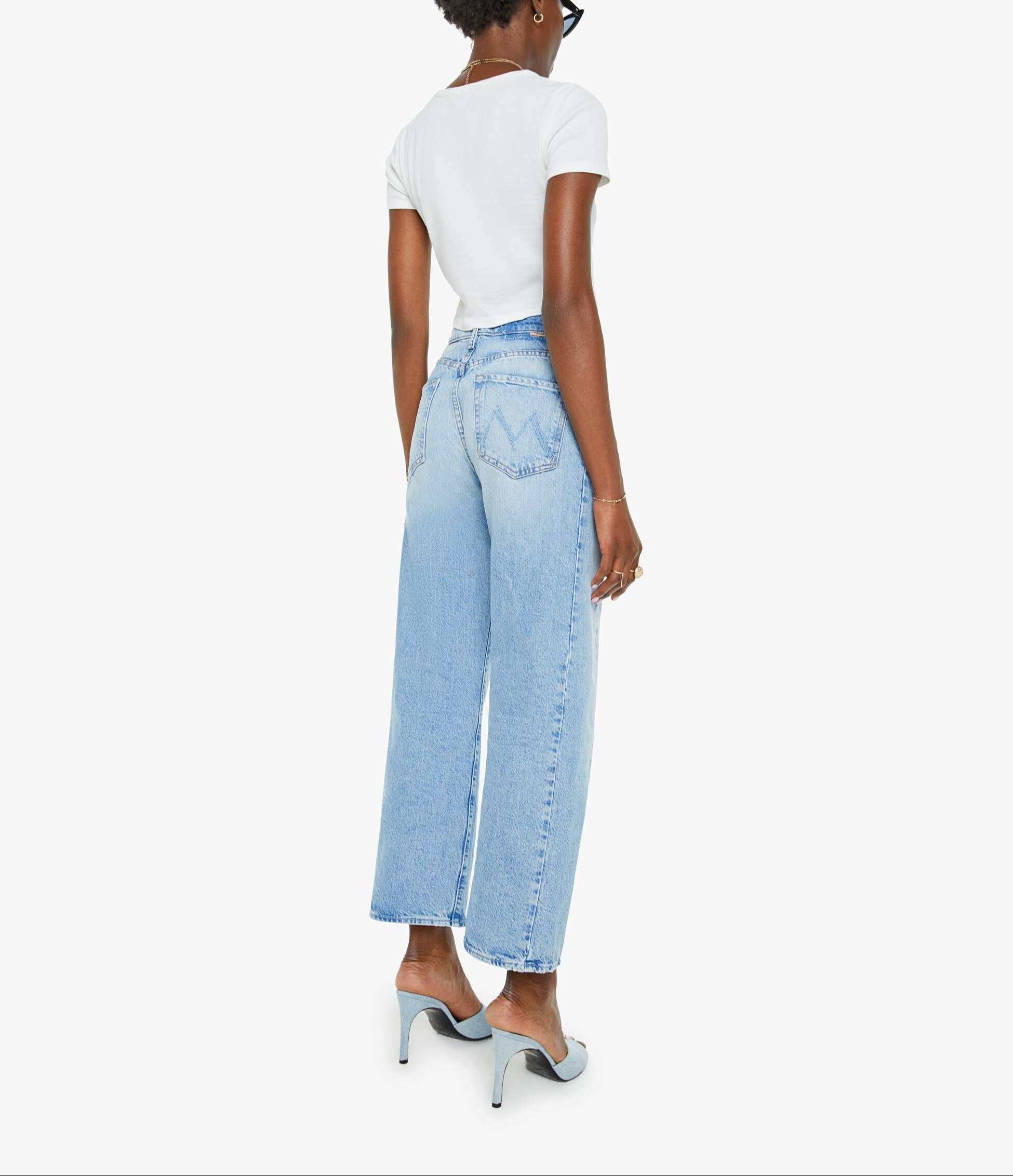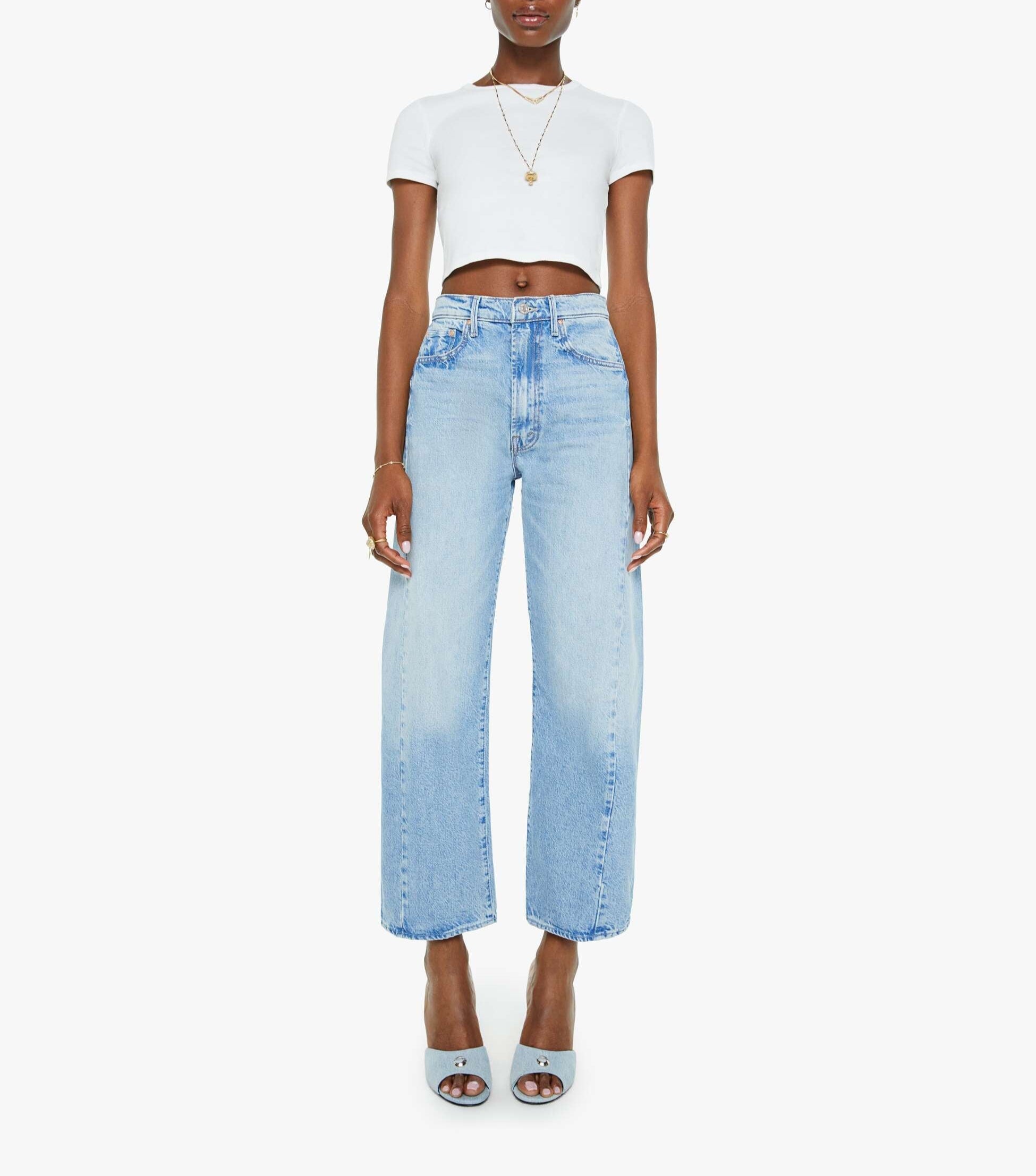 A super high-waisted jean with a wide, curved leg, an ankle-length inseam and a clean hem. Cut from 100% SUPERIOR denim, This Is How I Roll is a light blue wash with whiskering and fading at the knee.