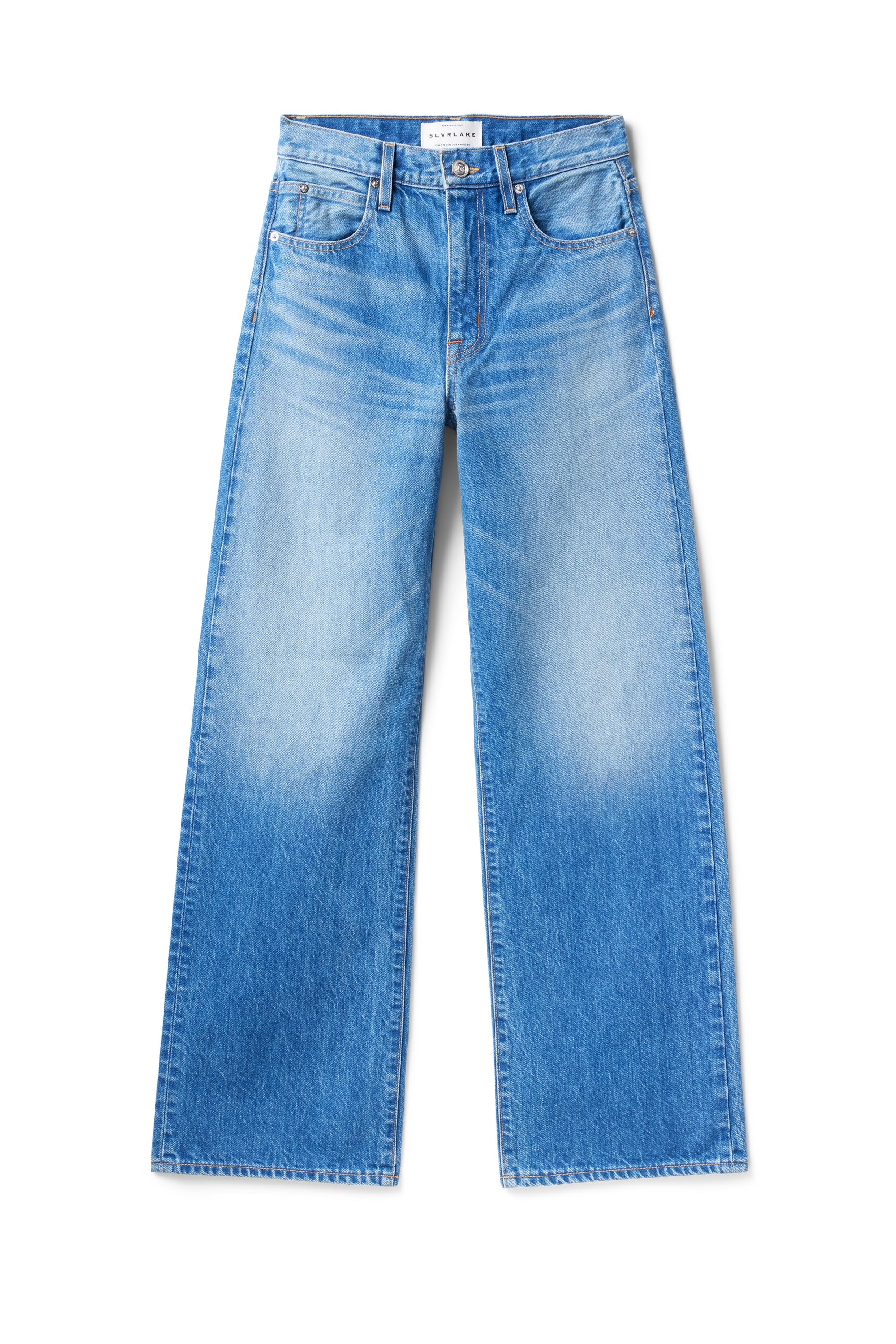 Slvrlake Grace Jean in Too Good To Be True. Grace is a SLVRLAKE signature style designed to elongate the leg. Featuring a high-rise waist and wide-leg silhouette, it fits close through the waist and hip before flowing through the leg, finished with a raw hem. An essential style offering versatile styling options.