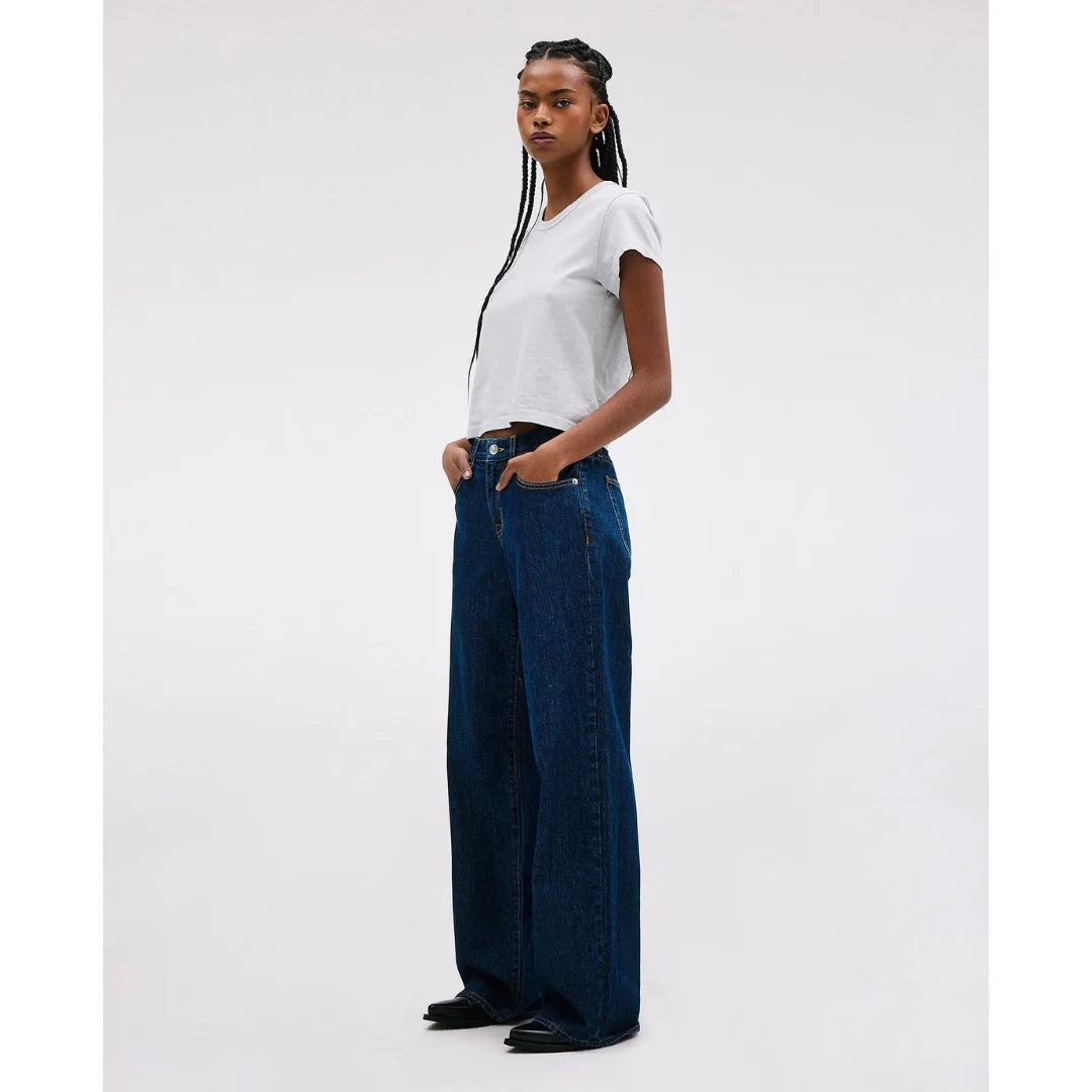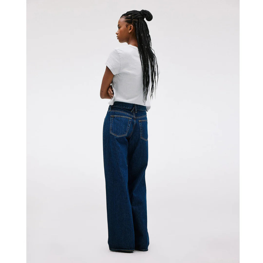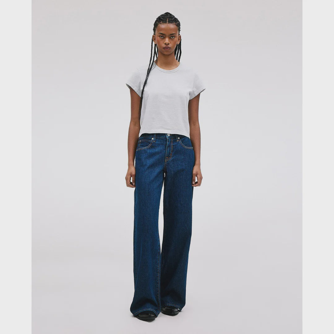 Slvrlake Mica Jean in Infinite Dream. Mica offers a relaxed silhouette designed with a low rise and wide leg. Quality and craftsmanship are at the heart of SLVRLAKE. This garment is crafted from 100% GOT certified organic Italian fabric, hand crafted in Los Angeles to the highest quality standards.