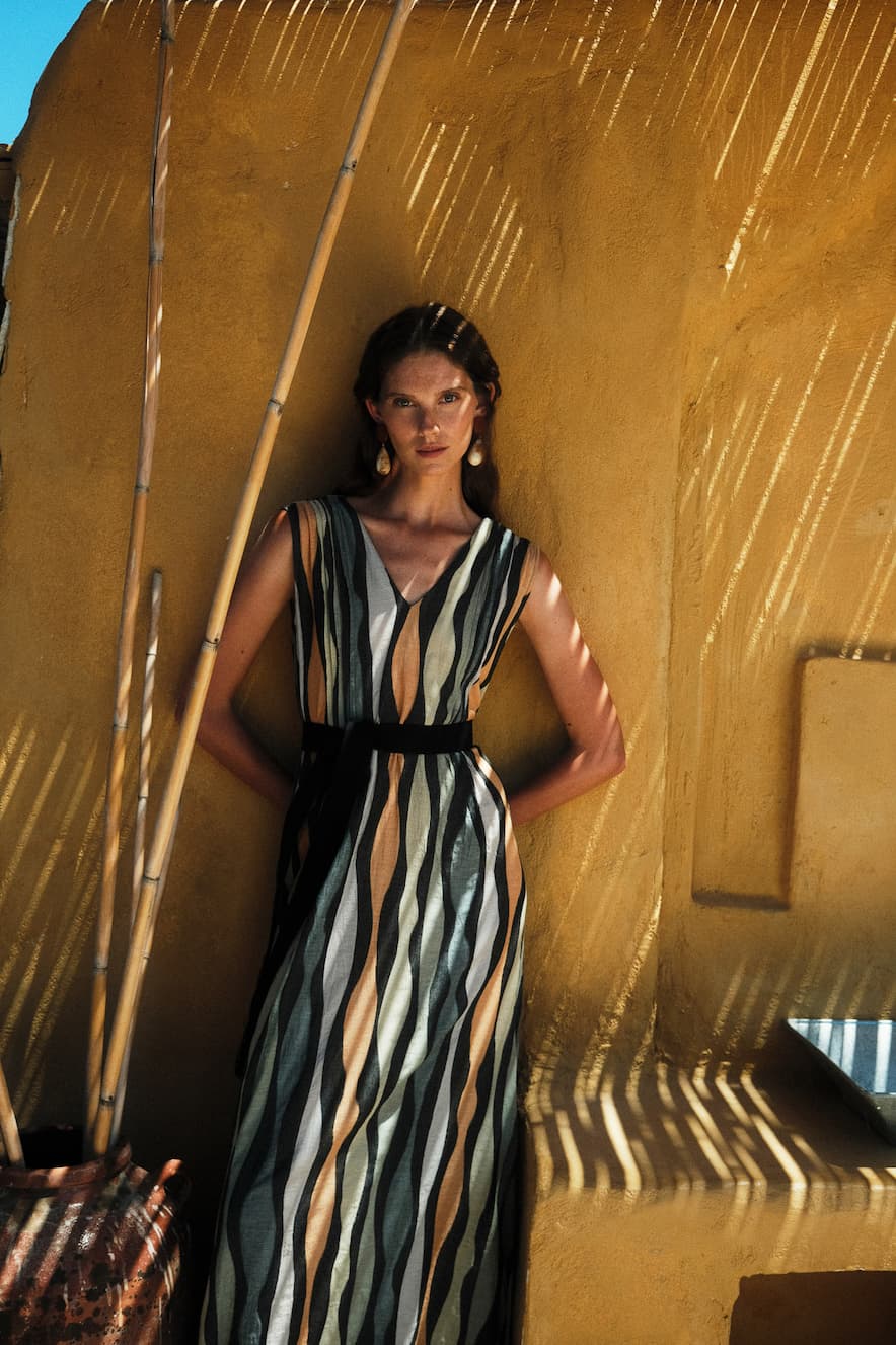 Devotion Idyllic Dress in Khaki and Tabac. Devotion Idyllic Jacquard Maxi Dress,with a deep V-neckline, sleeveless cut, and flowy silhouette, this dress drapes beautifully, enhancing your natural shape. The woven jacquard fabric showcases a mesmerizing wavy stripe print in earthy tones, adding depth and movement to your look. The adjustable fabric belt with tassel details cinches at the waist, creating a flattering fit while adding a touch of artisanal. Featuring a striking wavy stripe pattern and a cinched waist with a tasseled belt, this boho-chic dress exudes effortless elegance.