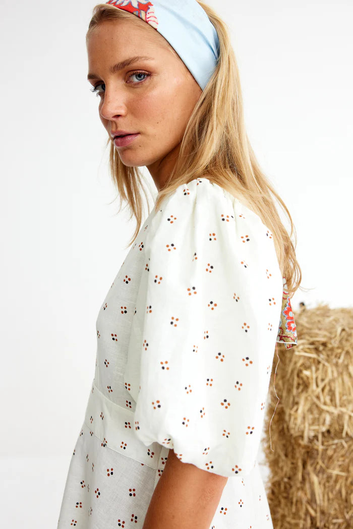 Binny Galloway Dress. The GALLOWAY is a size and also an extinct horse breed, once native to England. It was said to have "good looks, a wide, deep chest and a tendency to pace rather than trot." Sounds like pretty much most of our friends. Here in, we bring the namesake sweetest little cotton linen summer dress. Fully lined, ditsy scattered spots, puff sleeves & knee length. Pockets, elaccy in the backy.