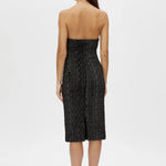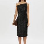 CAMILLA AND MARC Elise strapless asymmetric midi dress. Fitted internal bodice, column silhouette, centre back hem split. Centre back invisible zip closure.