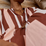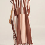 The Thaddeus Caftan is an oversized, relaxed silhouette crafted from our Pink and Brown Sarong Voile, a lightweight cotton in a warm mix of pink, brown and white hues. It features a round neckline edged with delicate crochet, a V-neck drop with a tasseled tie closure, and gentle gathering at the base of the V for subtle shaping. Cap sleeves and side slits complete the flowing silhouette, making the Thaddeus Caftan an effortless piece for sun-drenched days or layered elegance at evening gatherings.