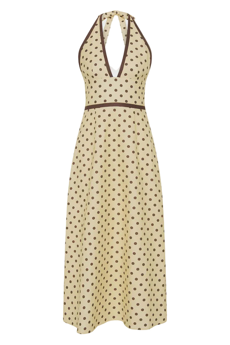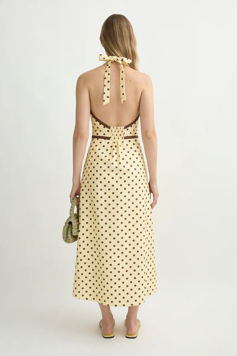 Posse Bowie Dress in Vanilla and Chocolate. Crafted from a premium cotton-linen blend, the Bowie Dress features a signature polkadot print. Designed with an adjustable halter neck tie, a shirred back panel, and contrast panel detailing, it falls to a full midi skirt.