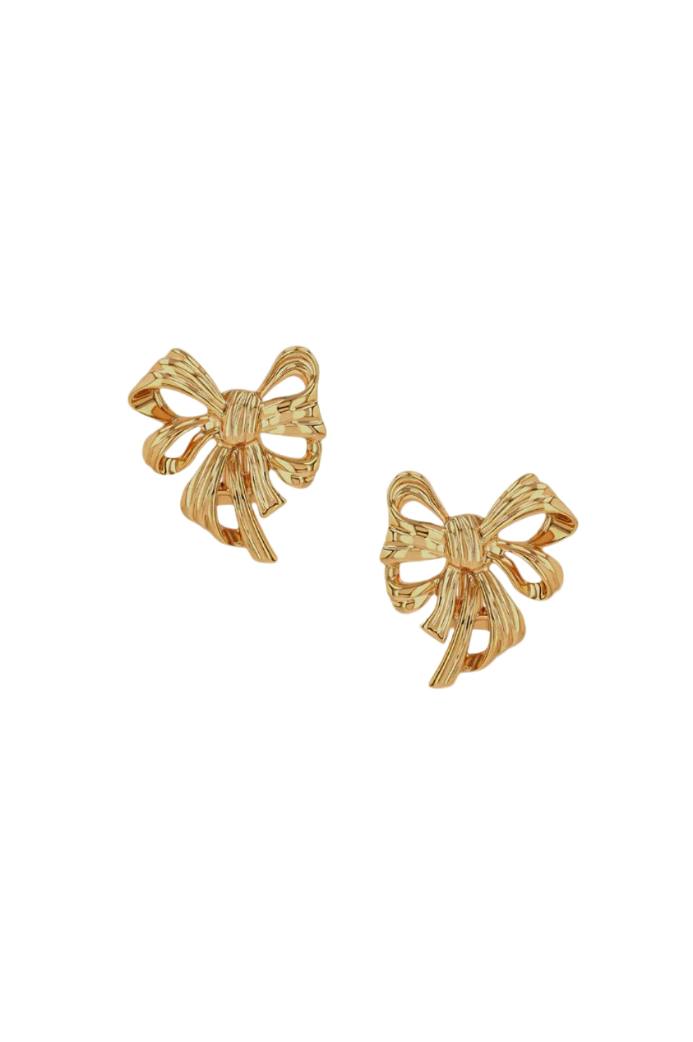 Anine Bing Bow Earrings in Gold. Feminine bow-shaped earrings crafted in 14k gold-plated brass. Complete with a traditional clip-back closure and butterfly backs. Sold as a pair.