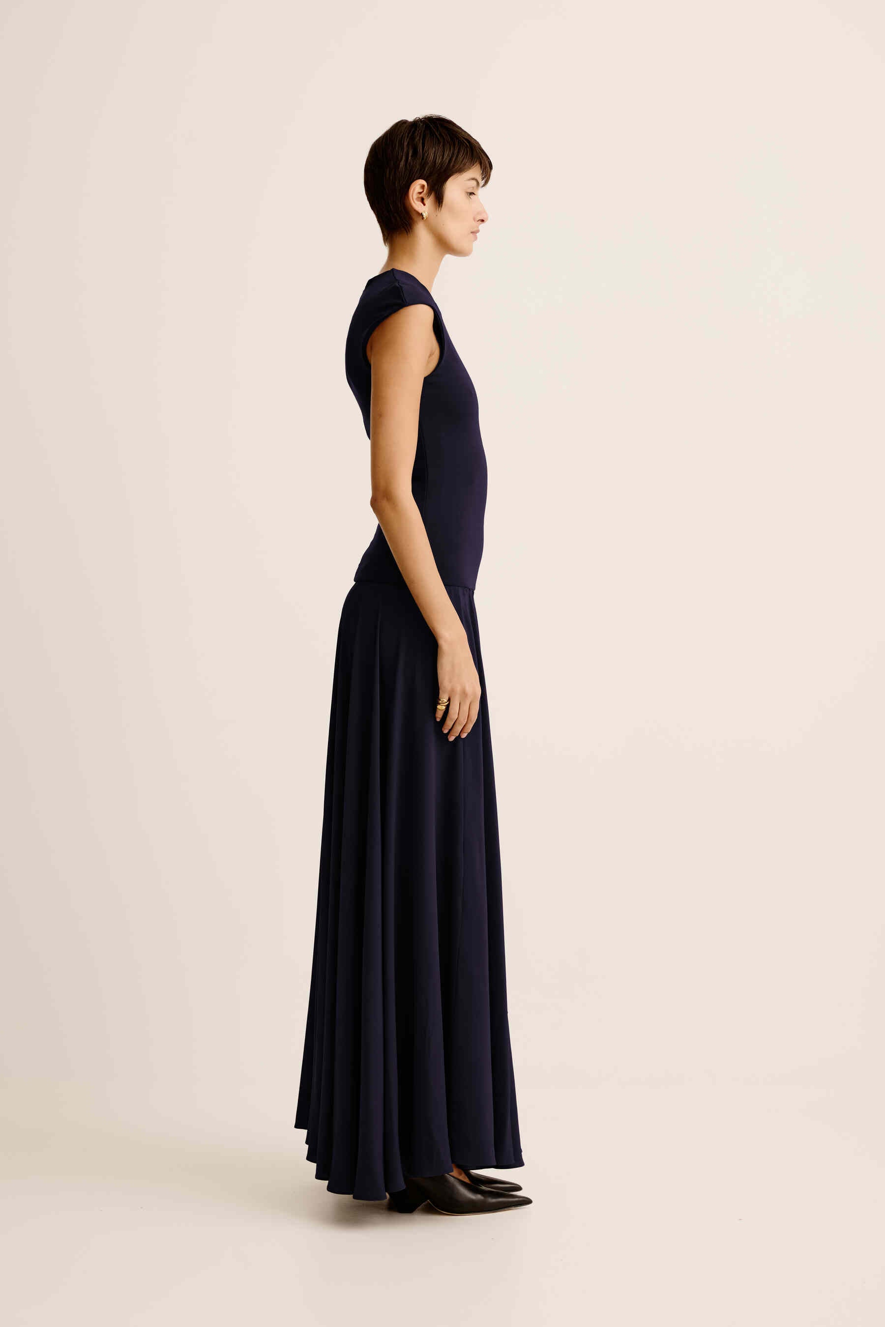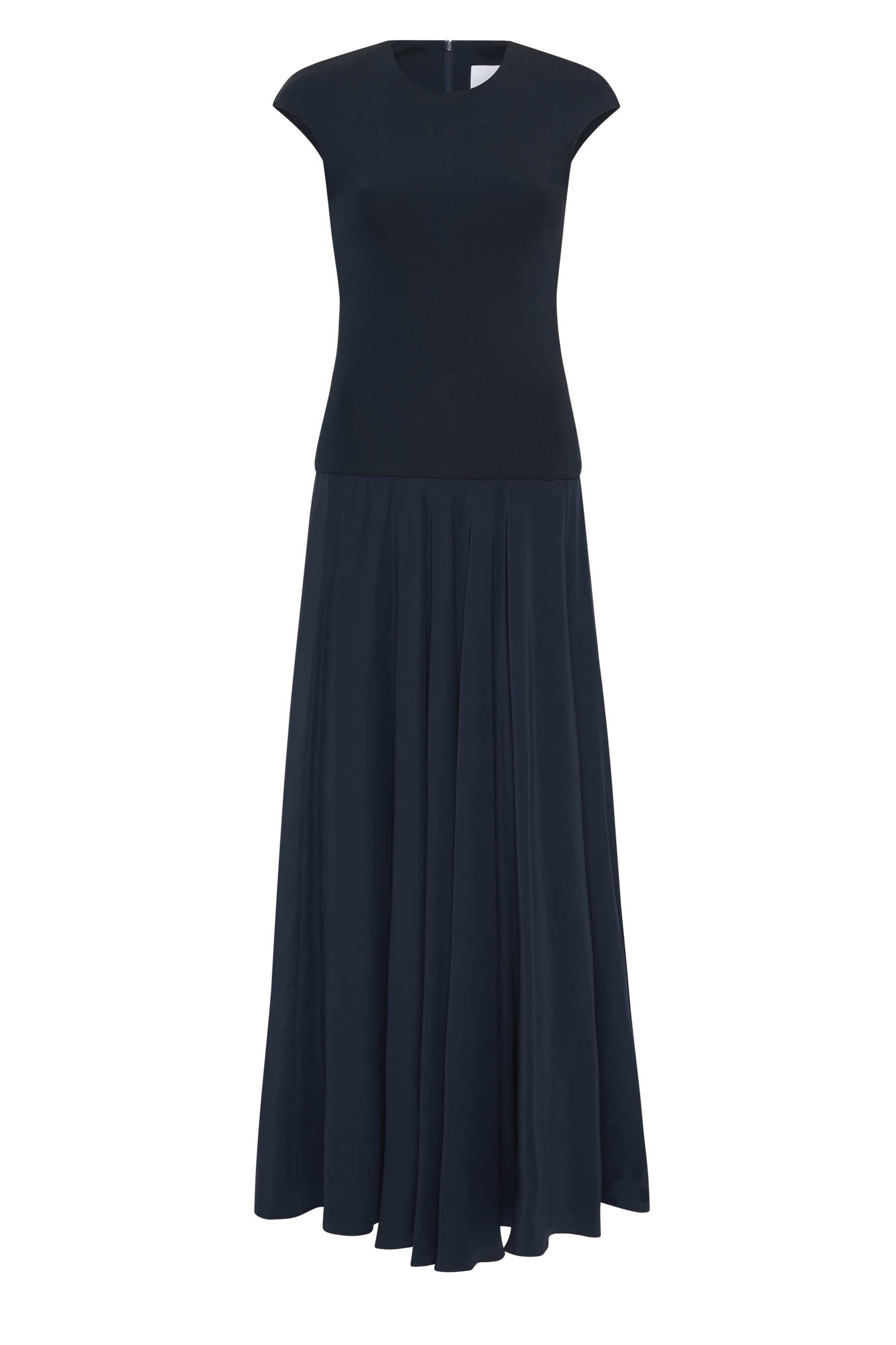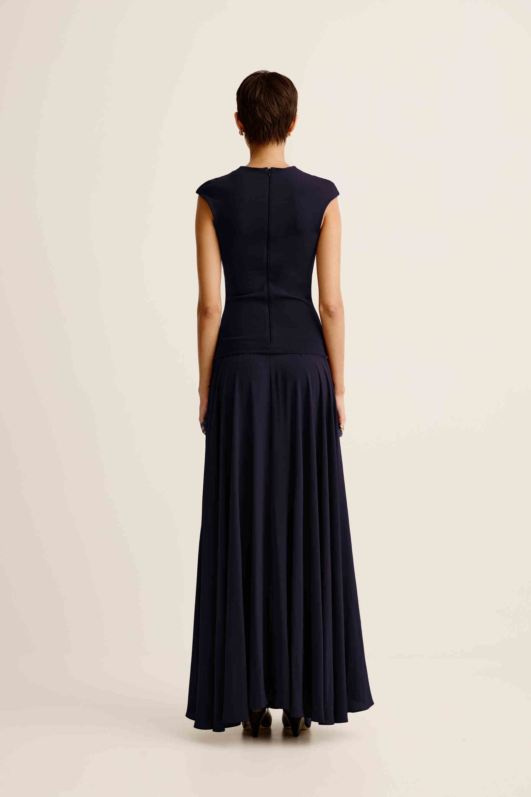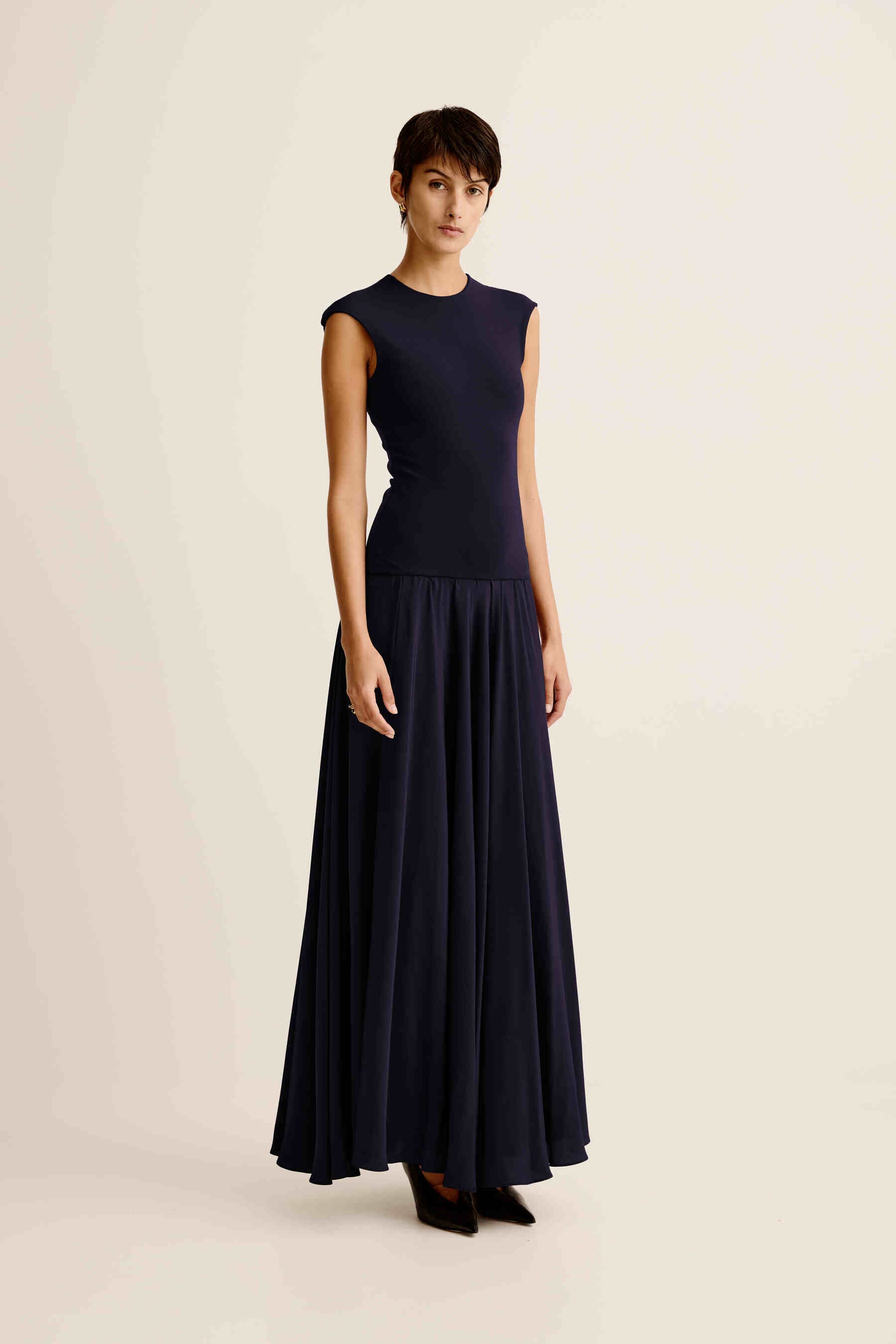ESSE's signature combination dresses have evolved with more luxe, evening styling. An effortless elegant, yet easy occasion piece featuring a stretch knit upper bodice and dramatic full skirt silhouette.