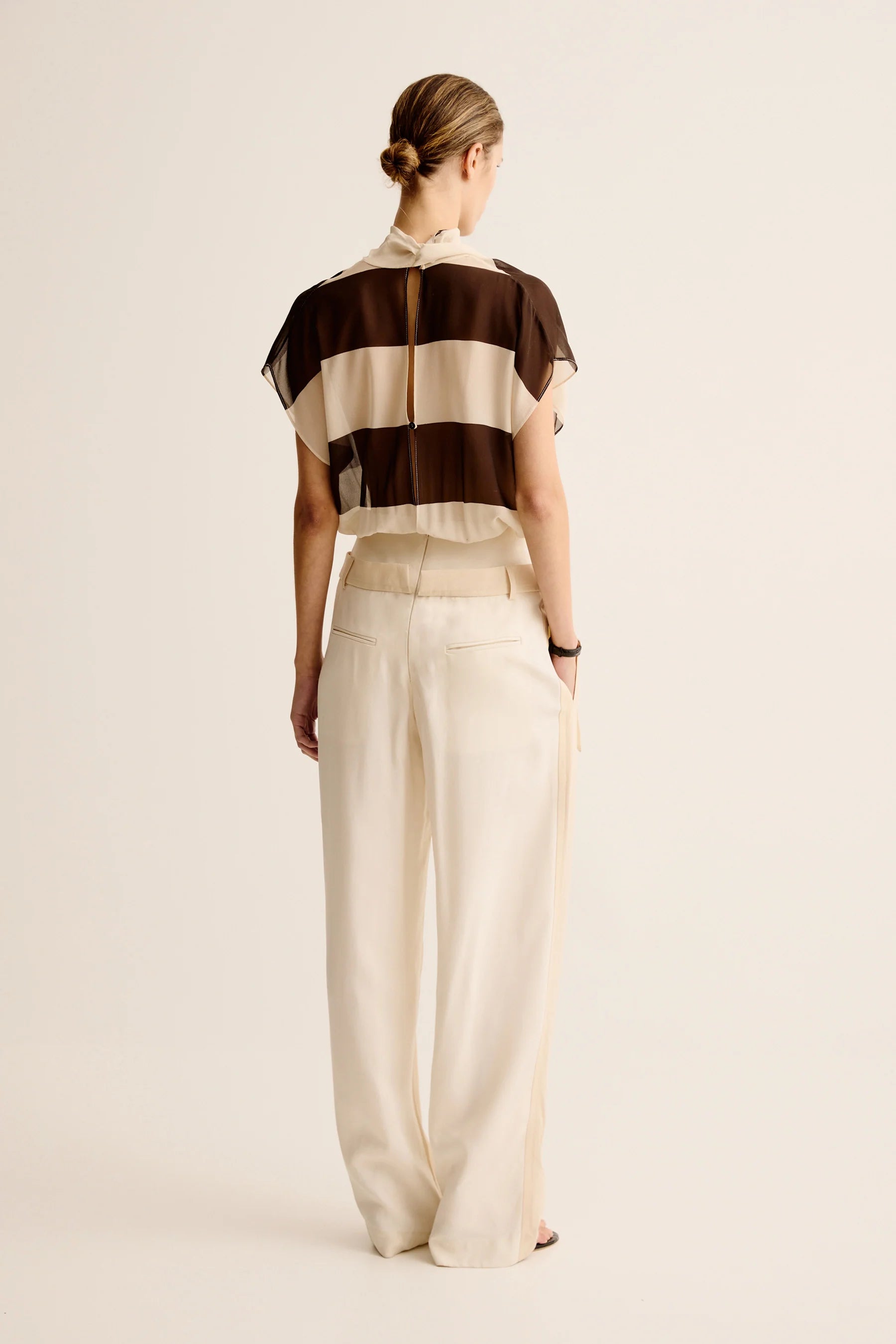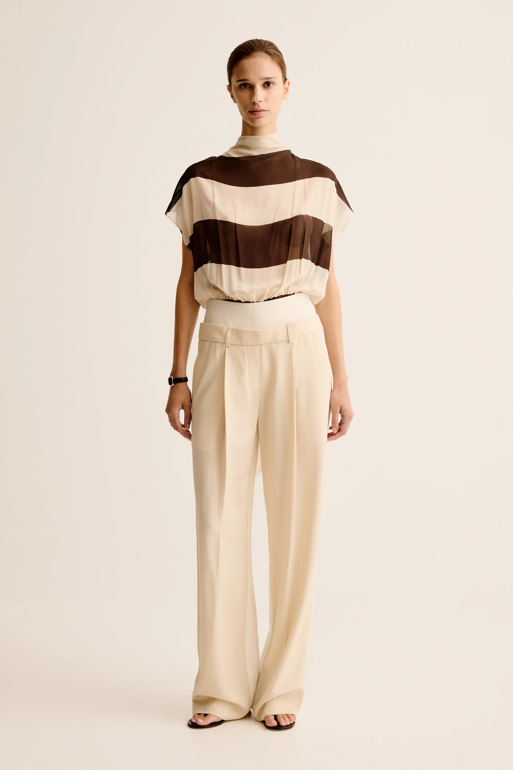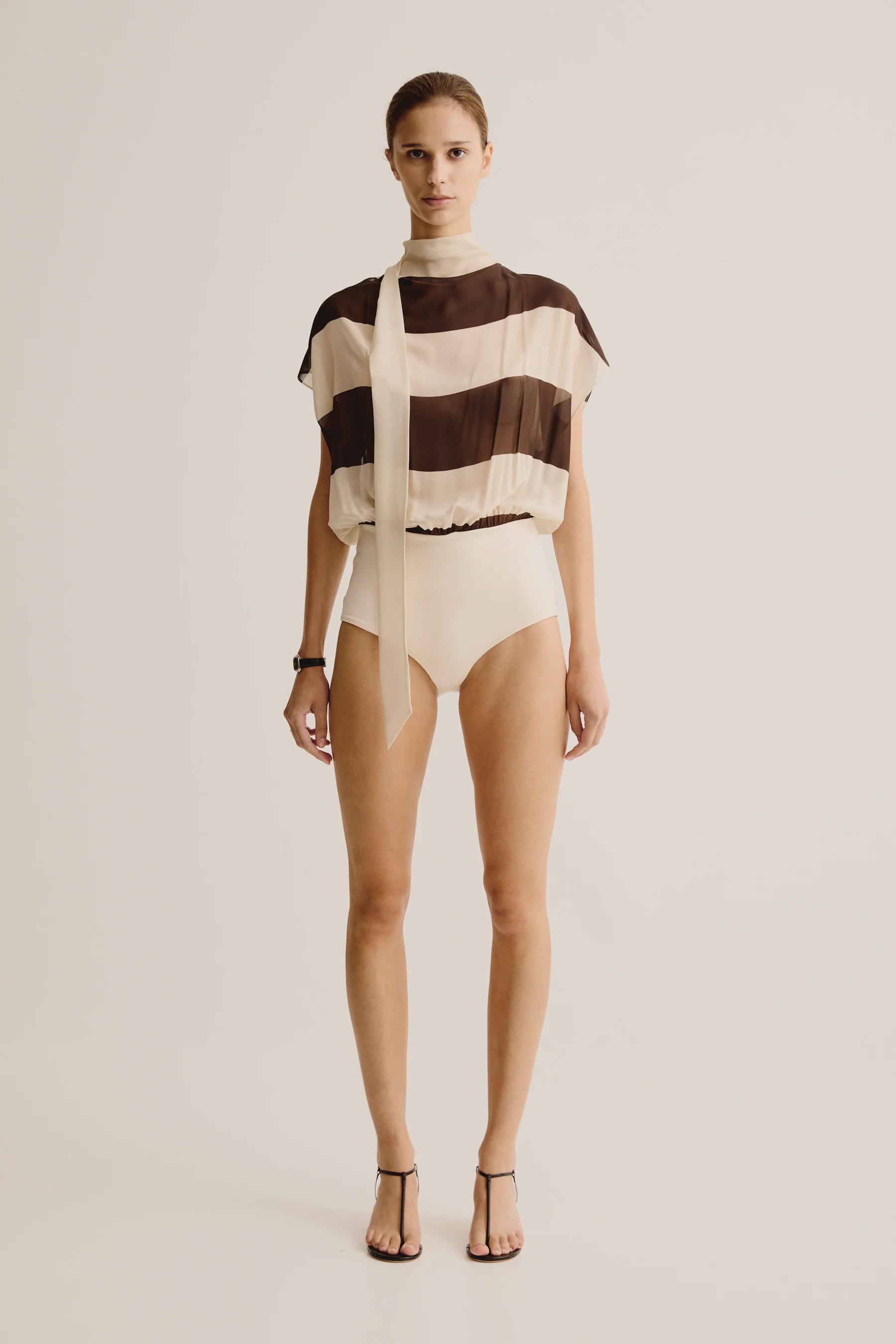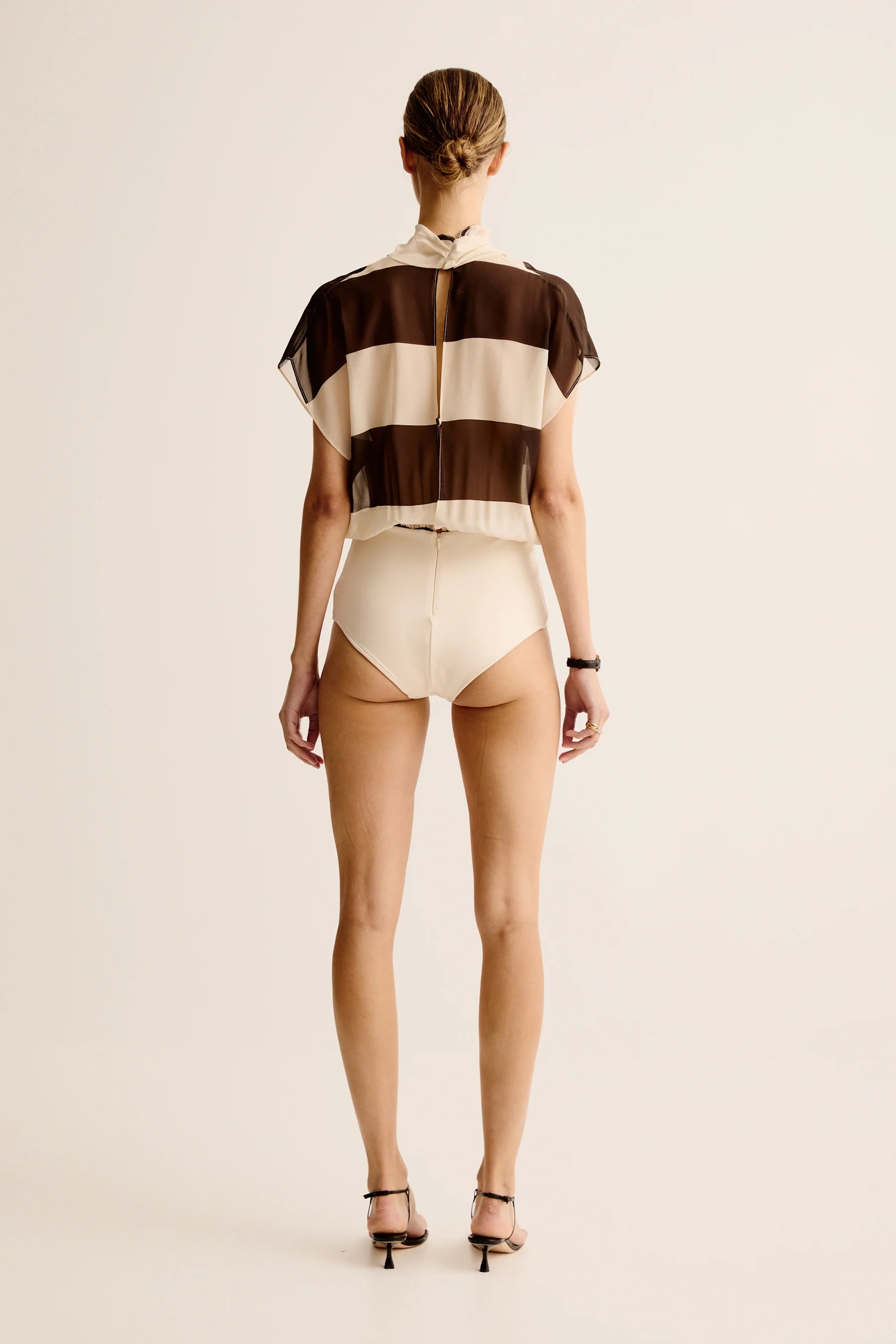 Esse Studios Mono Stripe Bodysuit in Java Stripe. Draped silk bodysuit in bold stripe gathered into body con, high waisted knit briefs.