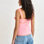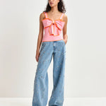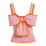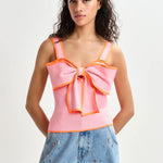 Essentiel Antwerp Haminata Top in Pure Pink. An eye-catching tank top featuring a striking oversized bow at the front. The contrast trim adds a vibrant, playful touch, enhancing the structured design. Finished with wide straps with contrasting trims and a figure-hugging fit for a chic and feminine look.