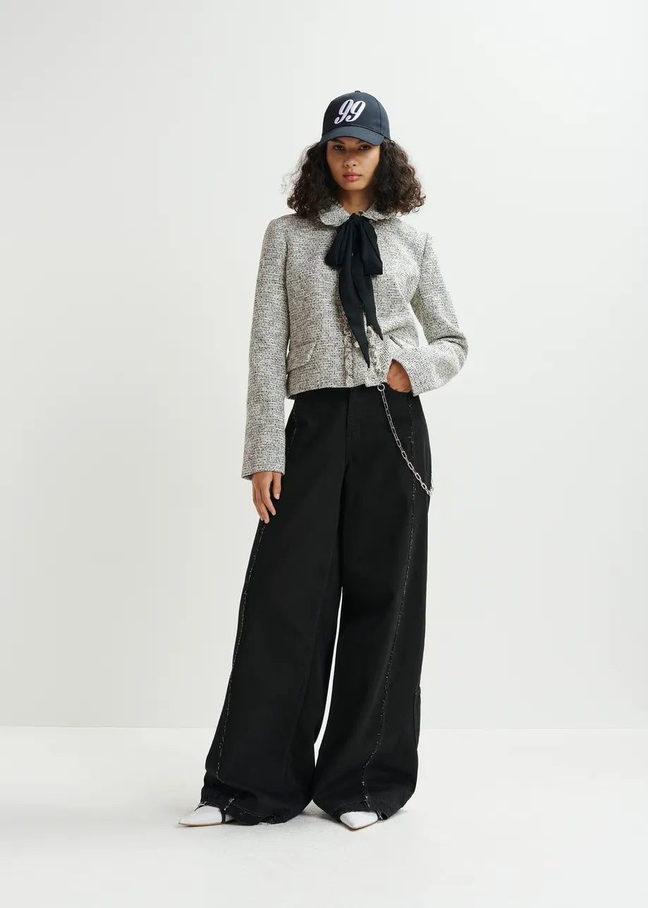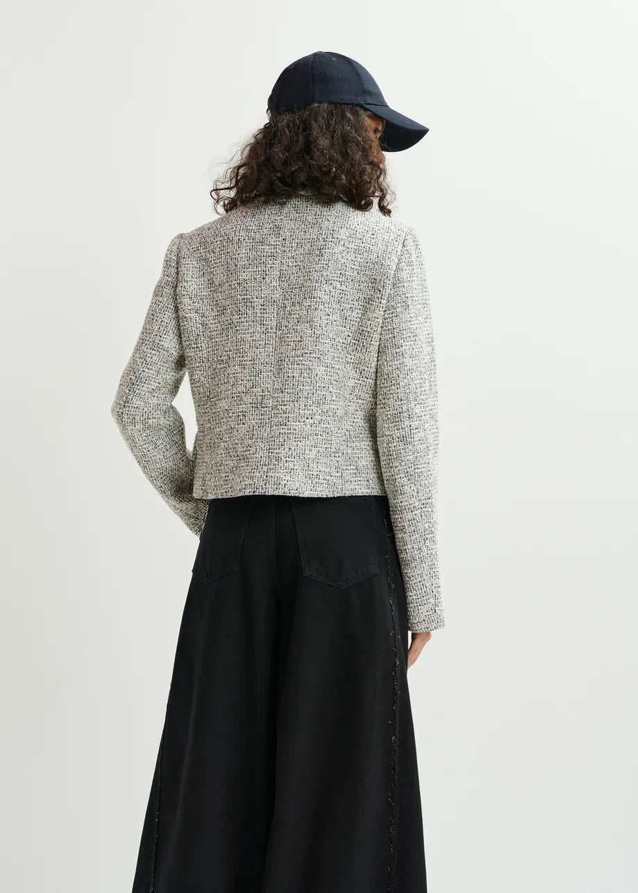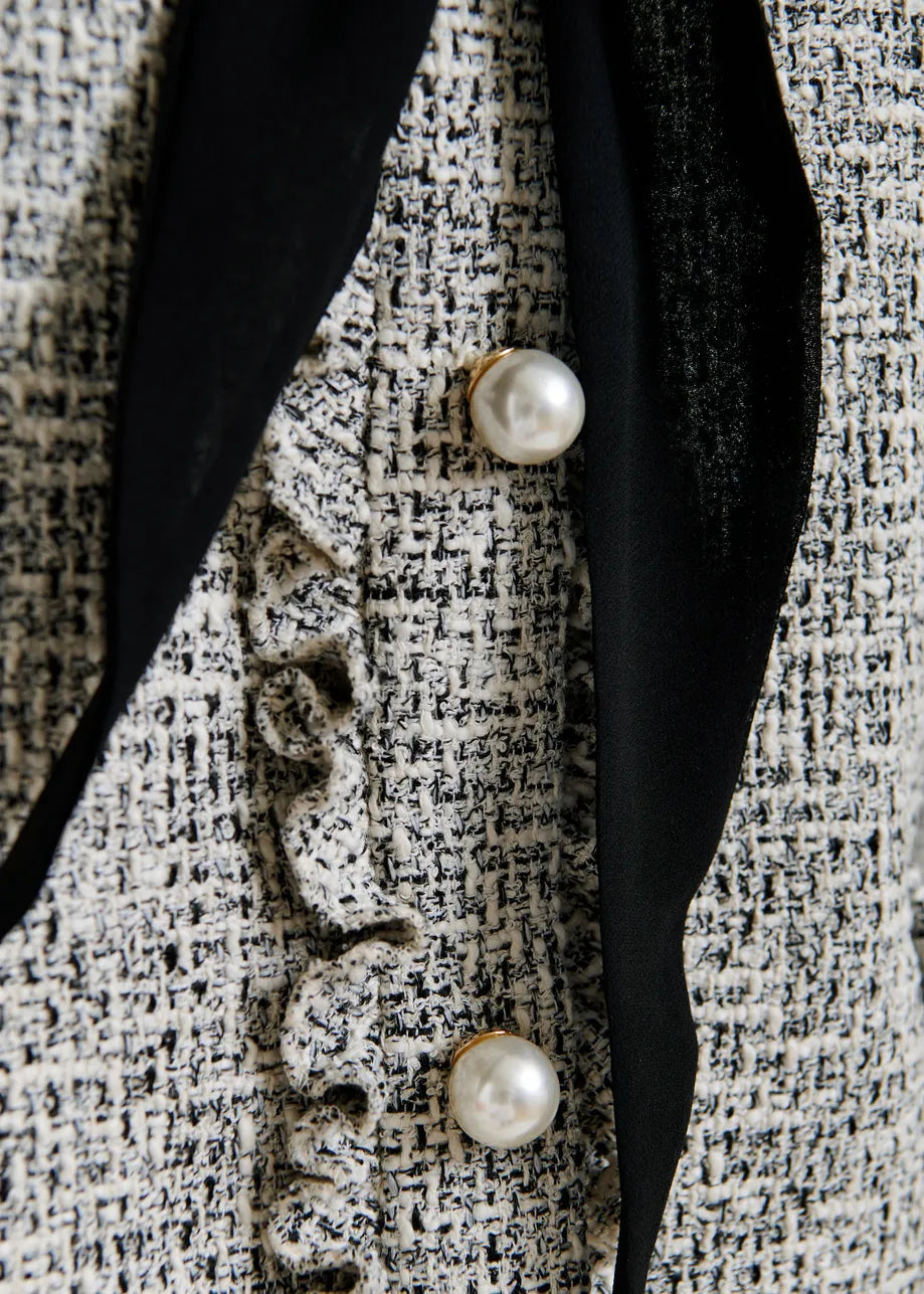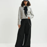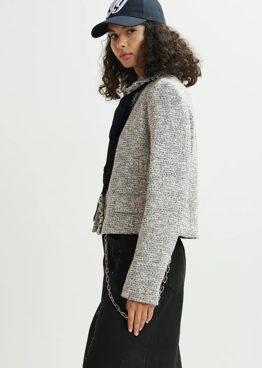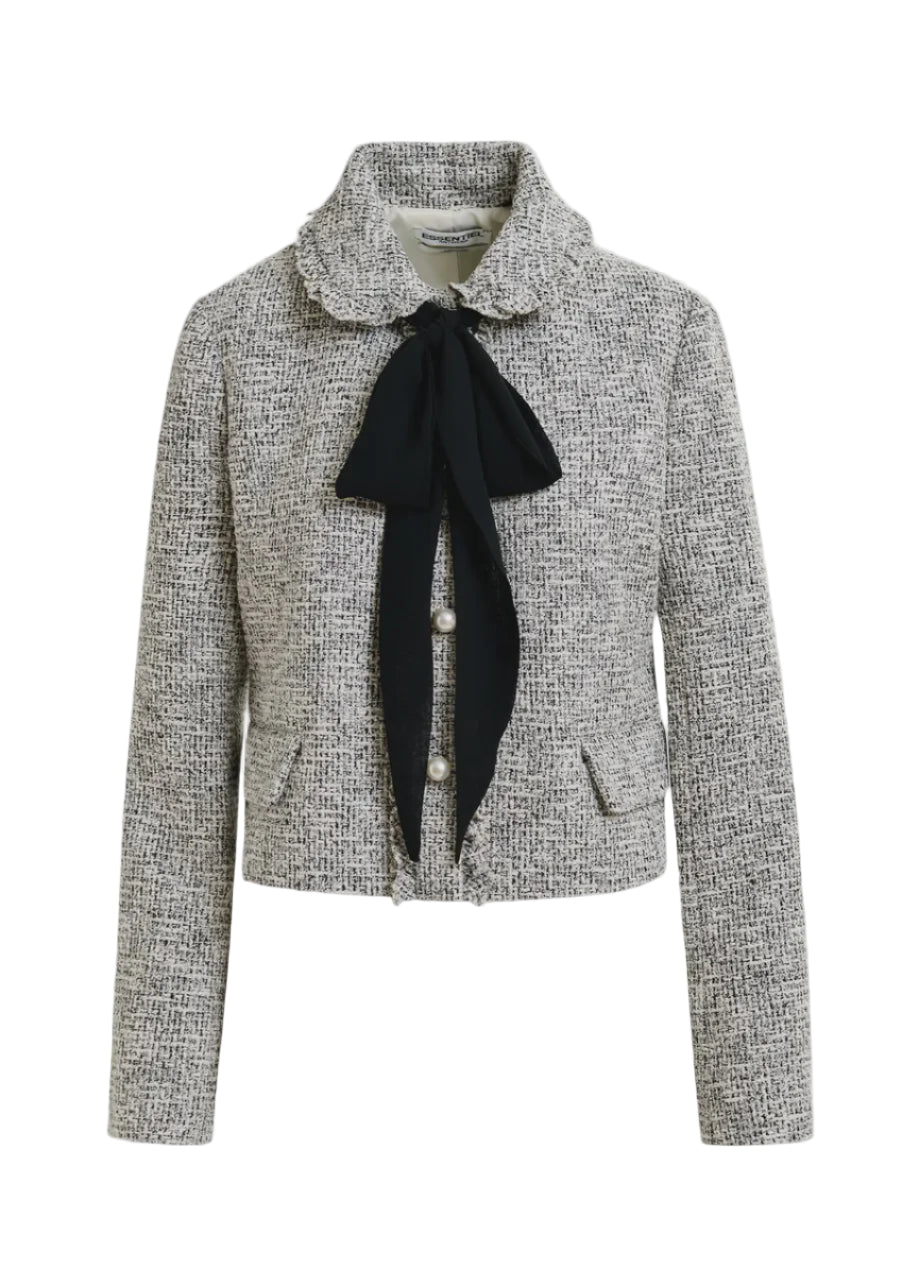 Essentiel Antwerp Hom Jacket in Nimbus Cloud. Fine knit jacket is designed for a close fit. It features a pearl press button fastening for a touch of elegance, along with two flap pockets. The self-tie bow fastening at the collar adds a chic touch, while the ruffled edges enhance the overall design with a delicate, textured finish.