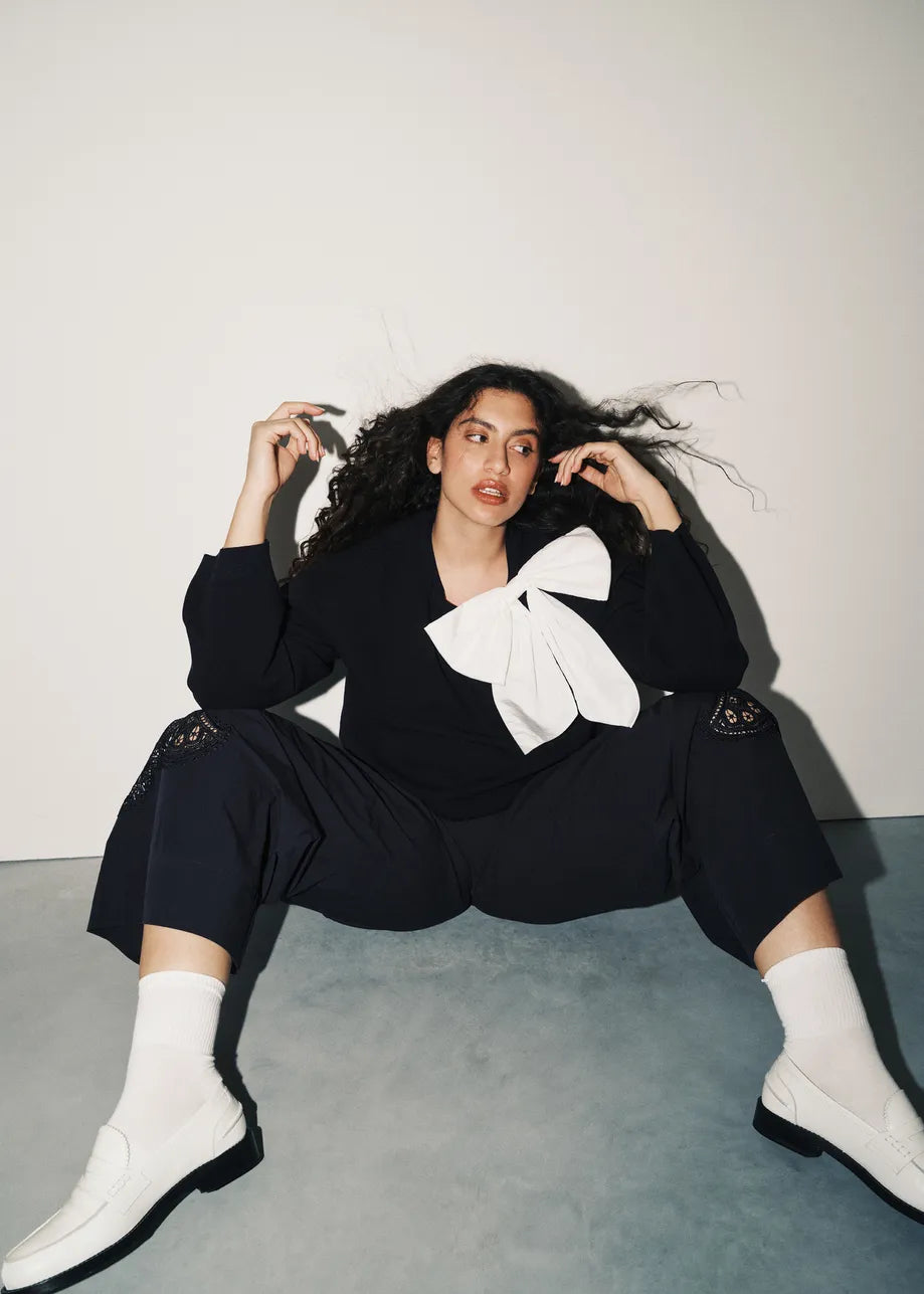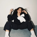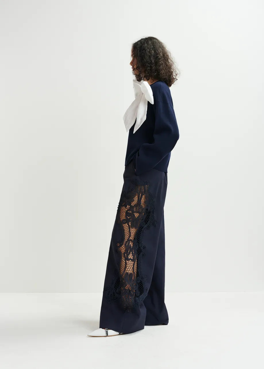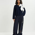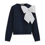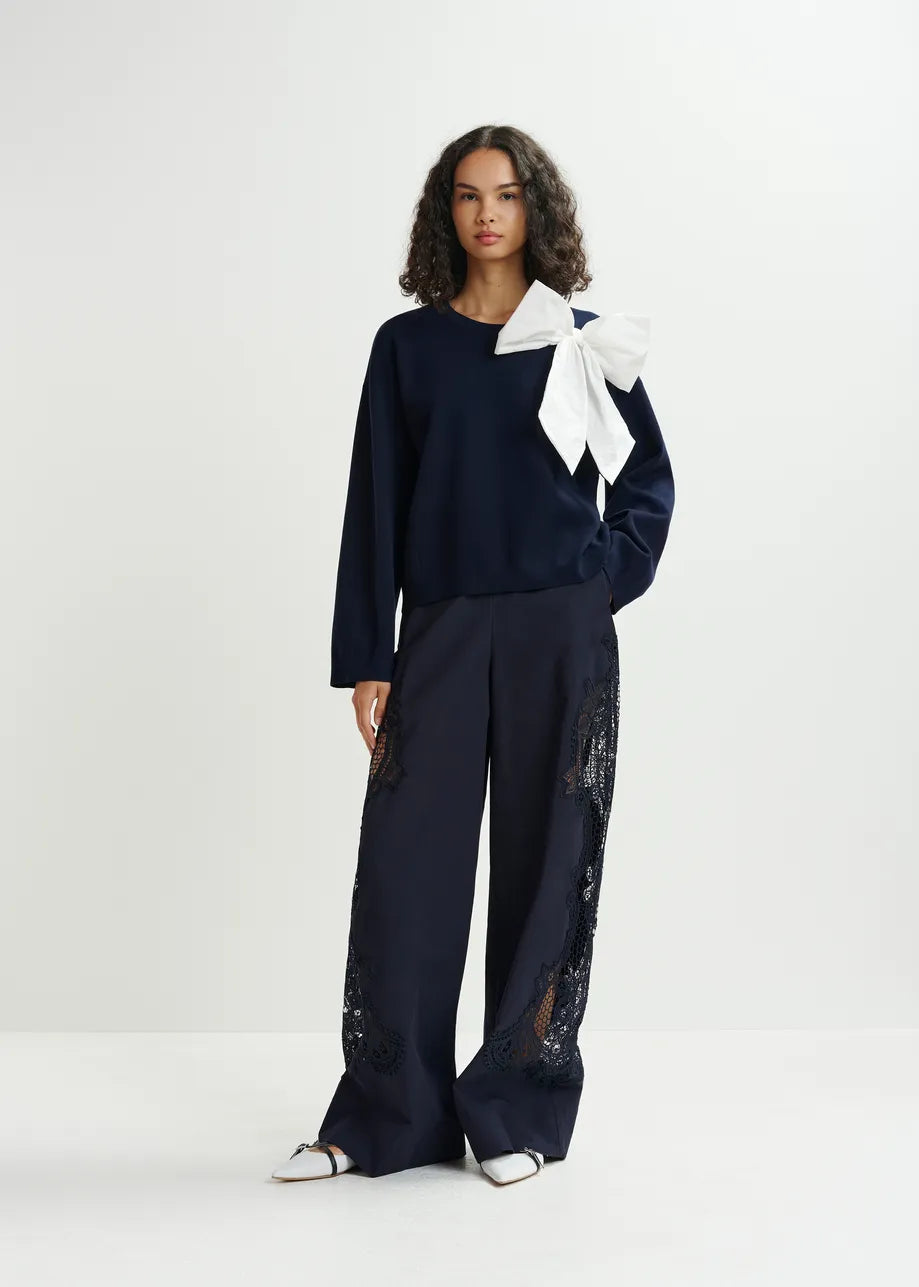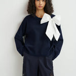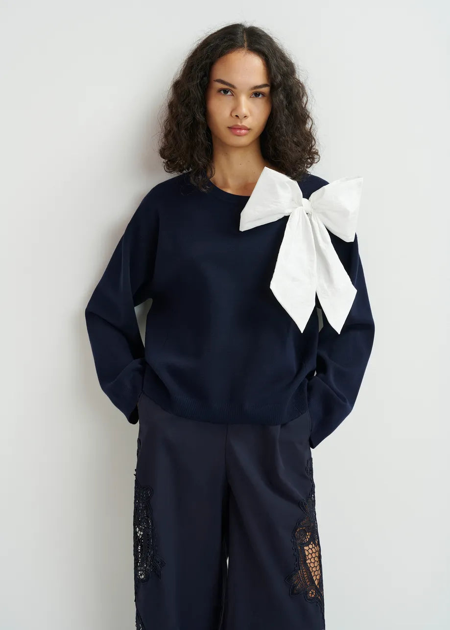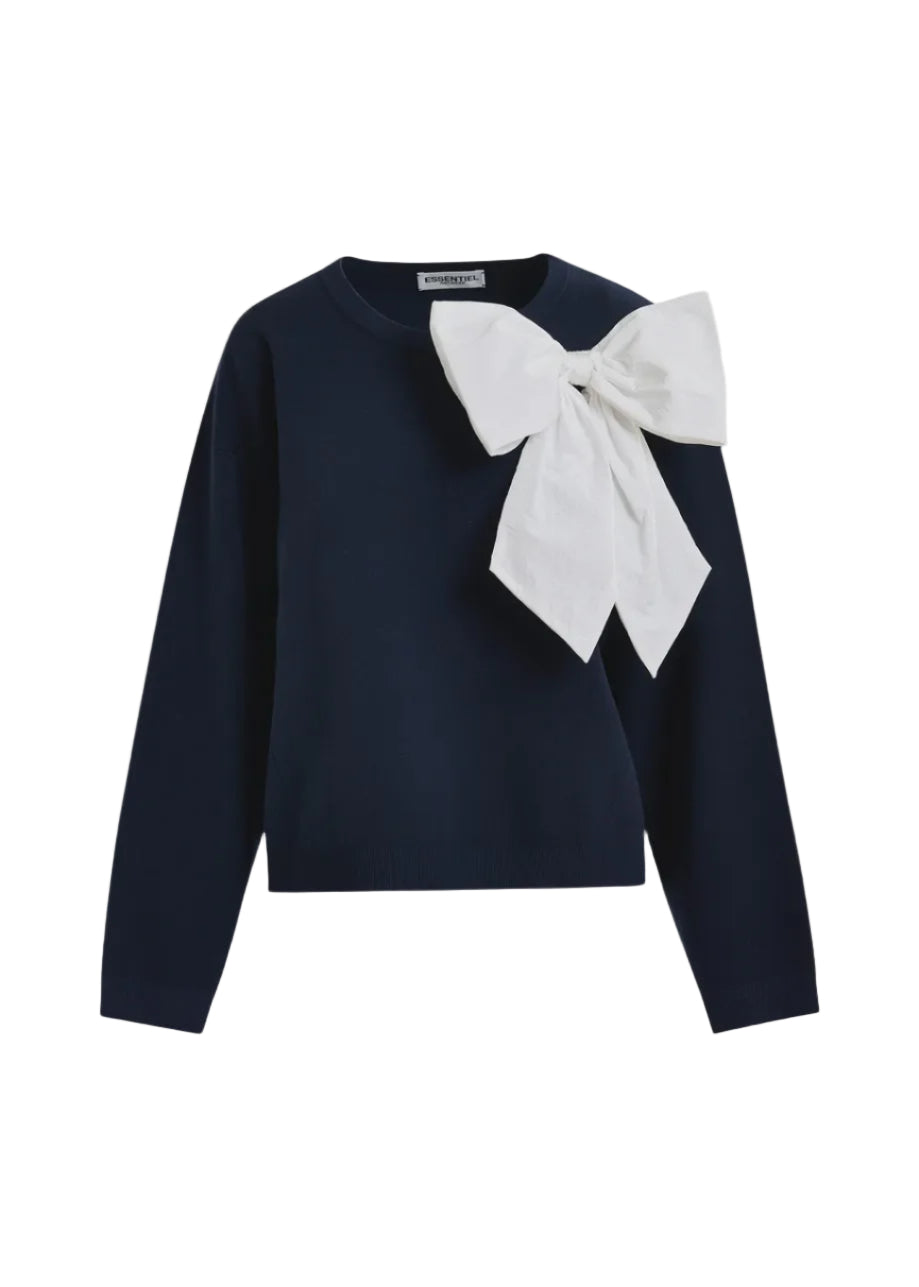Essentiel Antwerp Hoslo Pullover in Dark Sapphire. Fine-knit sweater is designed for a relaxed fit. The removable bow detail, secured with a pin, adds a versatile touch of charm to the front. Finished with ribbed trims, this piece is perfect for effortlessly transitioning between casual and polished looks.