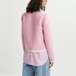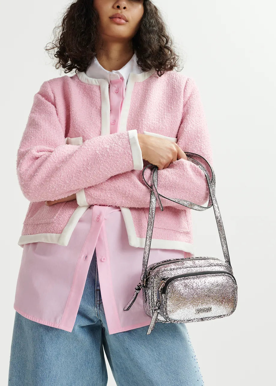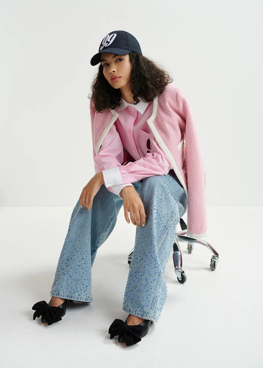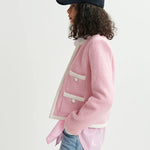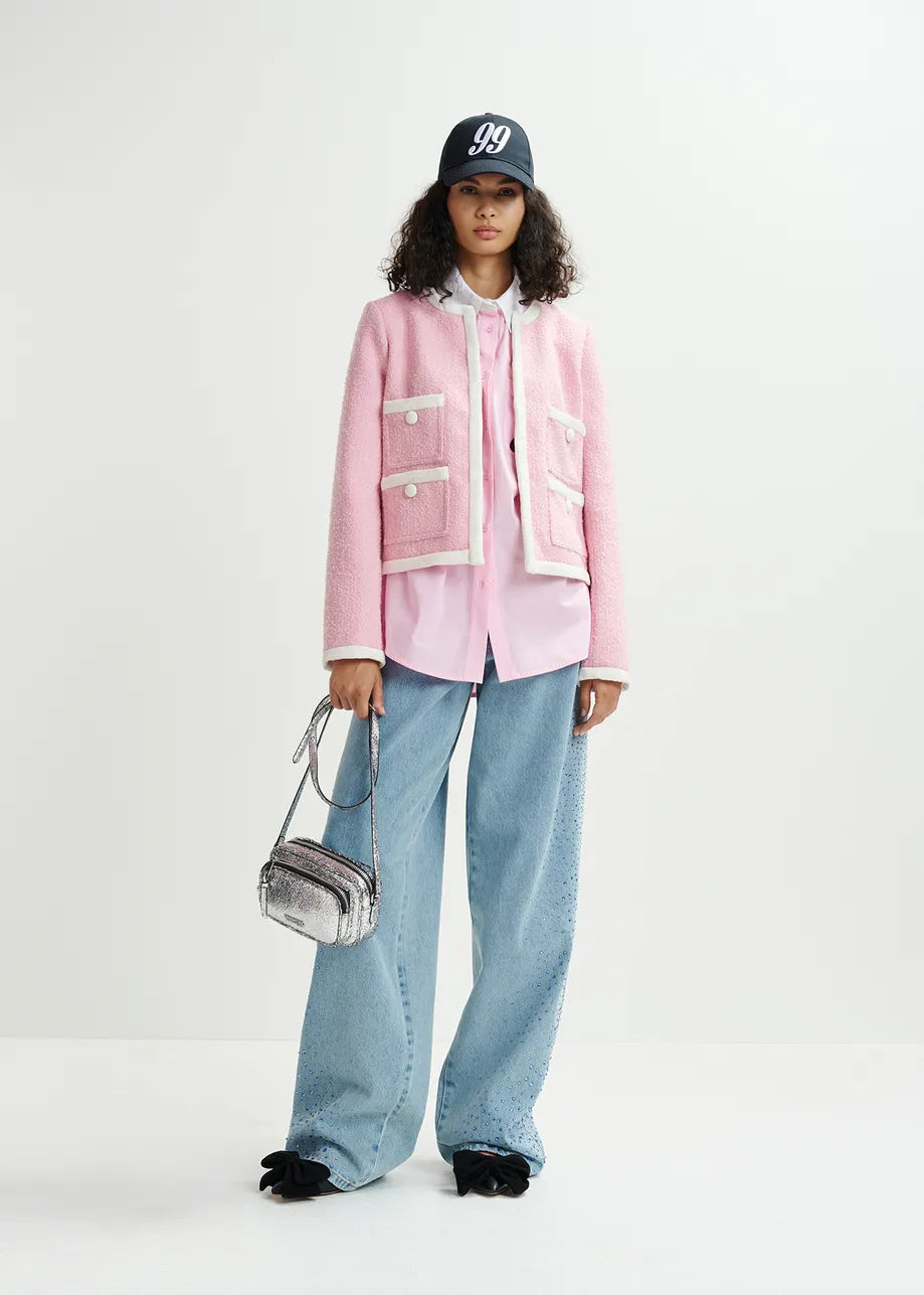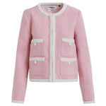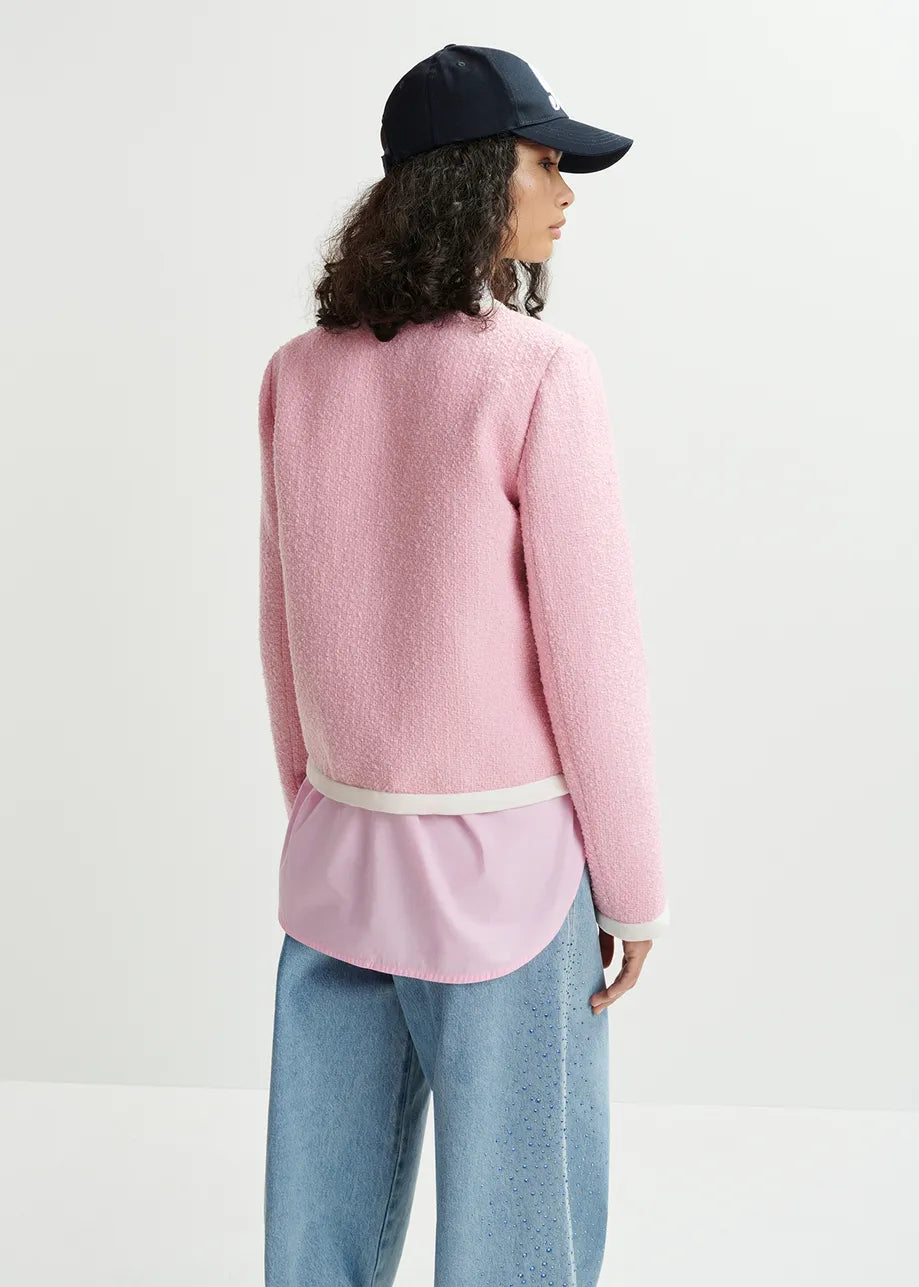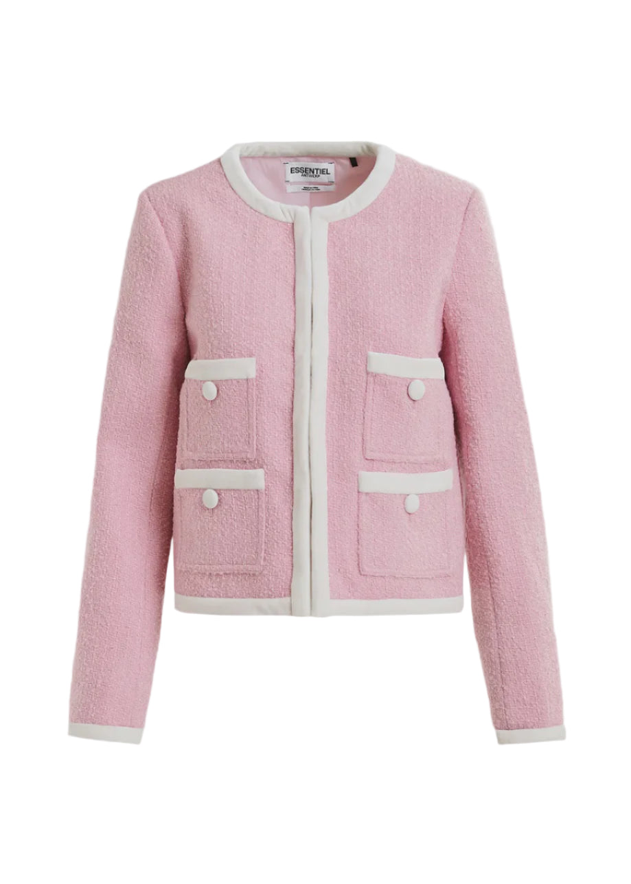 Essentiel Antwerp Howy Jacket in Ballerina. Timeless jacket is crafted from tactile tweed fabric with luxurious velvet accents, designed for an effortlessly relaxed fit. It features a collarless neckline, four patch pockets, and subtly padded shoulders for a refined and sophisticated finish.