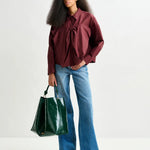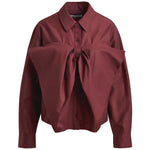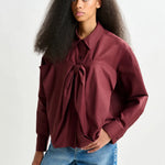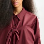 Essentiel Antwerp Ibow Shirt in Margot Mauve. Cotton-blend shirt reimagines classic tailoring with a bold twist. It features a sharp collar and button fastening through the front. The defining detail is a dramatic self-fabric bow at the chest, adding playful elegance.