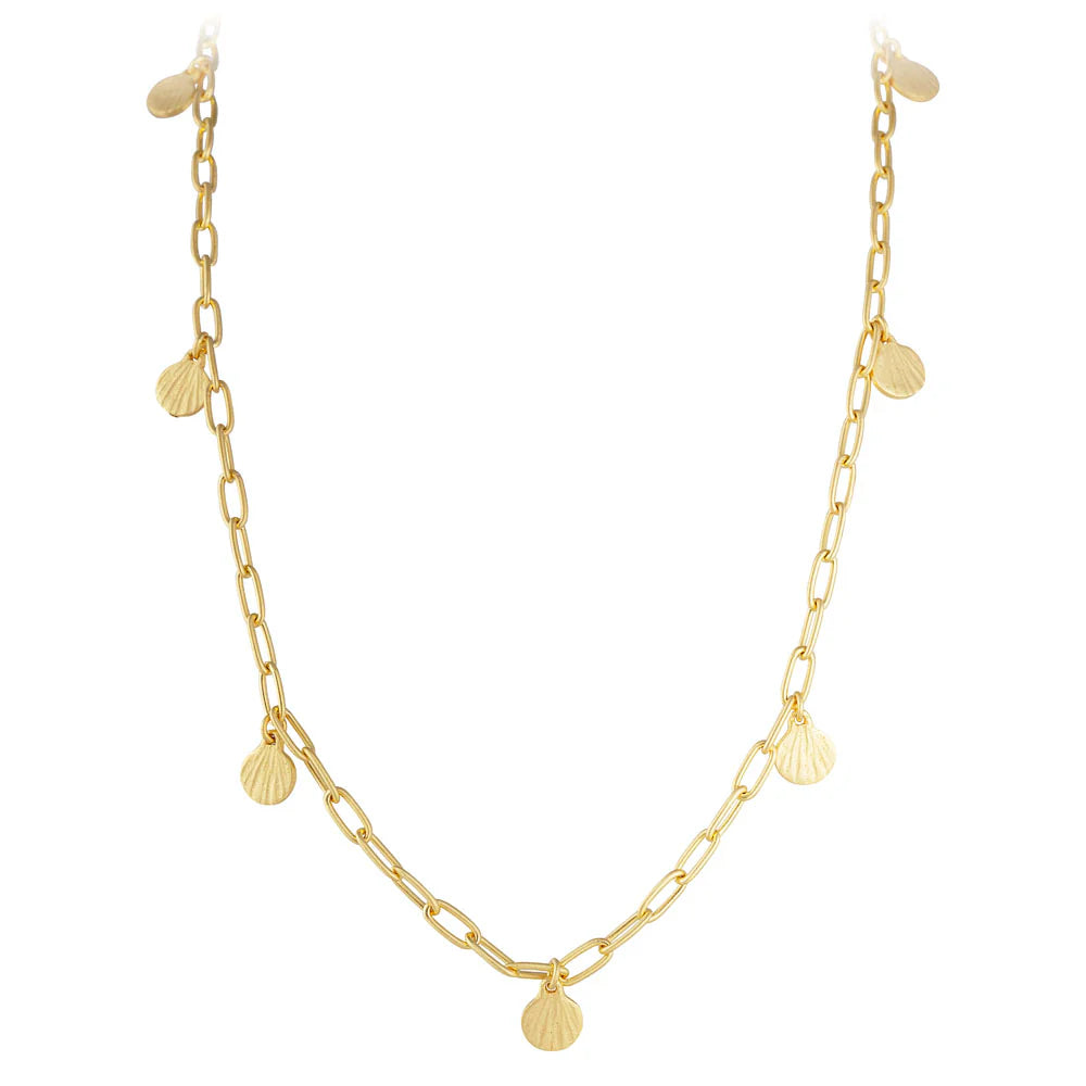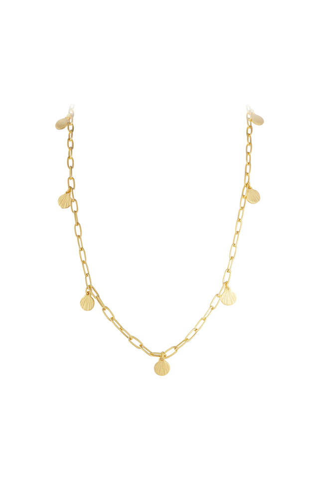 Fairley Golden Beachcomber Charm Necklace. Capture the essence of coastal charm with the Golden Beachcomber Charm Necklace. Crafted from lustrous sterling silver and plated in 18k gold, this delicate piece features 9 beachcomber-inspired charms that adds a touch of seaside elegance to any outfit. Perfect for those who cherish the tranquility of ocean breezes and sandy shores, this necklace effortlessly blends timeless style with a laid-back, beachy vibe.
