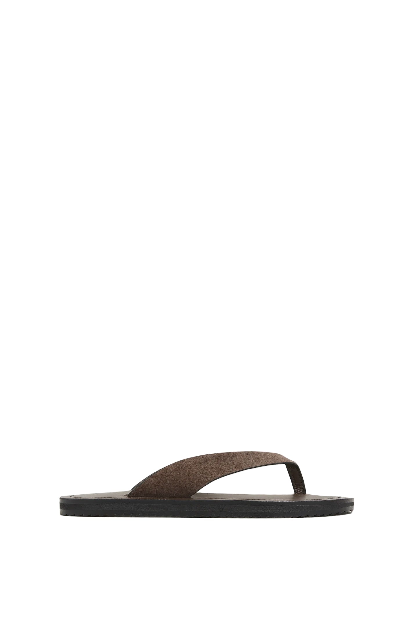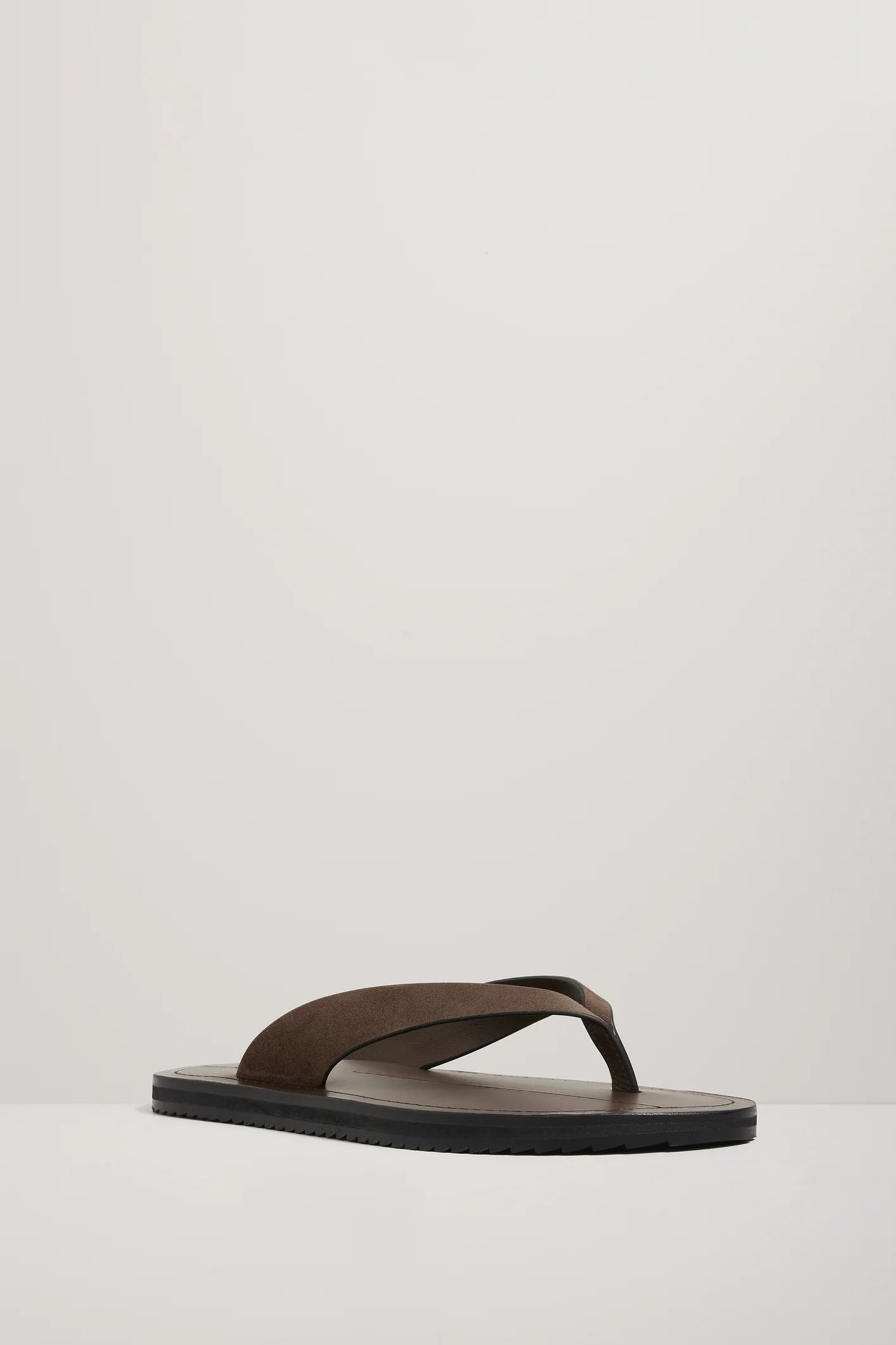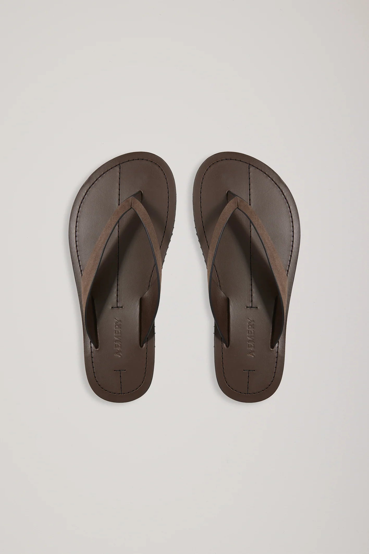 A Emery Flora Sandal in Cedar Suede. The Flora sandal is a contemporary flip flop with leather straps that sit atop a generous leather footbed with contrast stitching and a rubber tread sole.