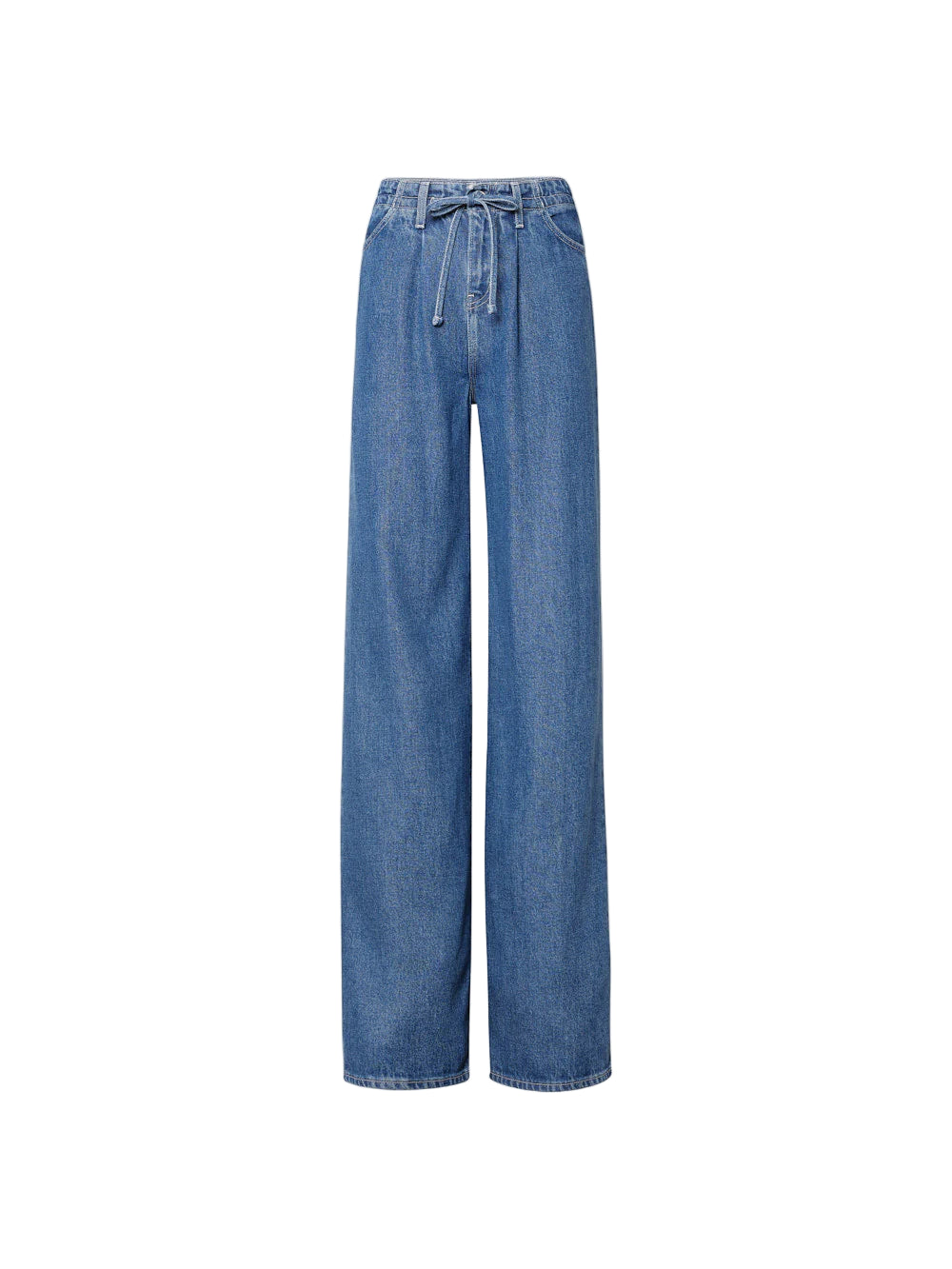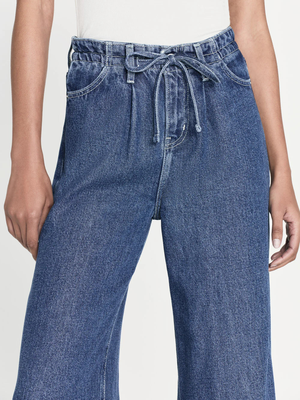 This lightweight wide-leg jean features a drawstring waistband and subtle darts for a cinched in waist. Crafted from a vintage-inspired medium wash denim with contrast stitching that drapes beautifully for a flattering fit.