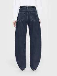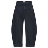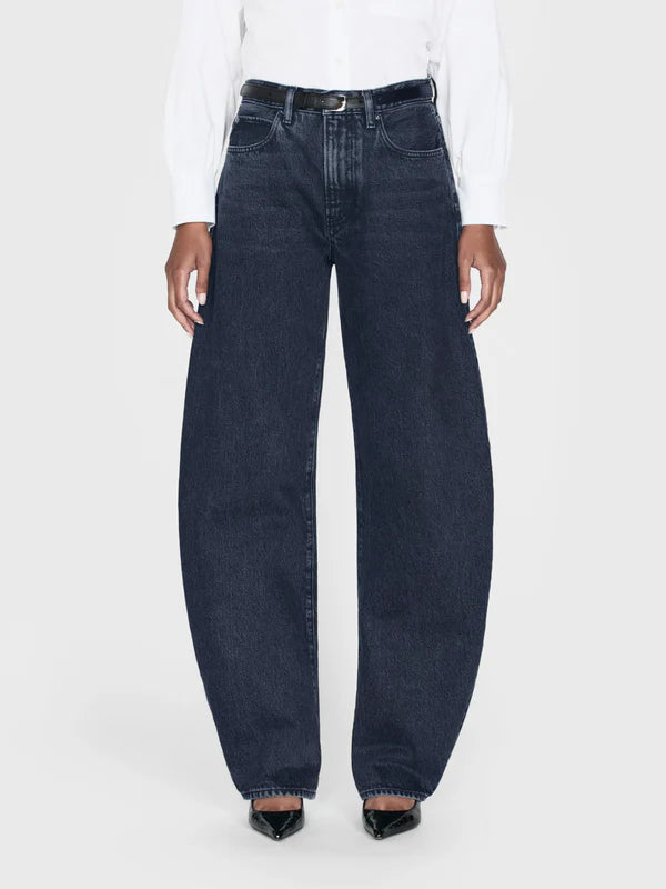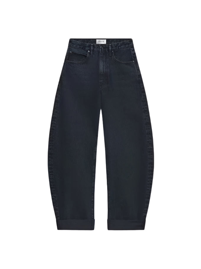 Frame The Bubble in Dorado. An exaggerated take on the trending barrel silhouette, this unique fit is your new closet necessity. With a flattering high rise, these jeans feature a curved outseam for a playful bubble effect. Designed to be worn cuffed and hit at the ankle, the 2.5" twice-rolled cuff can be unrolled for a longer, more dramatic inseam.