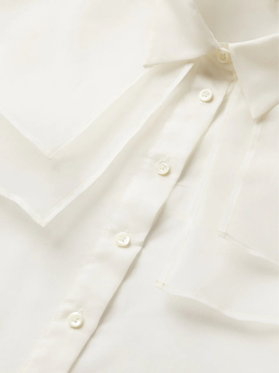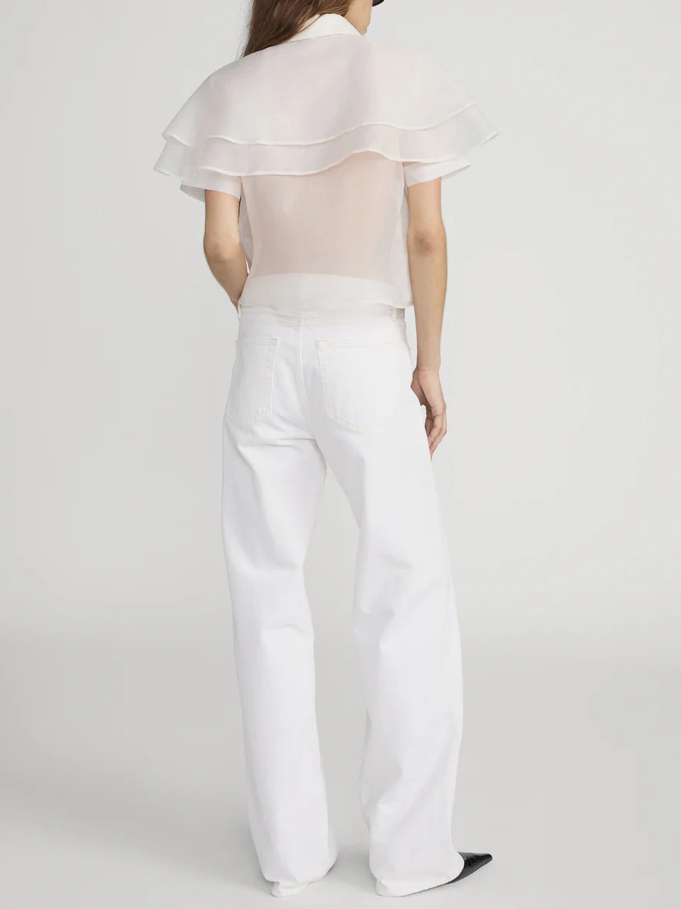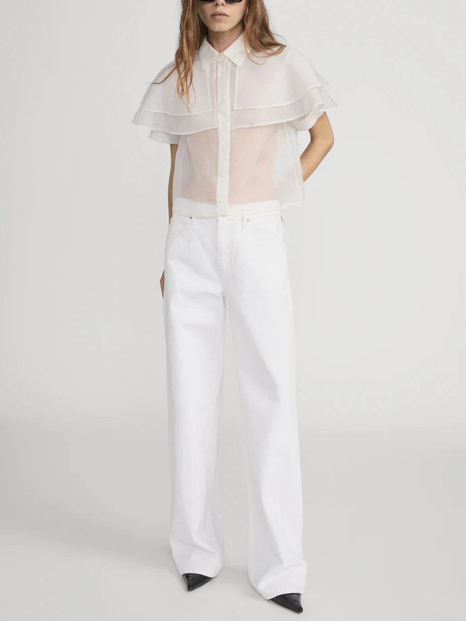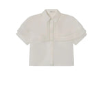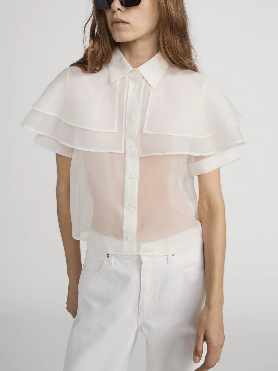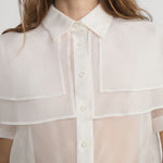 Frame The Organza Cape Top in Cream. The Organza Cape Top is crafted from sheer 100% silk organza, featuring a layered cape detail over a short-sleeve silhouette for a light, elegant shape.