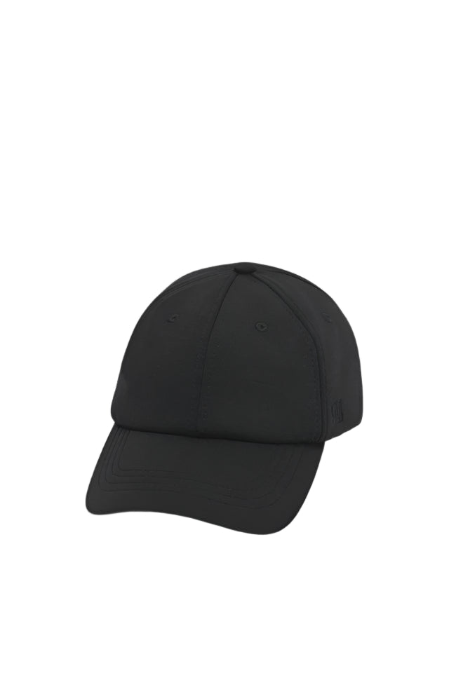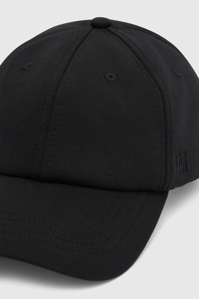Camilla and Marc Amira Cap in Black. The Amira Cap features a soft, relaxed silhouette crafted from neoprene twill for a contemporary finish. An embroidered monogram logo sits subtly on the side, adding a refined touch. The adjustable tab at the back ensures a comfortable fit, complemented by sleek metal slider hardware.