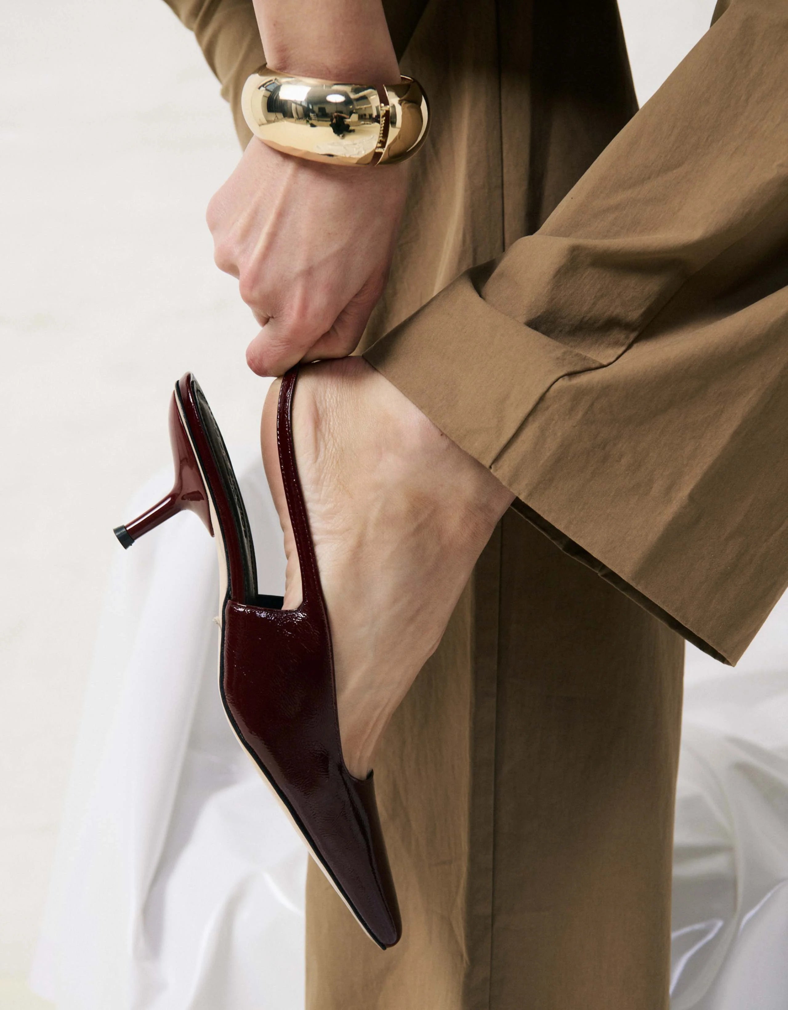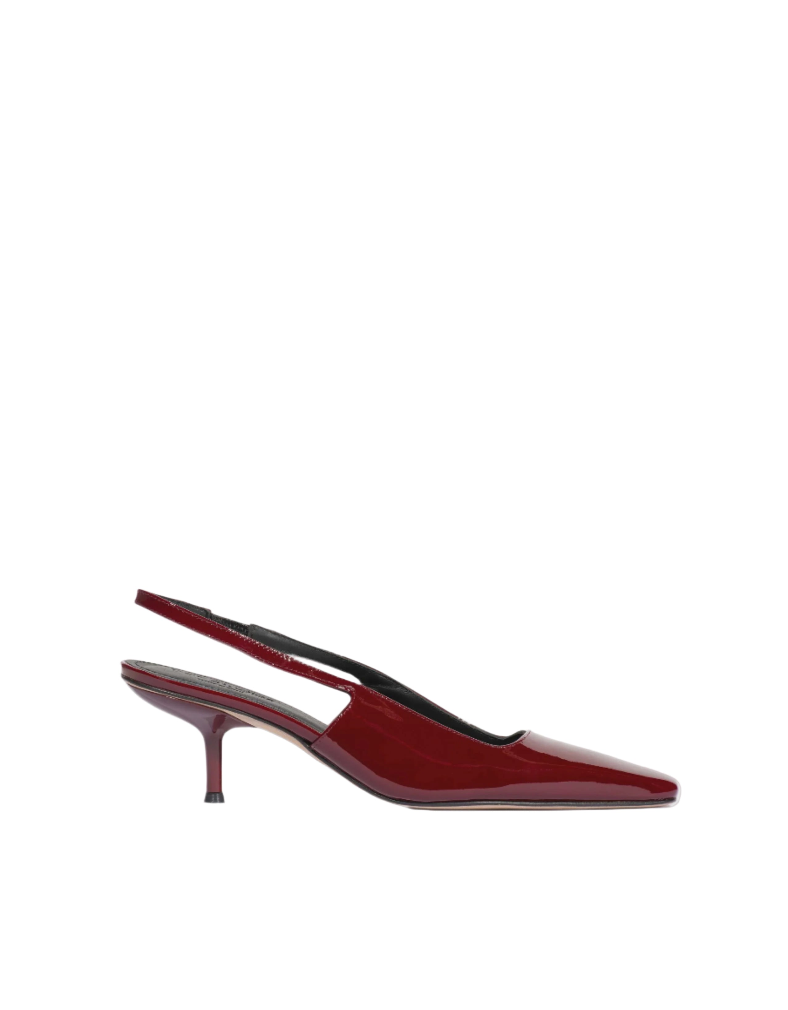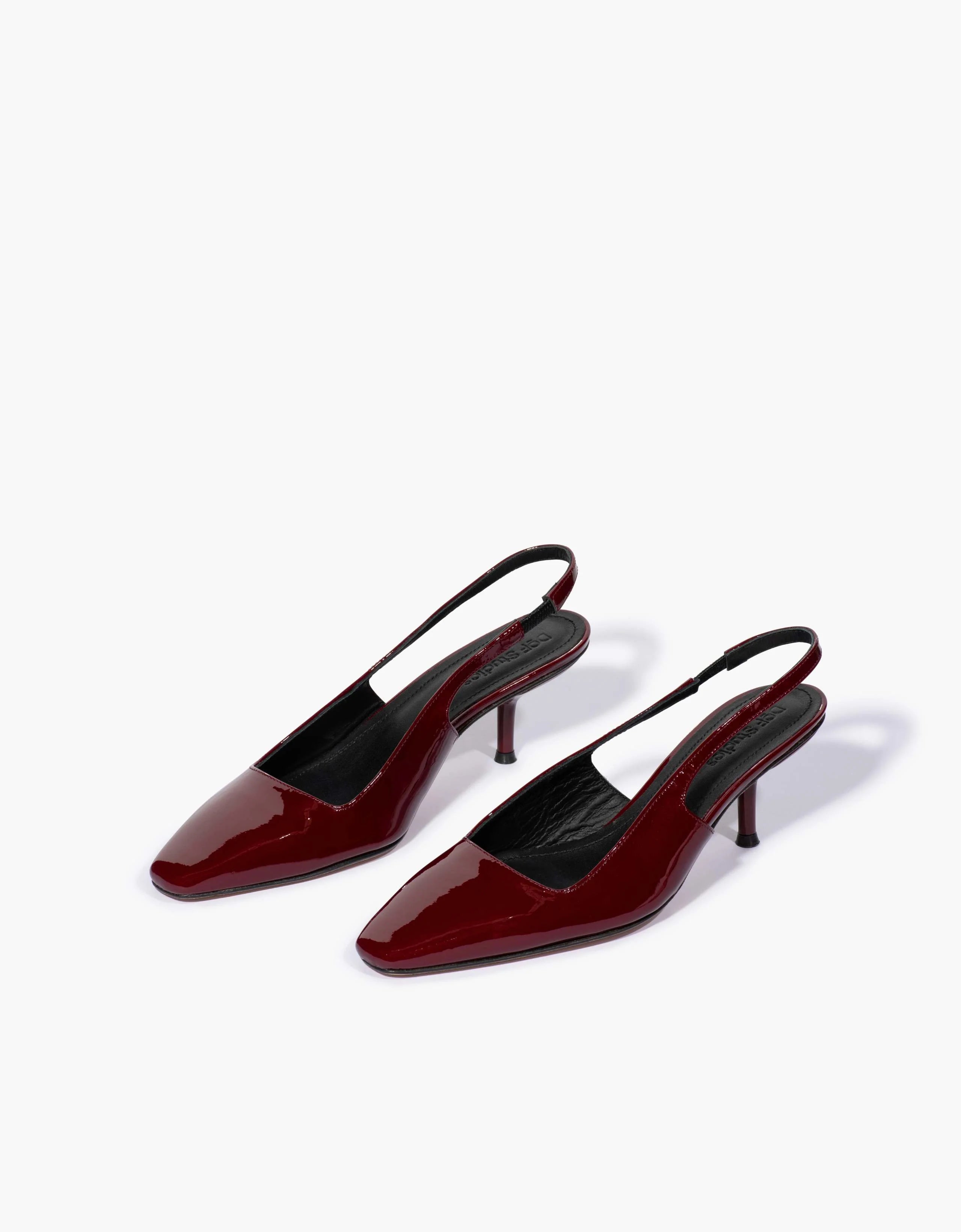 DOF Studios Cecilia Slingback in Mulberry Patent. The Cecilia pumps are a fun addition to any wardrobe classic. Boasting a high-gloss mulberry and sleek slingback silhouette, Cecilia is poised on a mid-heel to instantly elongate and flatter any outfit.