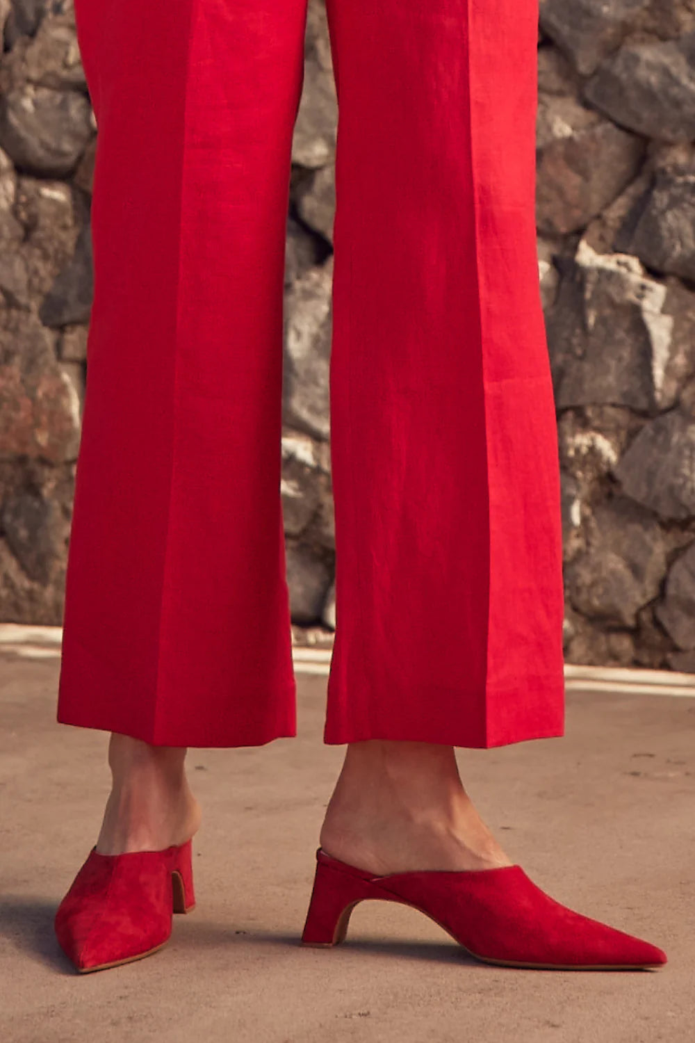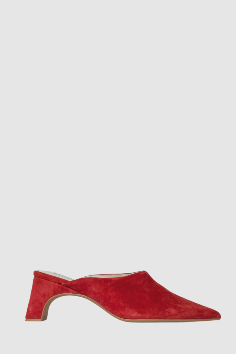 Zoe Kratzmann Mode Mule in Crimson. Perfect for pairing with tailored trousers or midi skirts, the Mode Mule brings a fresh and artistic edge to any outfit, ensuring you stand out in style.