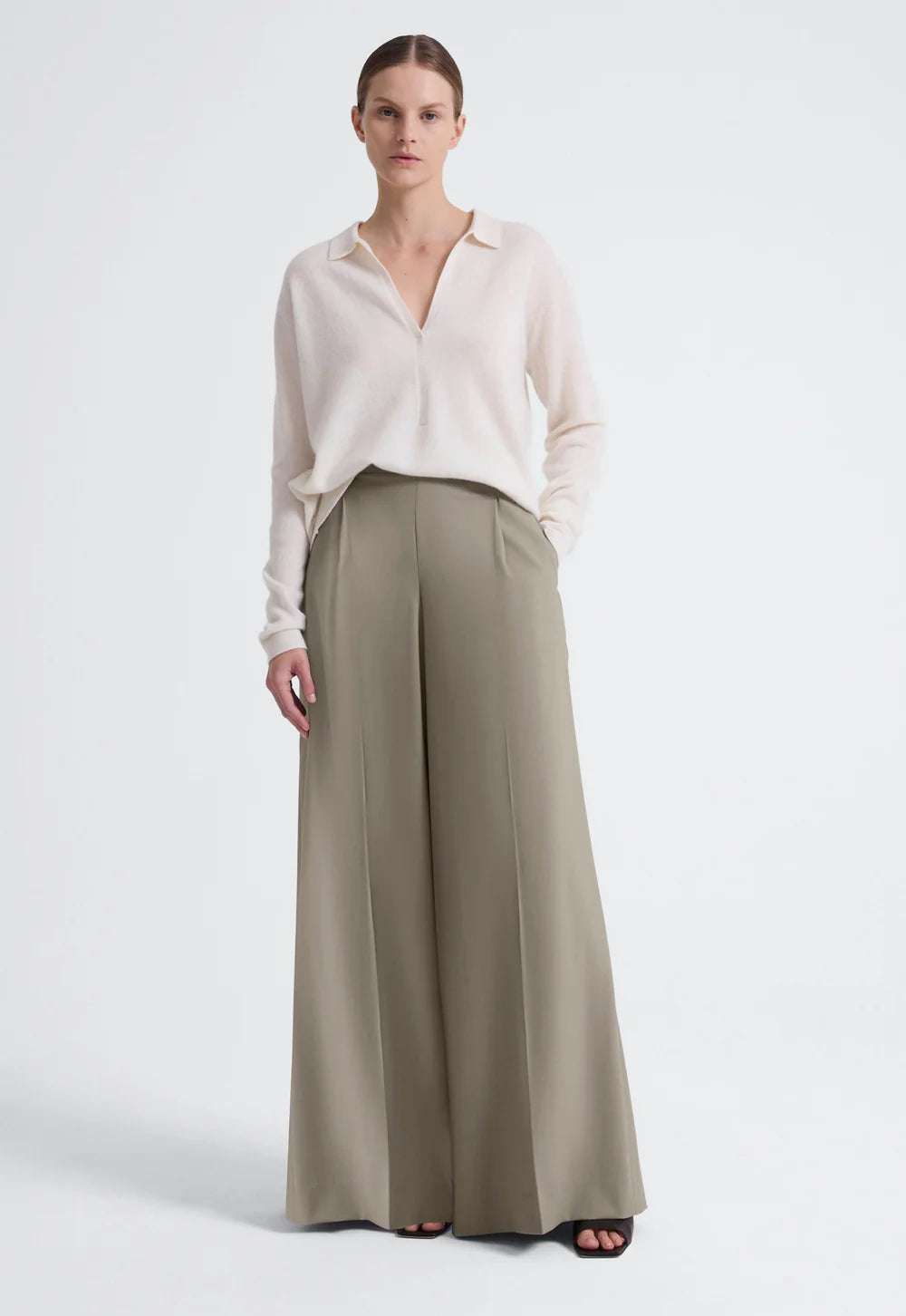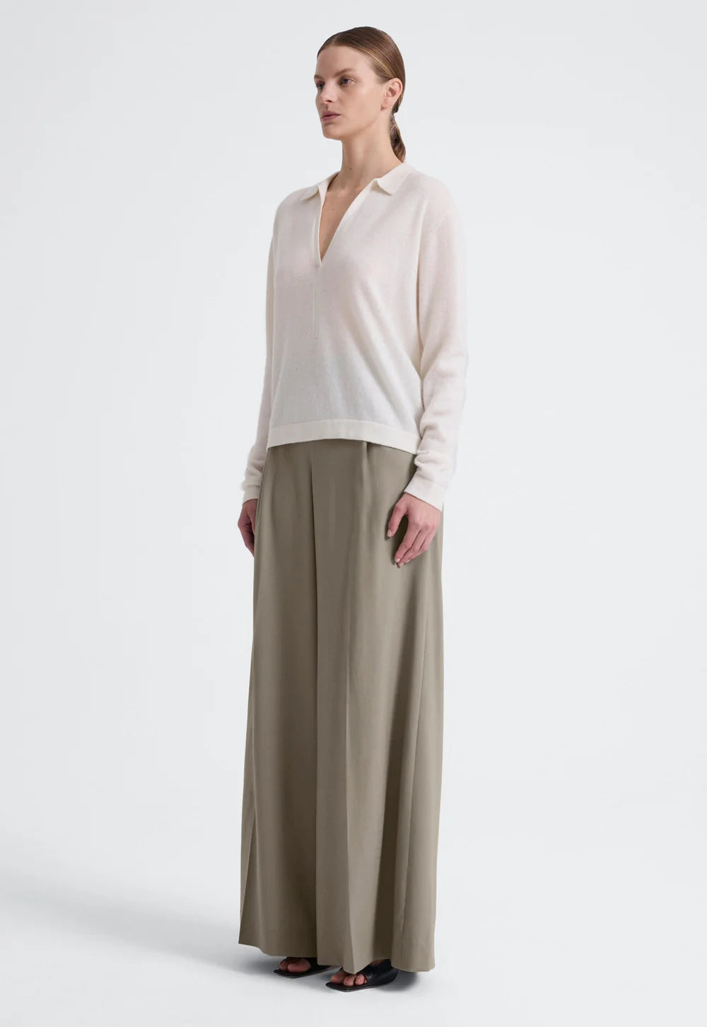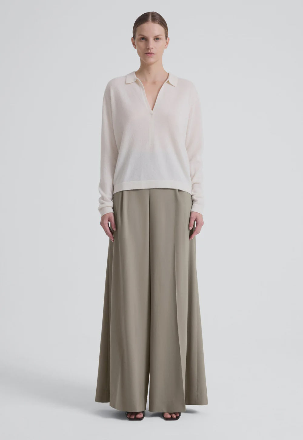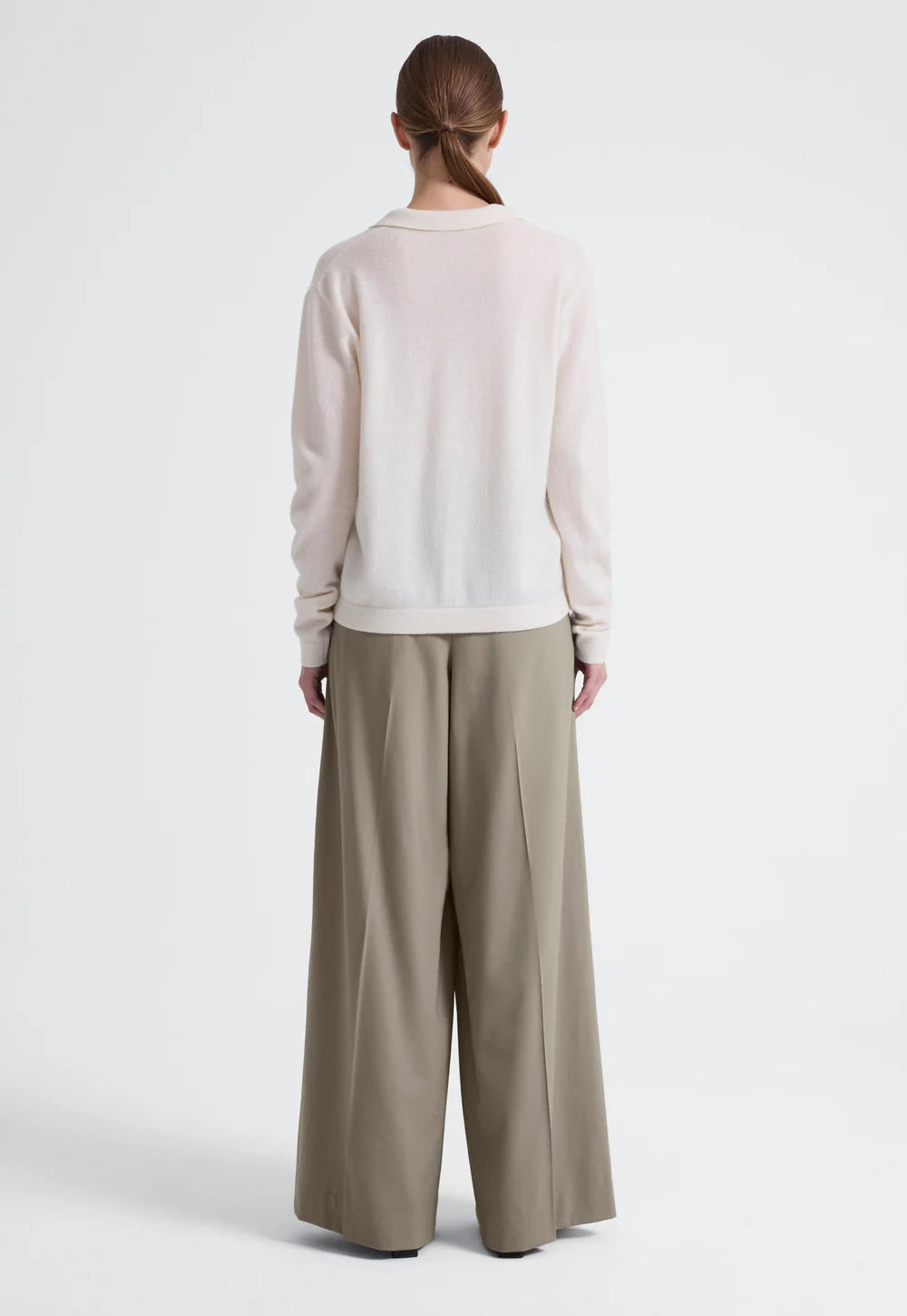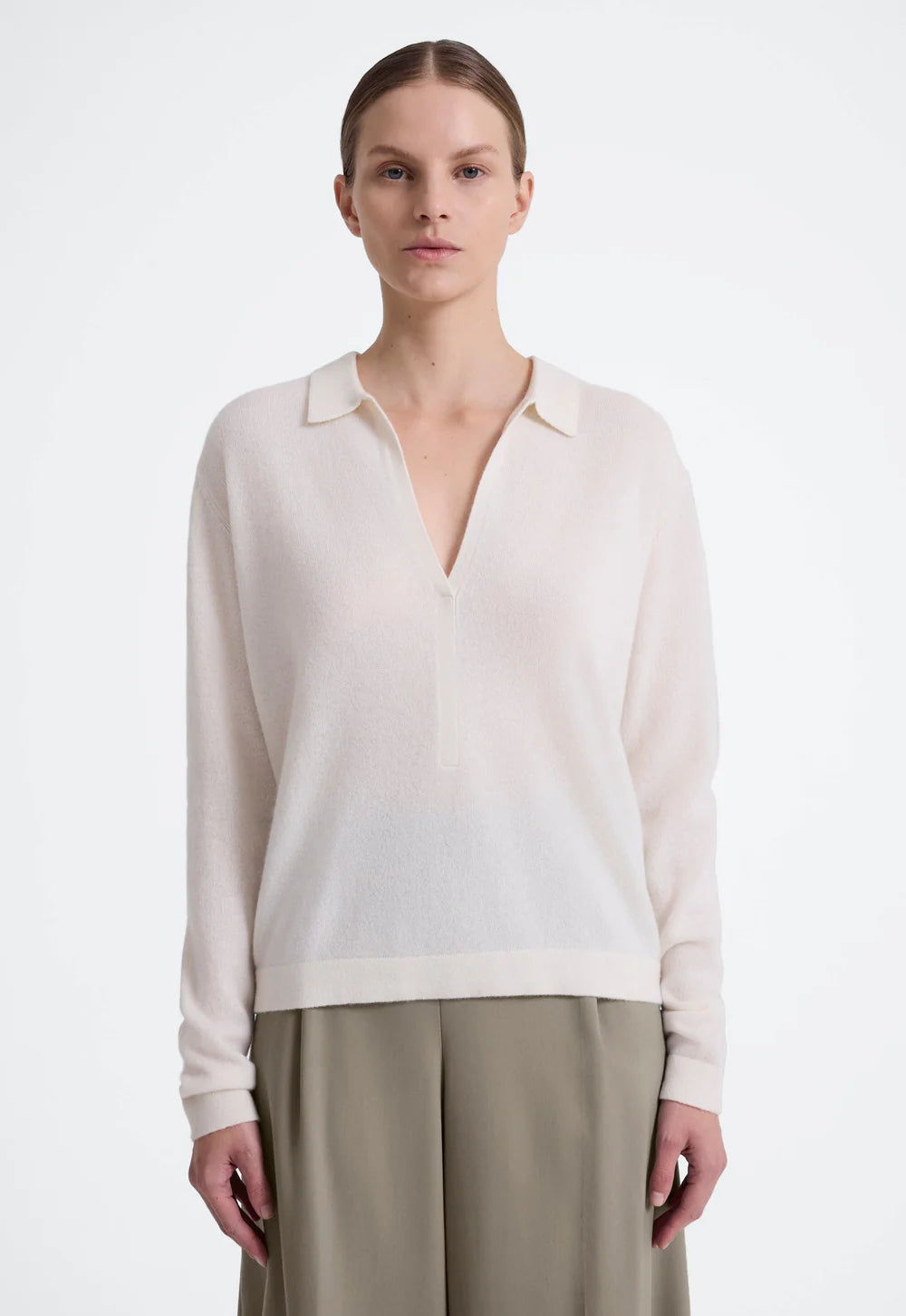 Jac and Jack Jeff Polo in Pillo. Cashmere has never felt cooler. This long sleeve polo sweater features a plunging V-neckline with a folded collar and subtle front stitching detail. Spun from the softest cashmere, it has a supple hand-feel and relaxed easy drape.