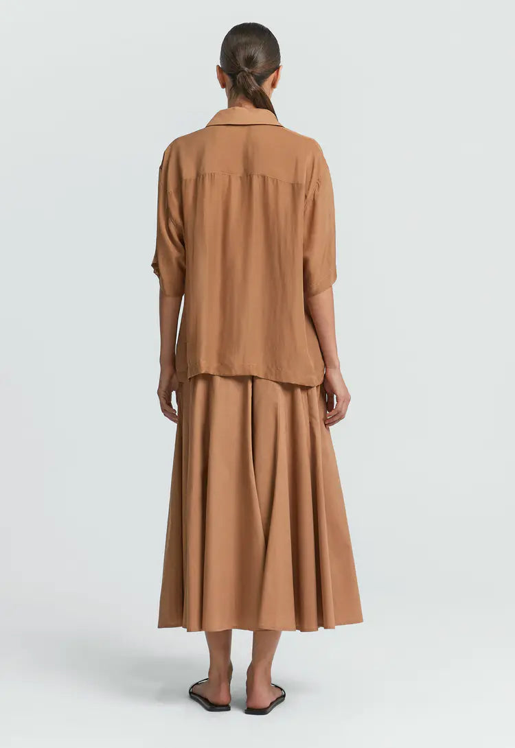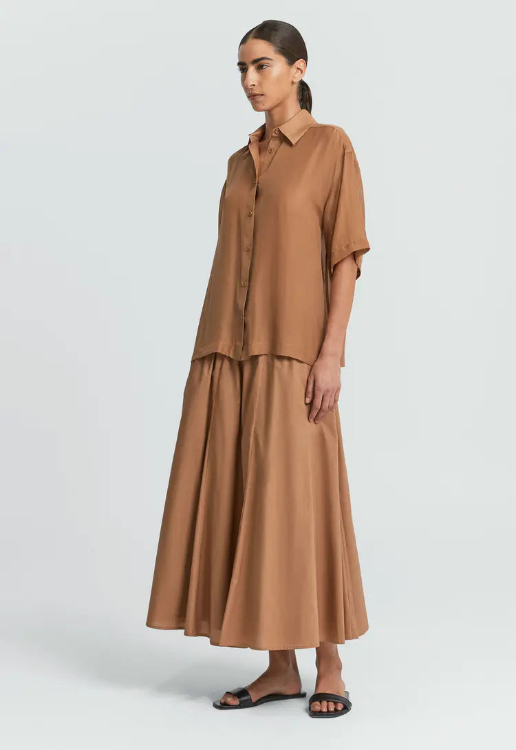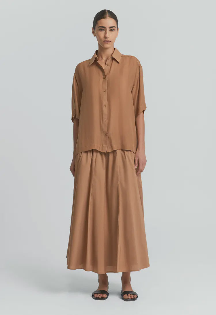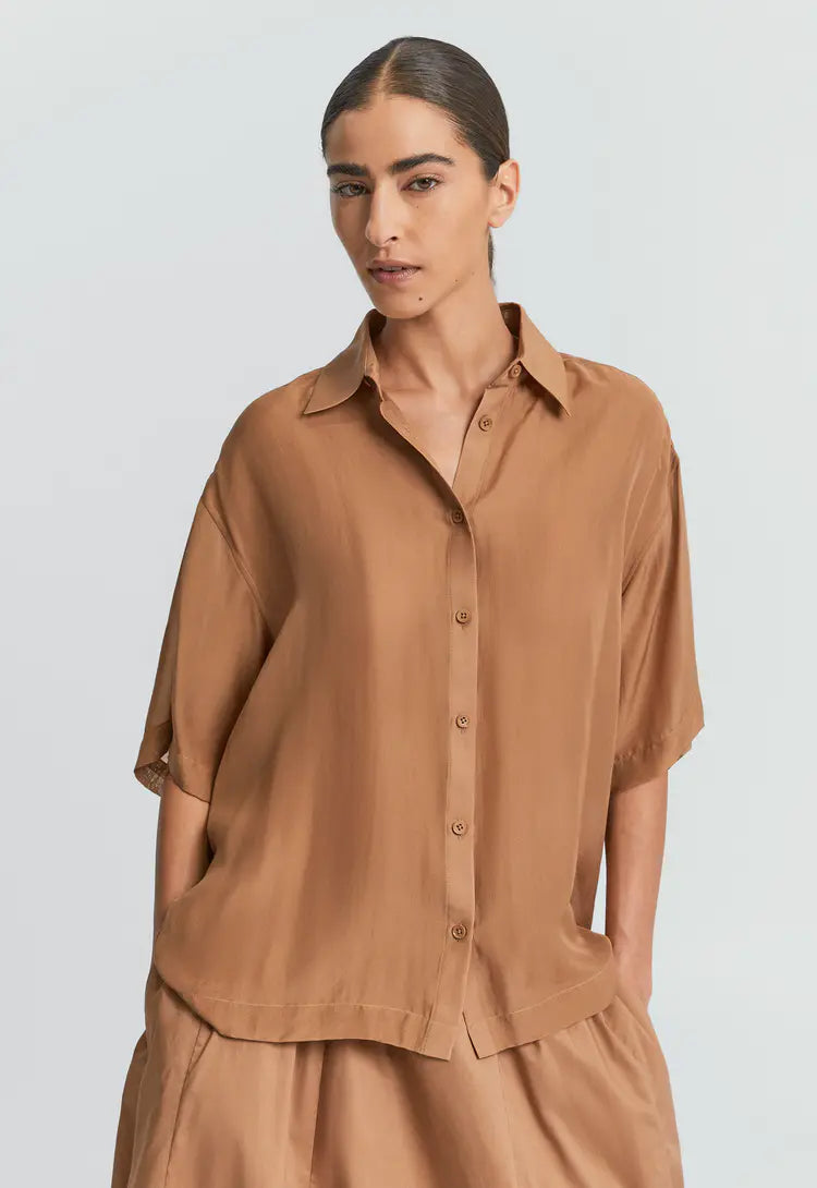 Jac and Jack Melo Shirt in Central. Made of pure silk chiffon, this short-sleeved shirt is cut in an oversized, boxy fit for a modern sense of ease. Featuring a clean, stitch-free collar, back yoke detailing, and fluid drape, it's a pared-back piece that feels both effortless and elevated. Light, airy, and ideal for layering.