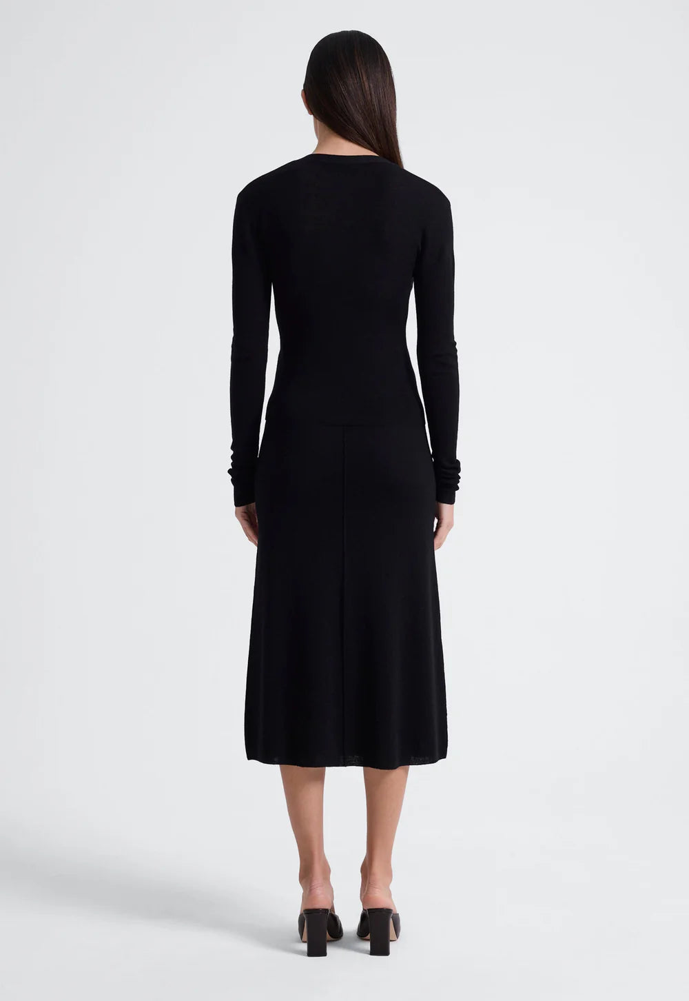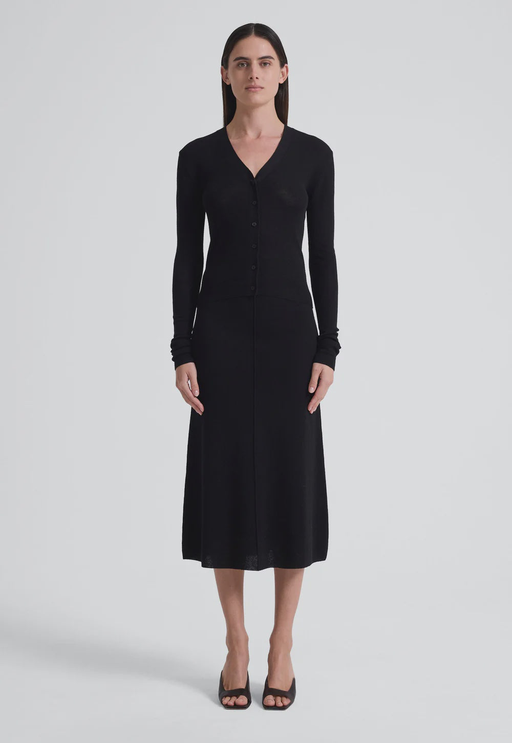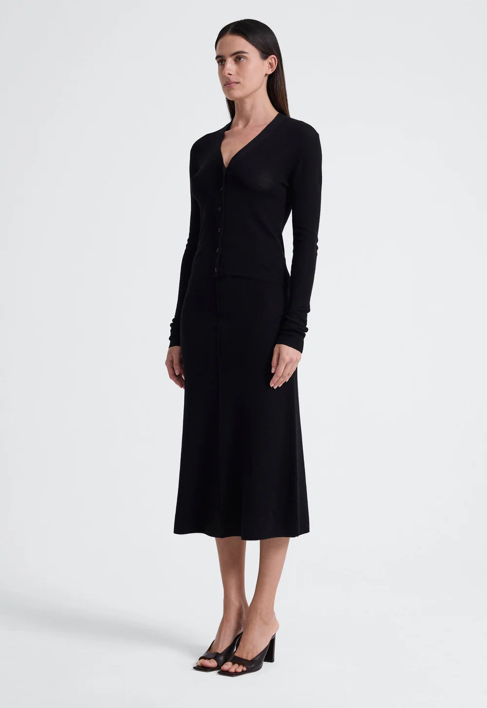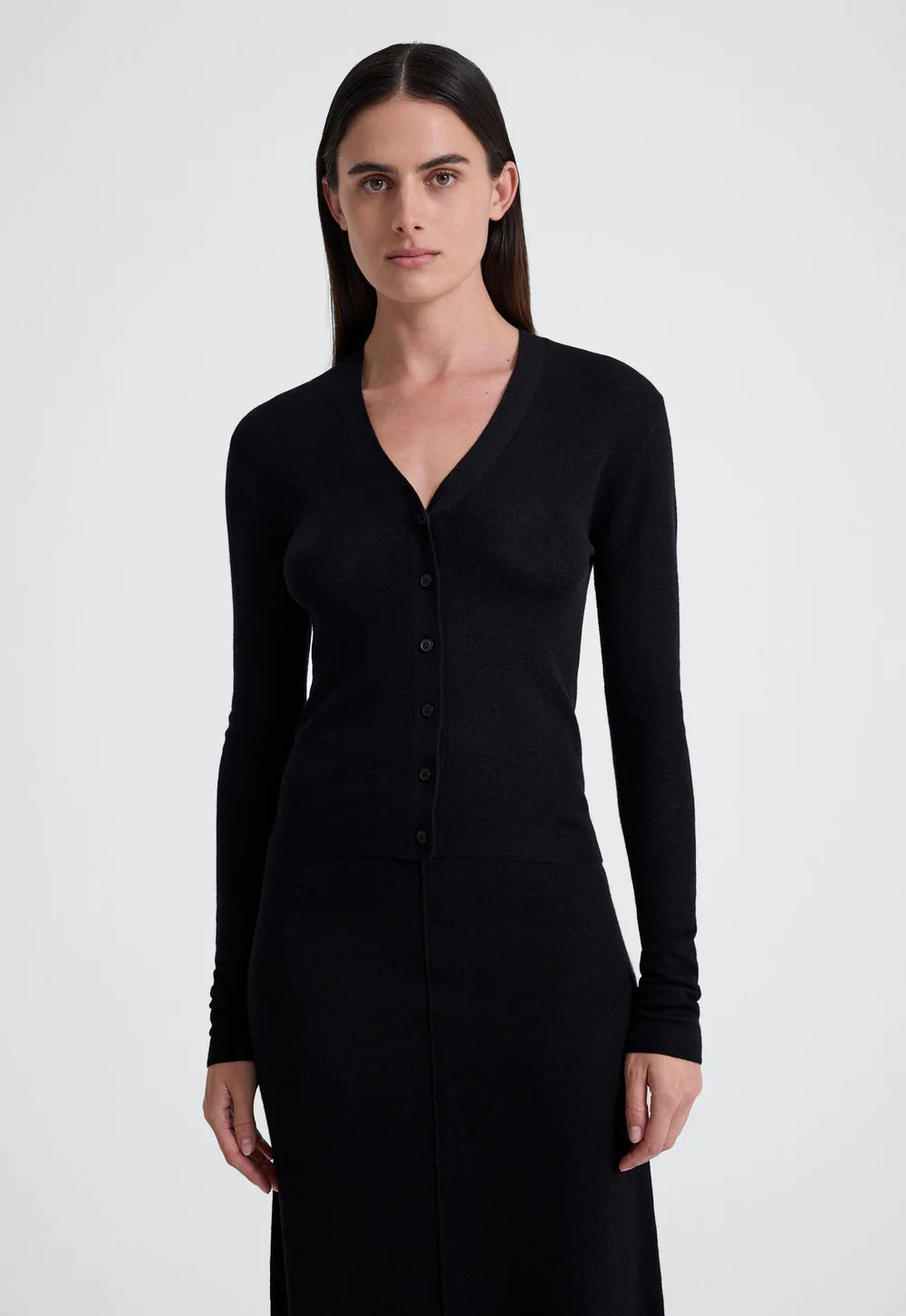Jac and Jack Abacus Cardigan in Black. Elevated layering at it's best, this cardigan is crafted from a fine merino wool, and is as luxurious as it is effortless. Featuring a deep v neckline with button closure, this slim fit shape is the perfect accompaniment for modern winter layering.