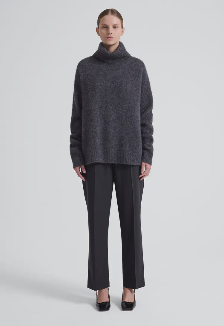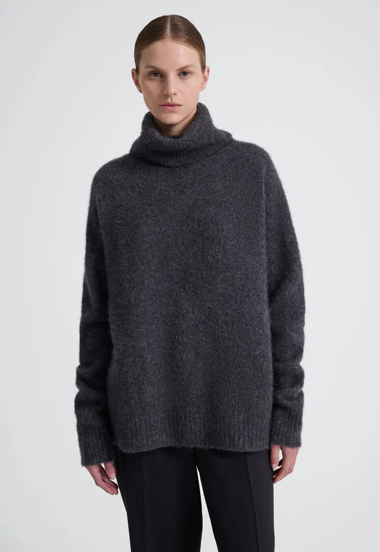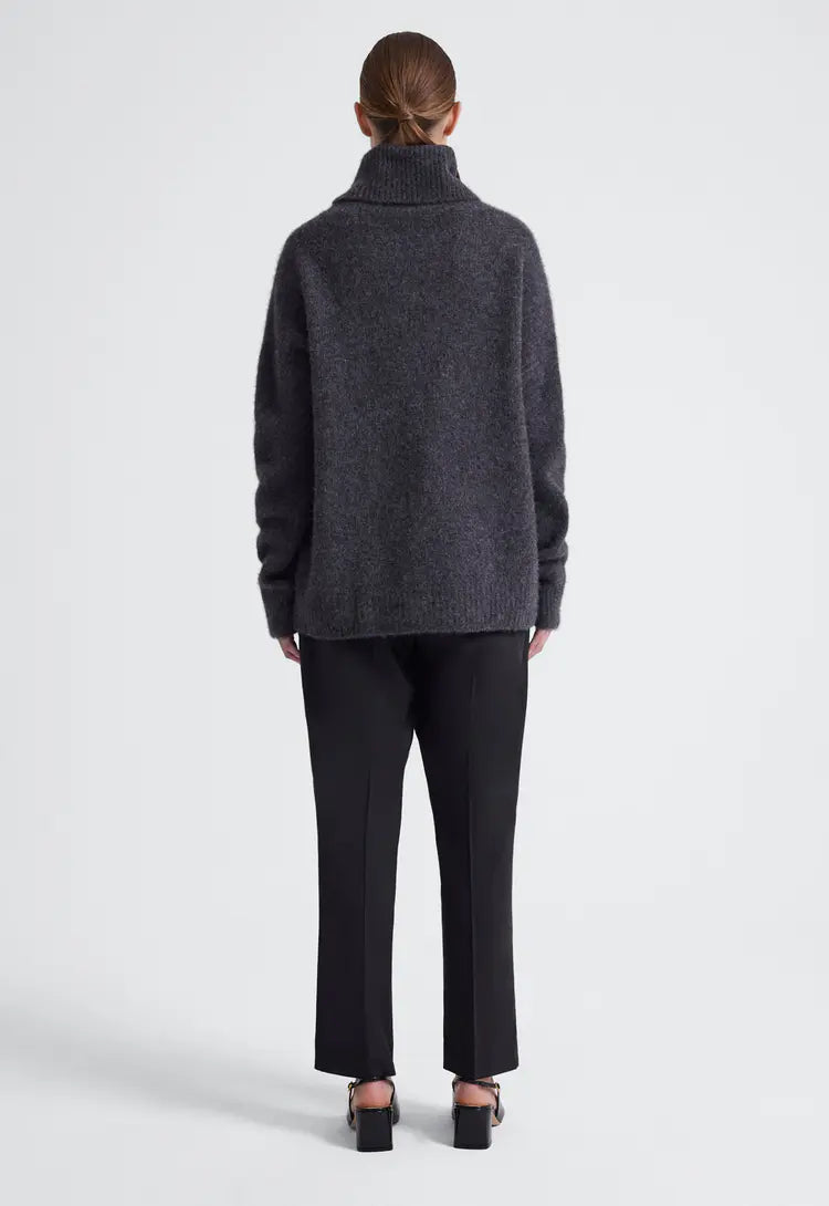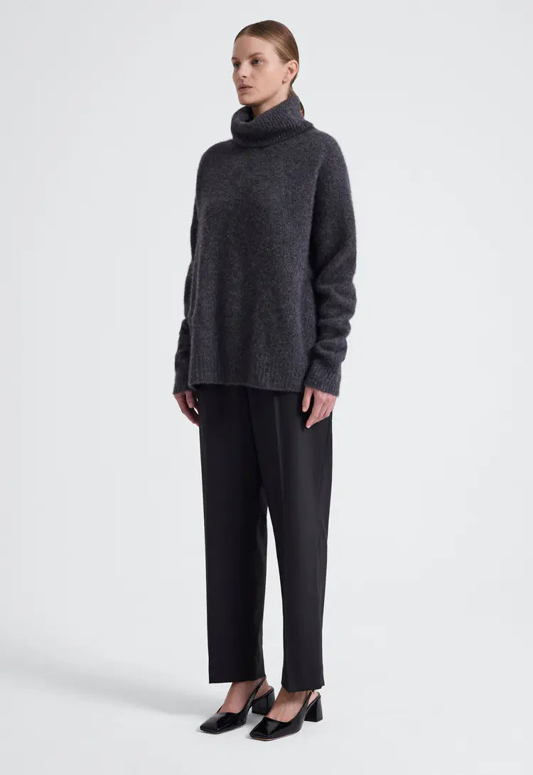 Jac and Jack Hayward Sweater in Charcoal Marle. Scrumptious in every sense of the word, this oversized, turtle-neck sweater is decadent, soft and luscious. With a drop shoulder, ribbed detailing and an exaggerated, relaxed turtle neck, it will keep you snug throughout winter.