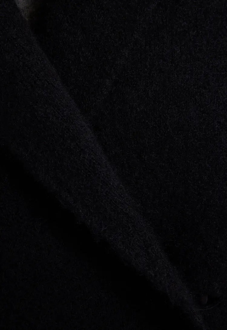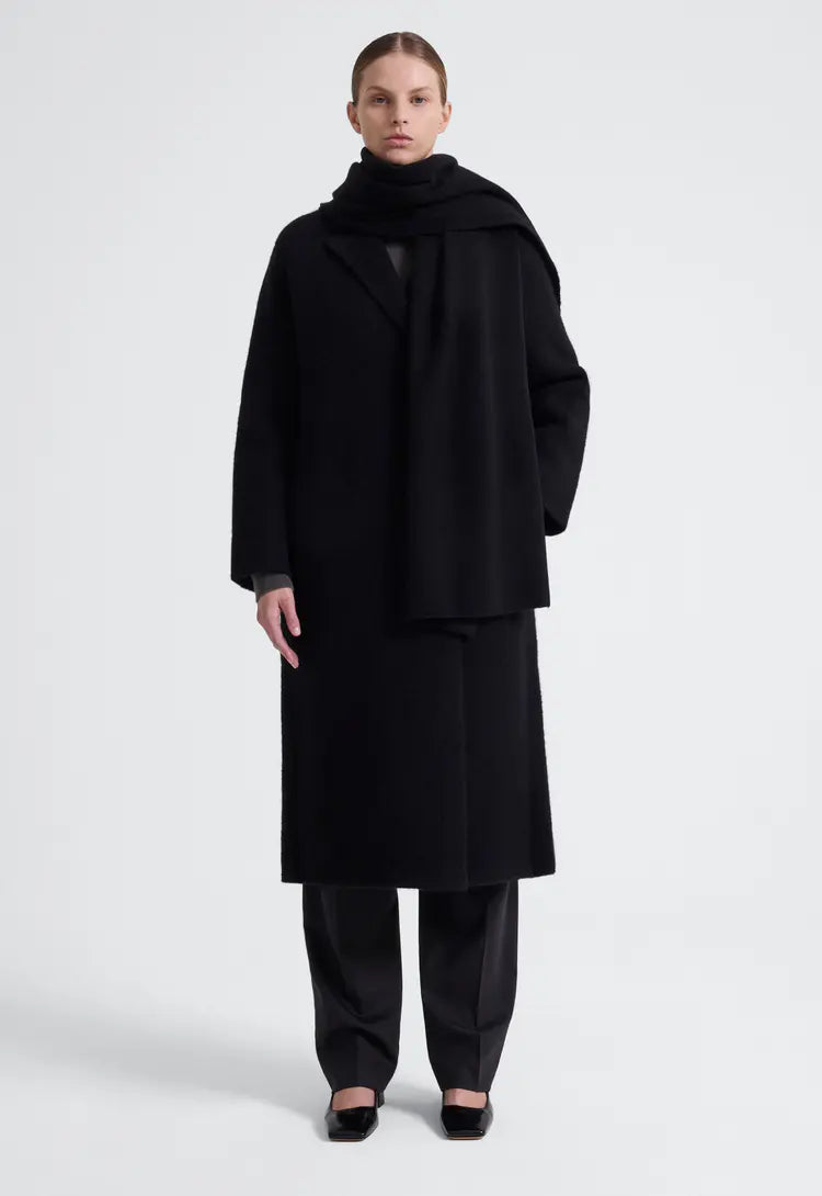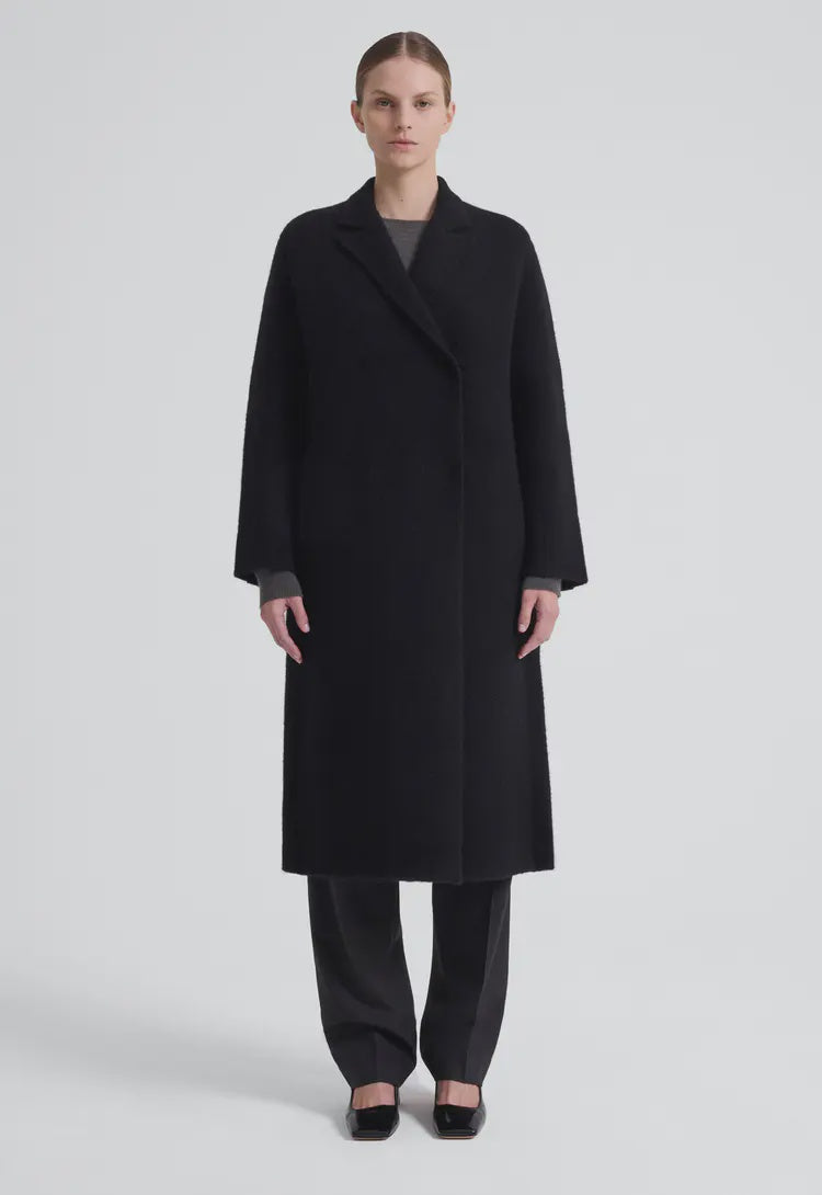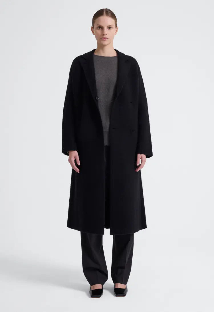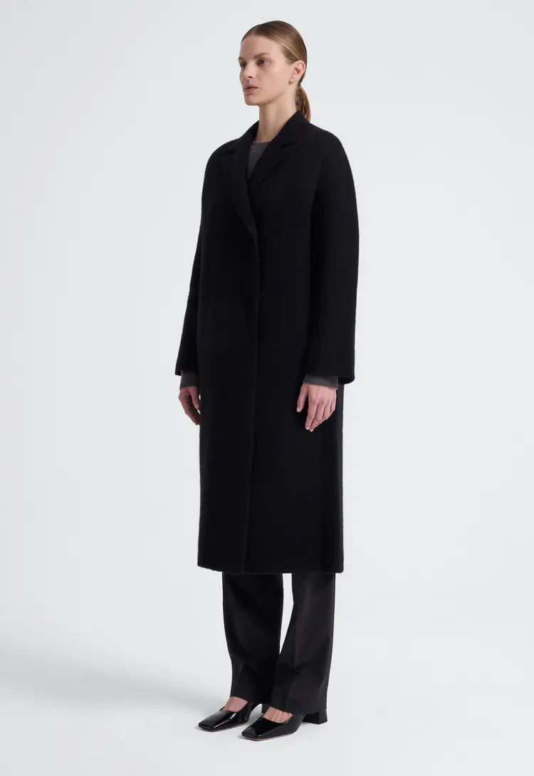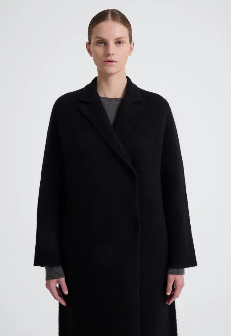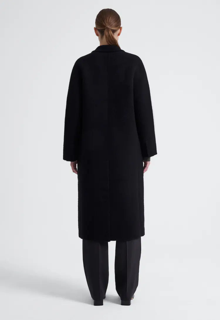 Jac and Jack Maggio Coat in Black. Modern elegance. This relaxed fit coat is polished yet roomy. Crafted from a soft yak and wool blend, it features a relaxed notched lapel, drop shoulders and an oversized silhouette, perfect for throwing on over soft tailoring and unstructured silks.