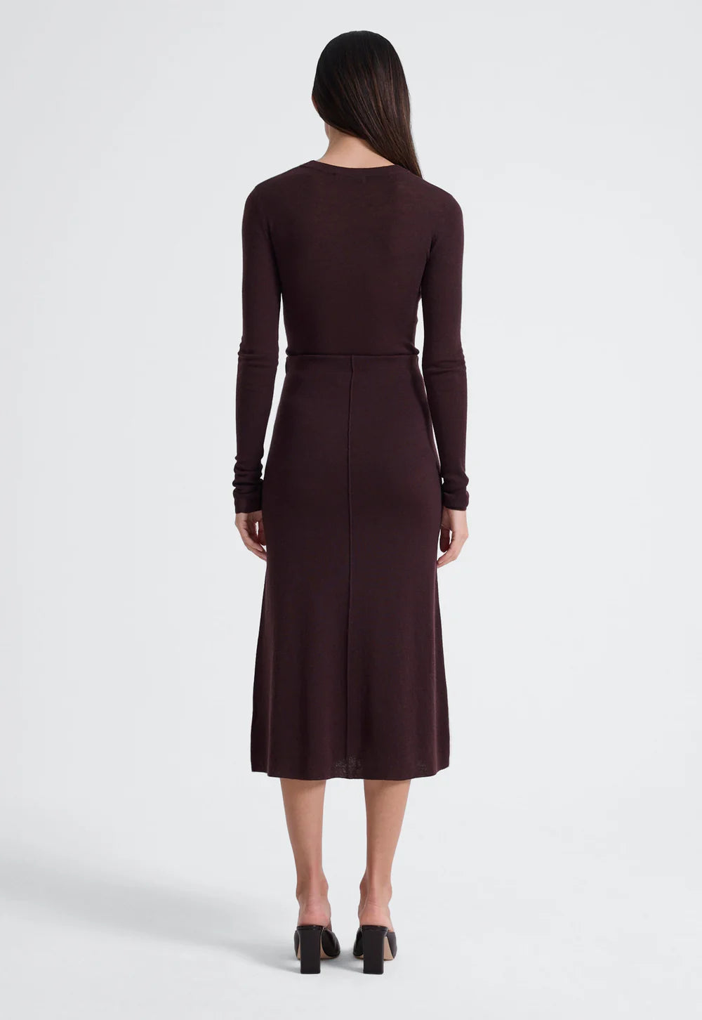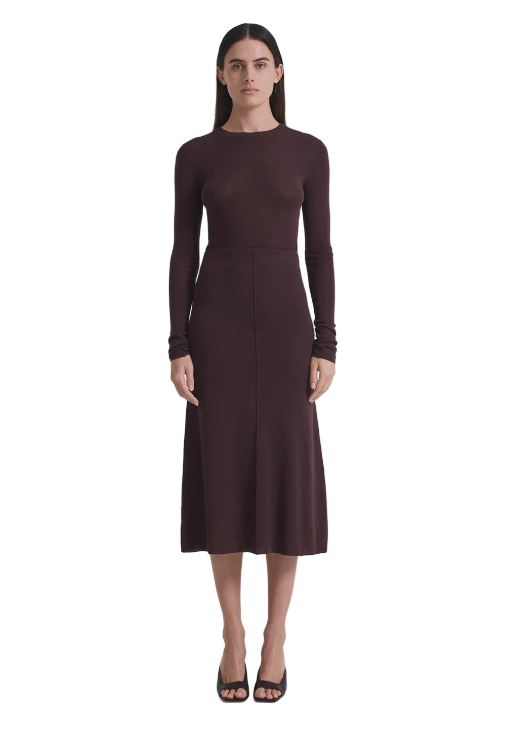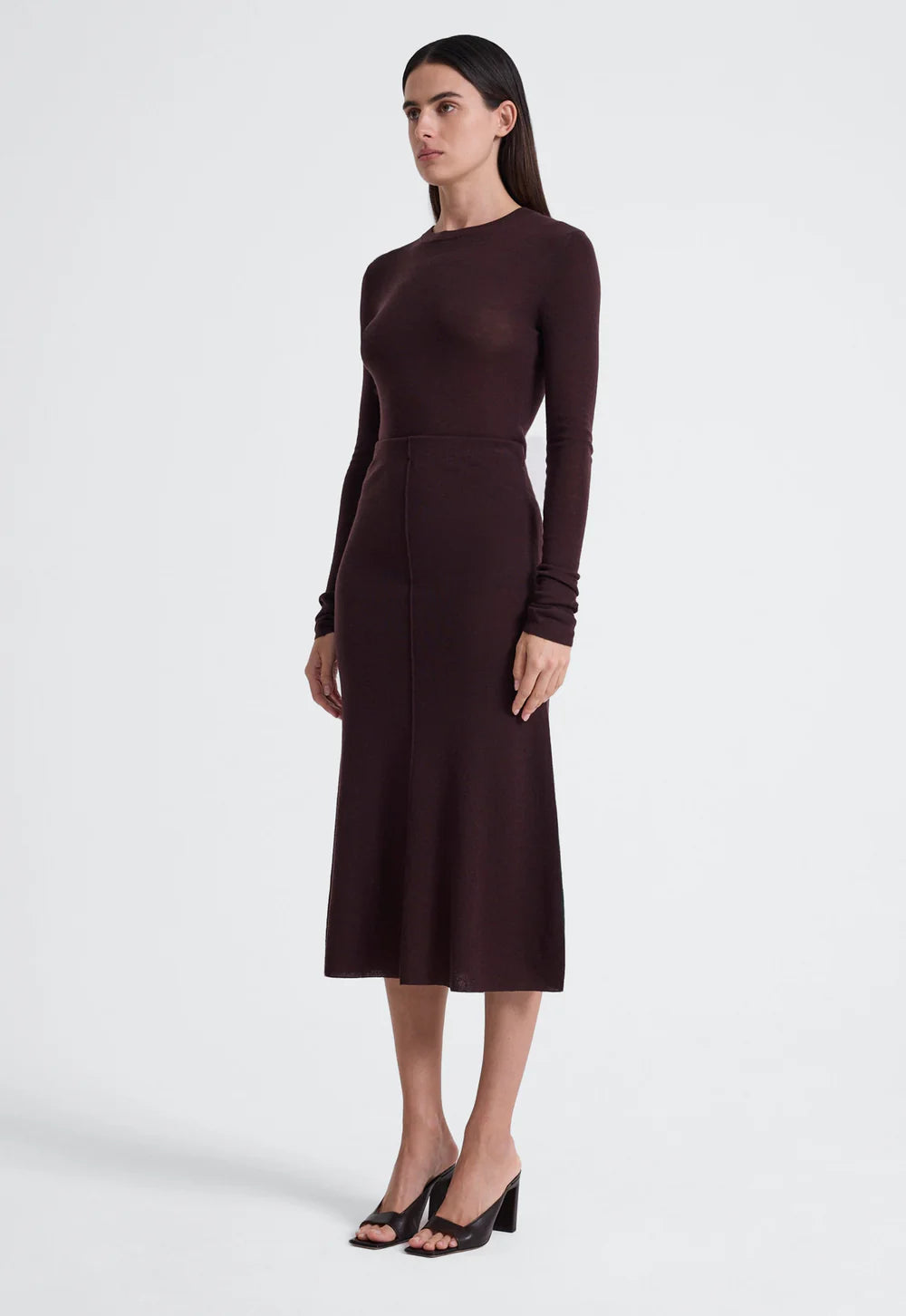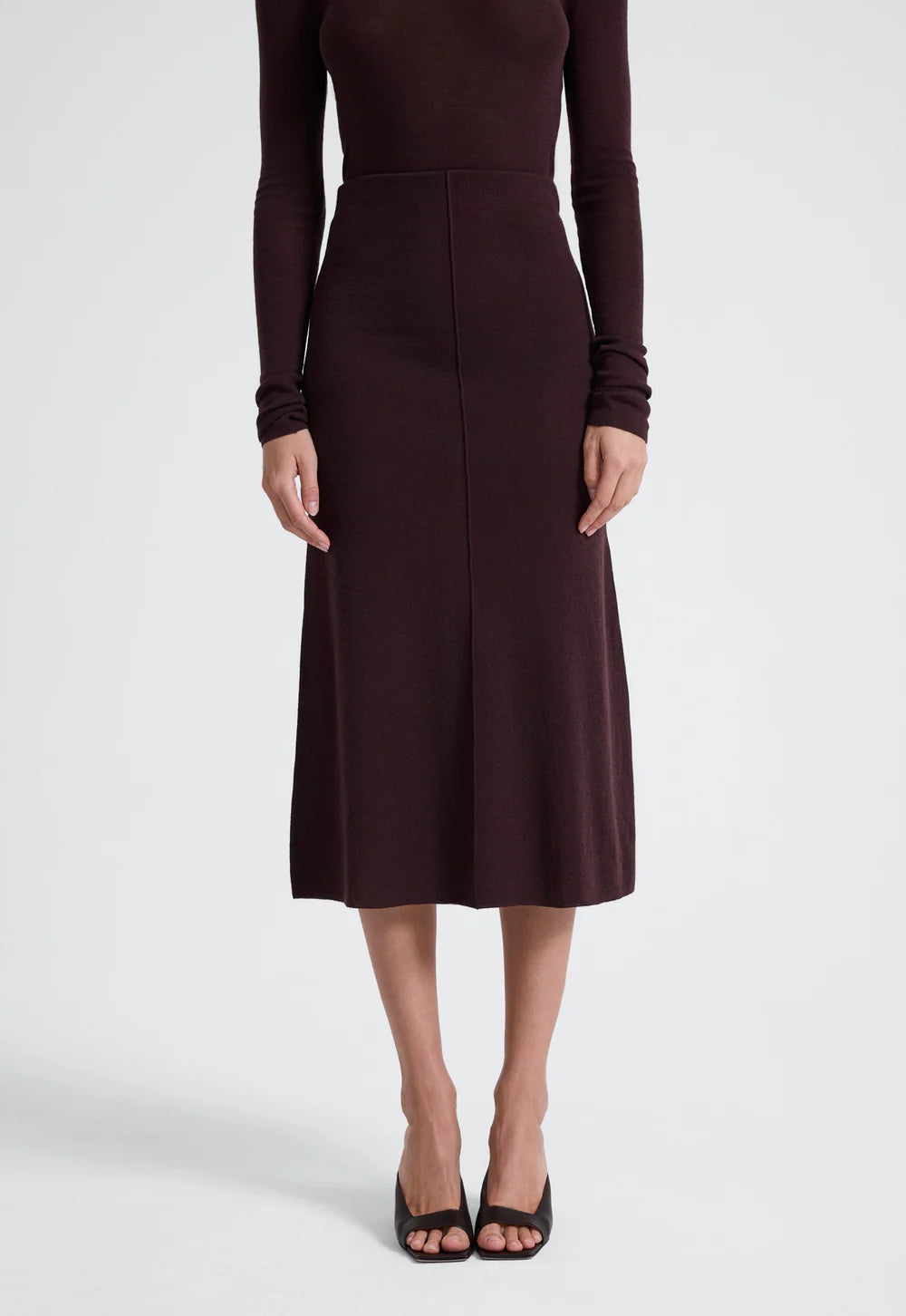 Jac and Jack Omega Skirt in Binks. The perfect back-to-work pant. Made of Australian merino, this easy-to-pull-on skirt is flattering with a fit and flair style, and natural stretch. With pinstitch detailing and a soft silhouette, it pairs perfectly with other baby wool pieces.
