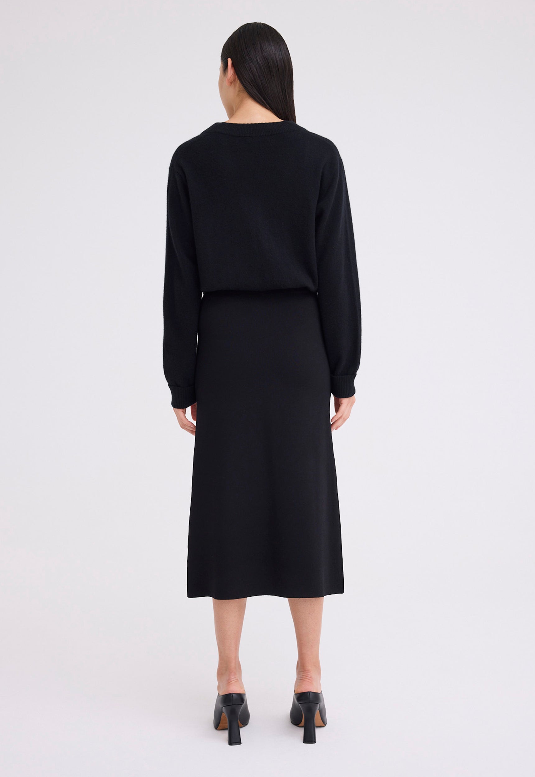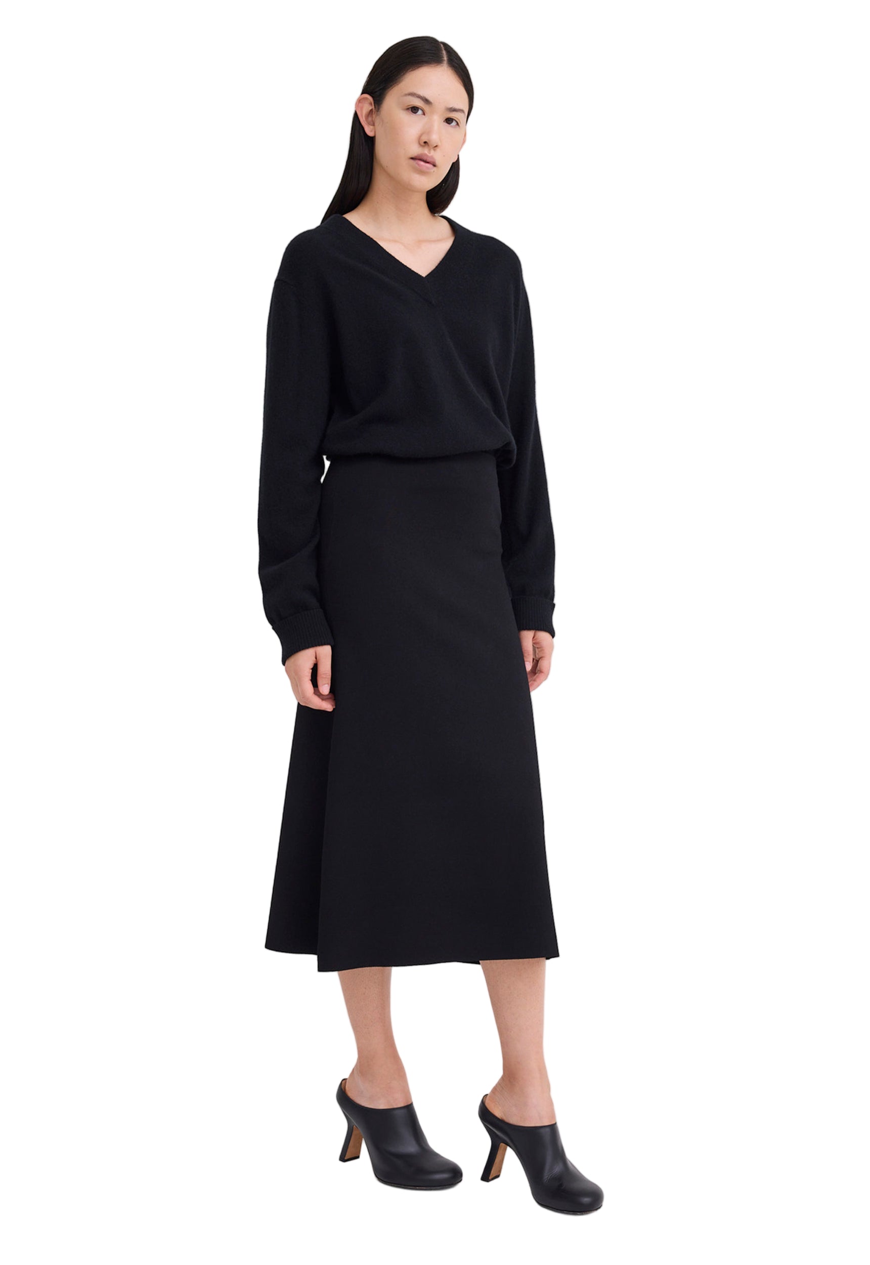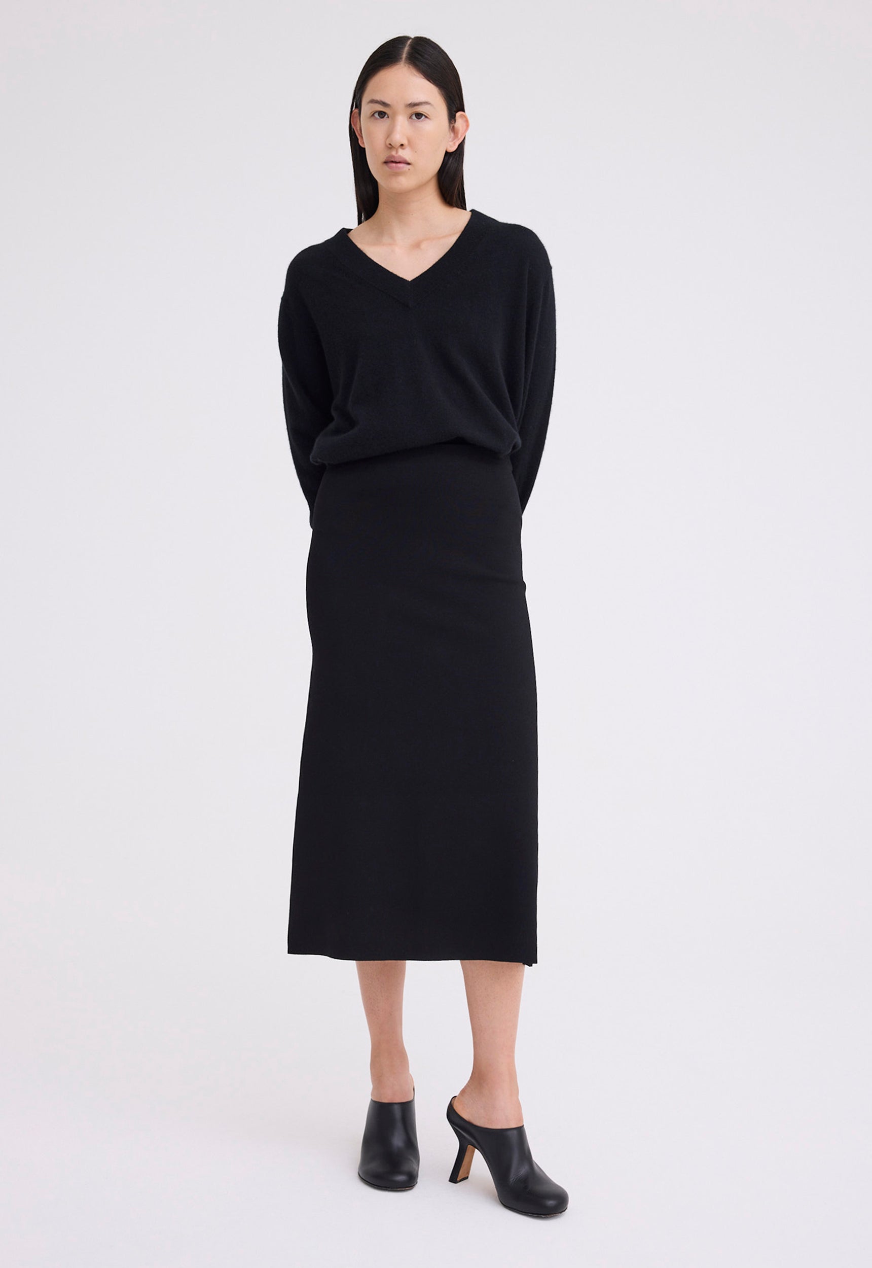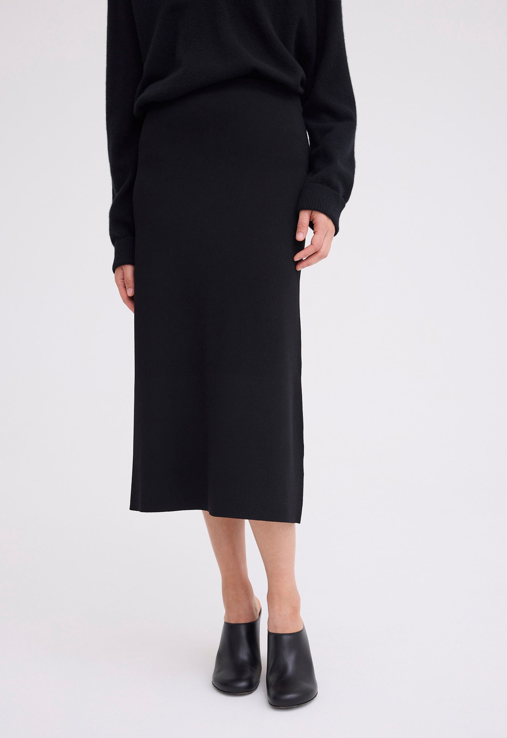 An elegant black skirt with timeless appeal. This midi length skirt features a high waistline paired with sleek lines to create a refined shape. Cut from a structured viscose blend knit this style has a beautiful shape and exudes an elegant sensibility.