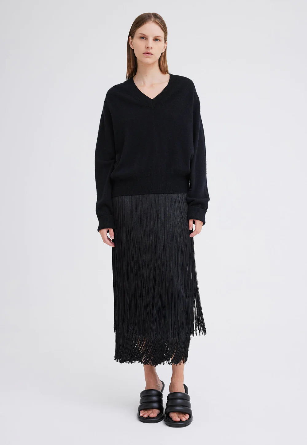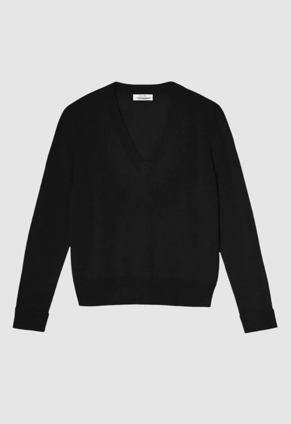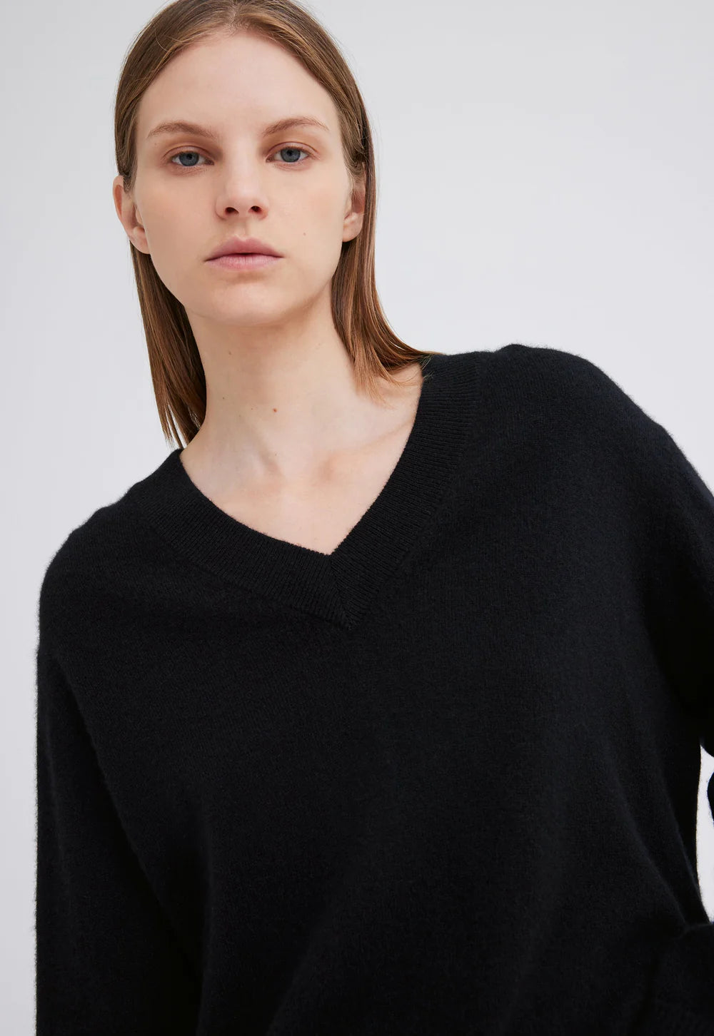 Soft and sensual. This v-neck cashmere sweater strikes the perfect balance of comfort and style. Crafted from a supremely soft cashmere, this style features a plunging v-neck, long sleeves and ribbed trim finish on the neckline, hem and cuffs. Play with texture by matching back with fluid silks for a relaxed yet refined look.