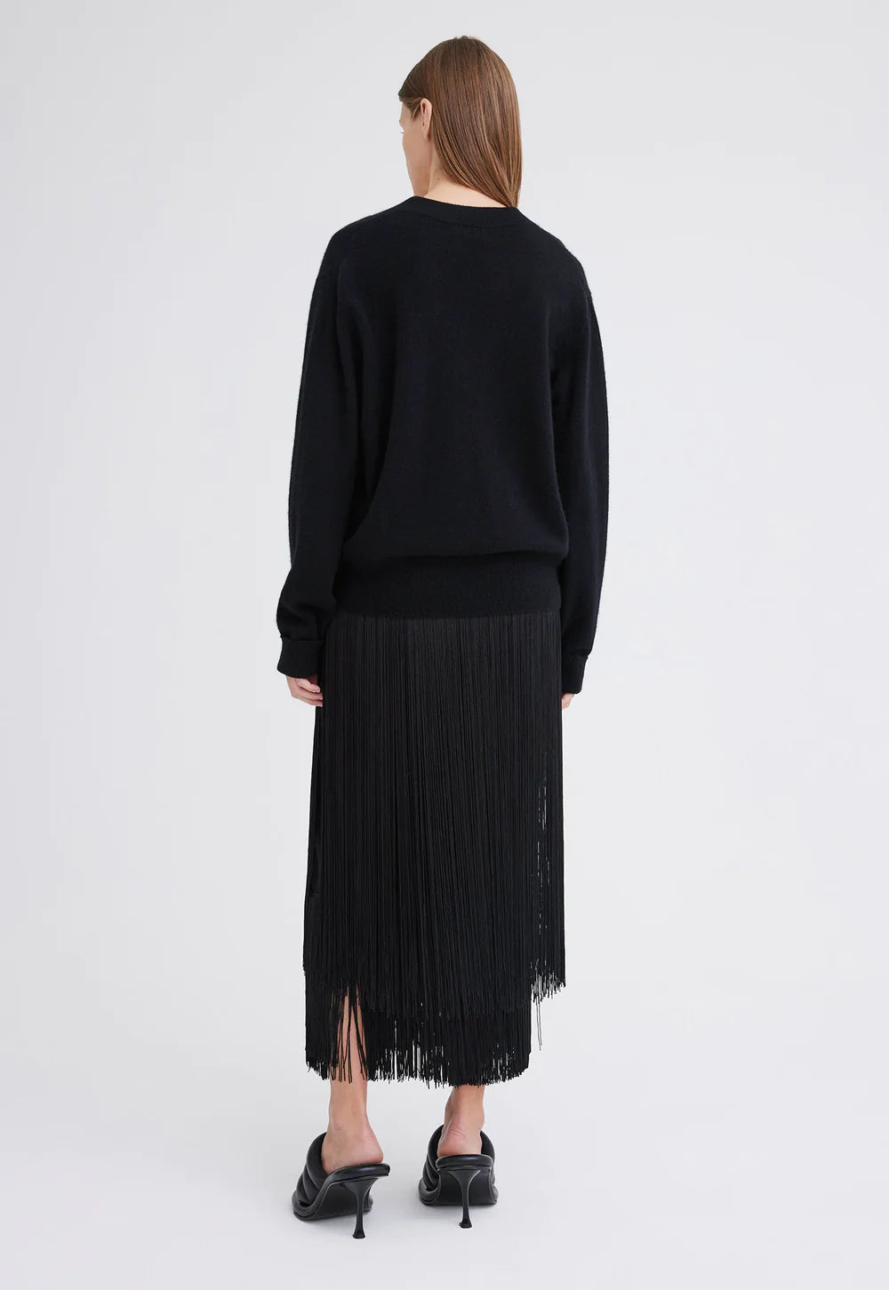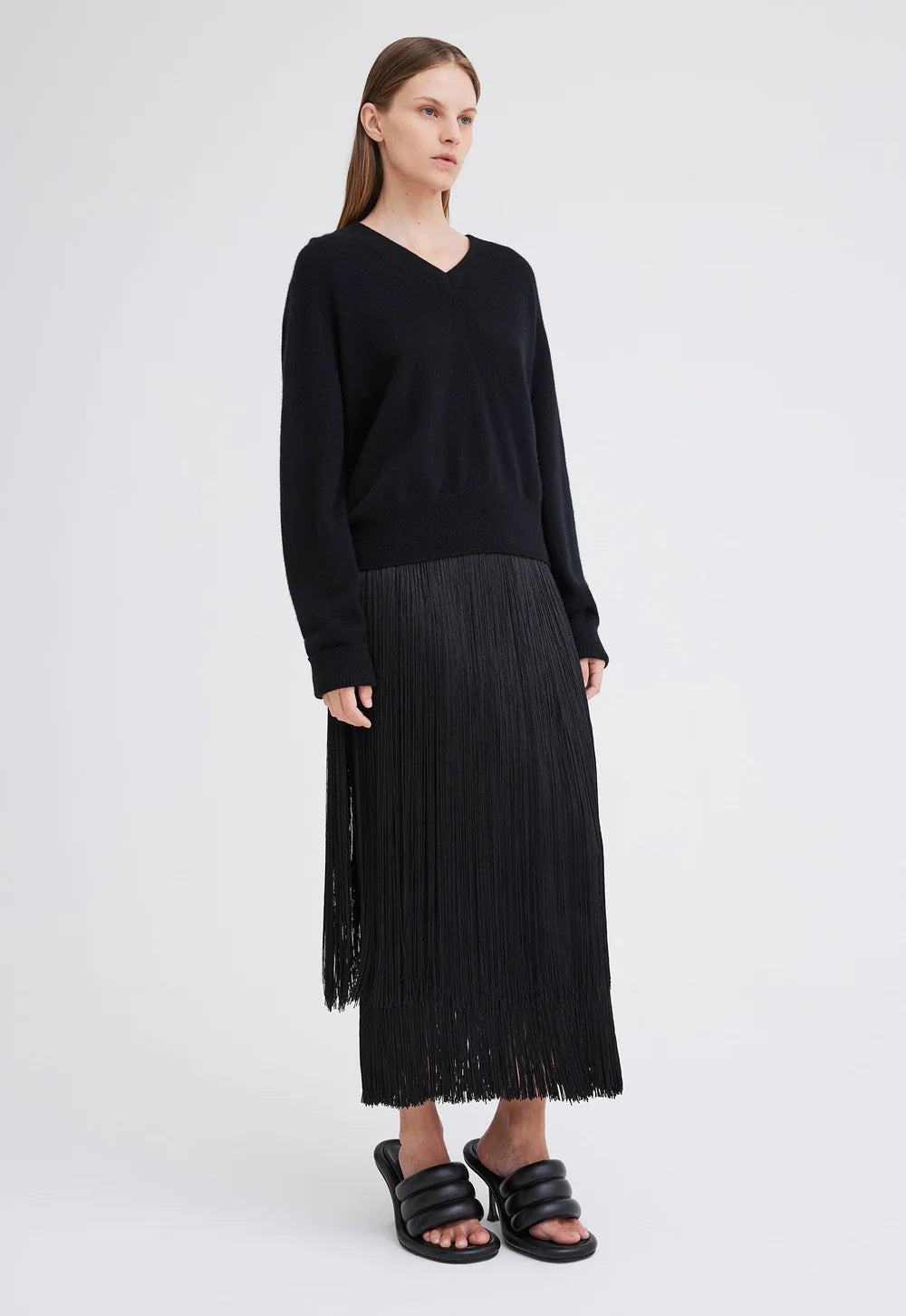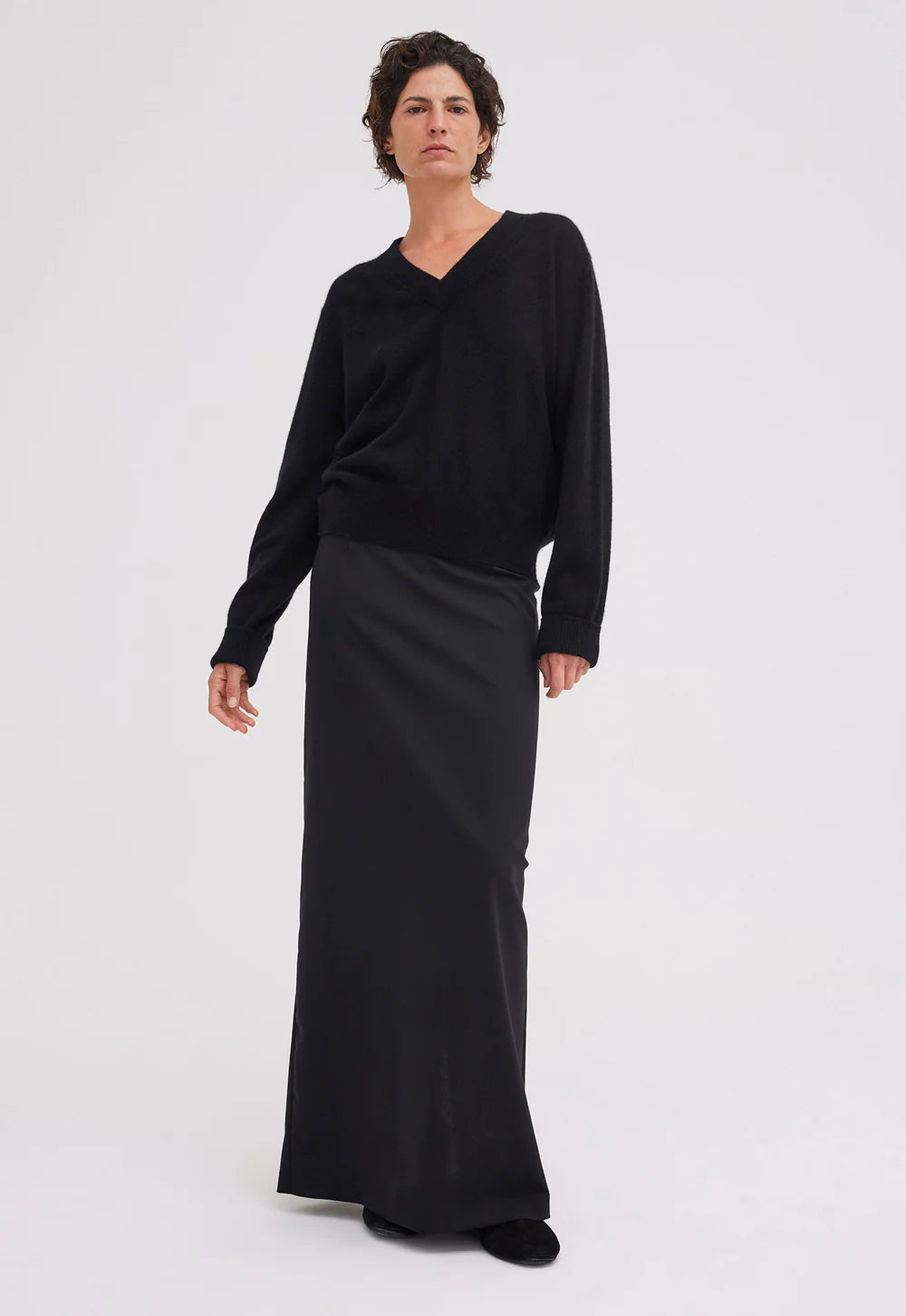 Soft and sensual. This v-neck cashmere sweater strikes the perfect balance of comfort and style. Crafted from a supremely soft cashmere, this style features a plunging v-neck, long sleeves and ribbed trim finish on the neckline, hem and cuffs. Play with texture by matching back with fluid silks for a relaxed yet refined look.