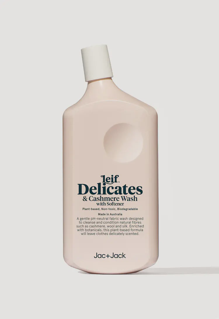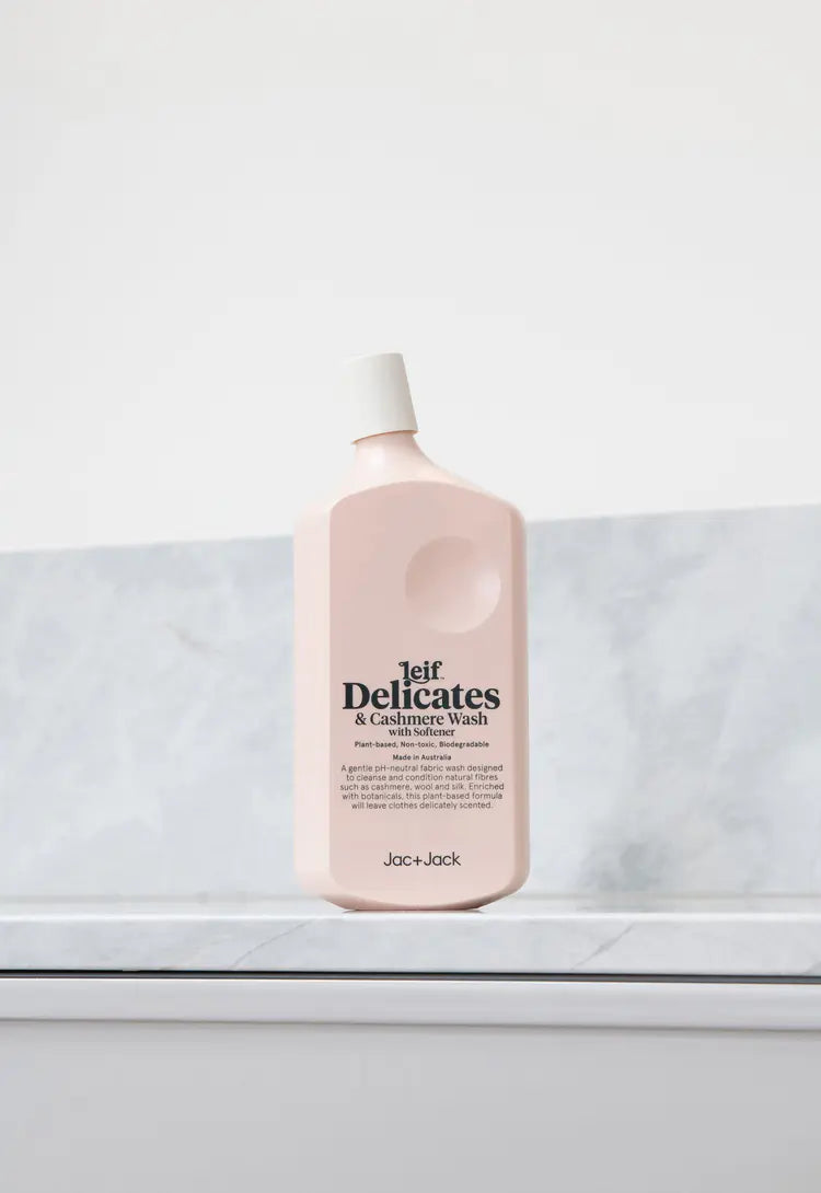 Leif x Jac + Jack Delicates & Cashmere Wash is a gentle pH-neutral fabric wash designed to cleanse and condition natural fibres such as cashmere, wool, silk and lace. Essential oils Lemon Myrtle, Yuzu, Lemon and Ylang Ylang deliver a scent that is slightly sweet and comforting. Packaged in a 100% recyclable bottle, the wash is non-toxic, biodegradable and made in Australia. Laundry was created in collaboration with Leif, a project that evolved from friendship and a shared desire to create everyday pieces that offer quality and modern design.