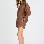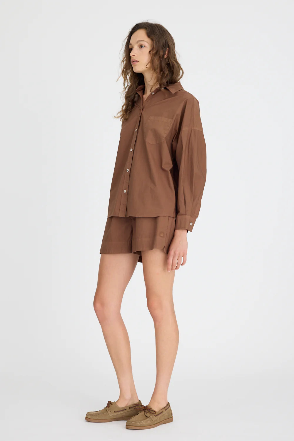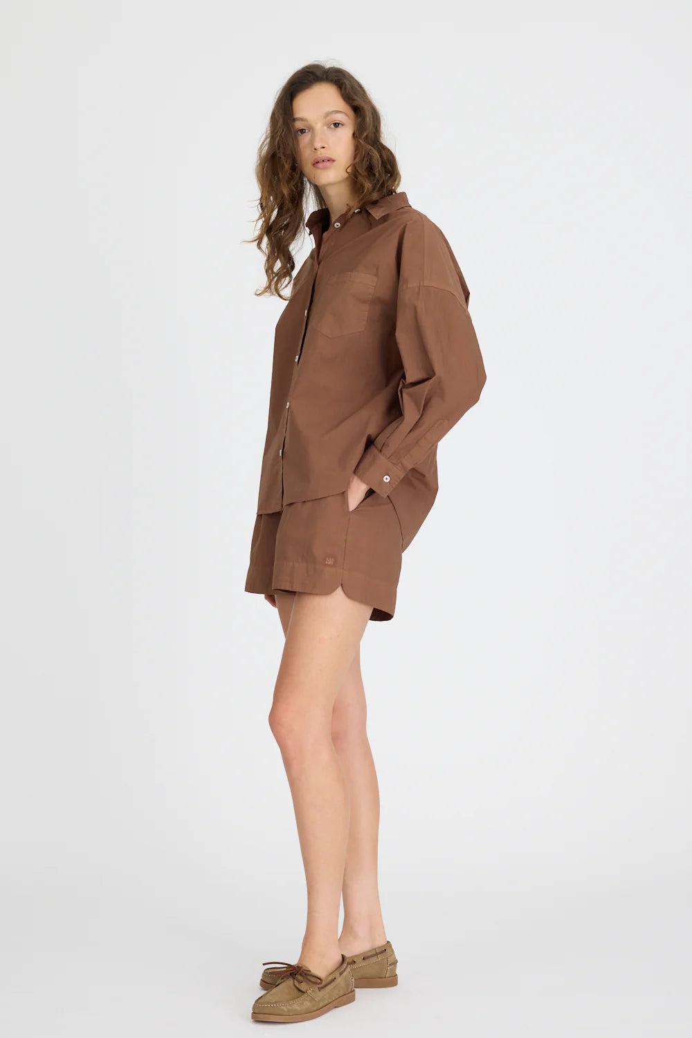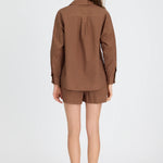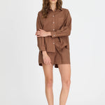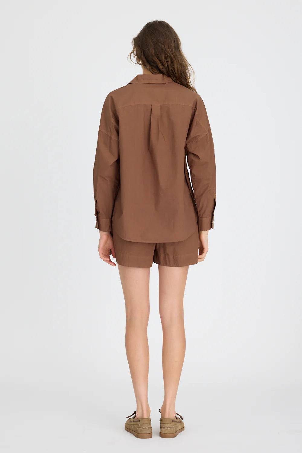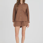 LMND Chiara Long Sleeve Classic in Macchiato. Our Signature Classic button-up shirt featuring customized stripe detail. Crafted from 100% yarn-dyed cotton, this shirt exudes both style and comfort. Features a chest pocket and our signature drop shoulders, creating a slightly loose silhouette that is perfect for layering under cozy knitwear or pairing with your favourite Chiara shorts.