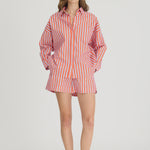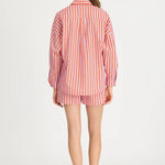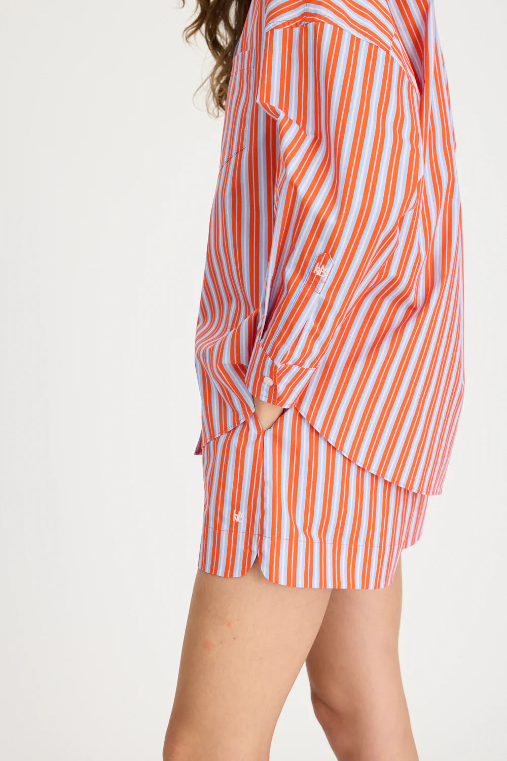 LMND Chiara Long Sleeve Shirt Multi Stripe in Spicy Orange and Himalayan and Blue. Introducing our Signature Classic Button-Up Shirt, featuring a stripe detail. Expertly crafted from 100% yarn-dyed cotton, this shirt effortlessly combines style and comfort. The design includes a practical chest pocket and our signature drop shoulders, creating a slightly loose silhouette perfect for layering under cozy knitwear or pairing with your favourite Chiara shorts.