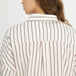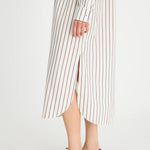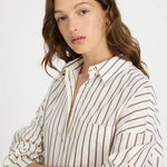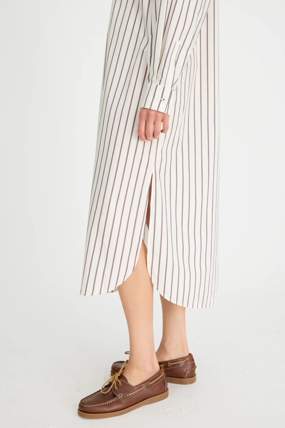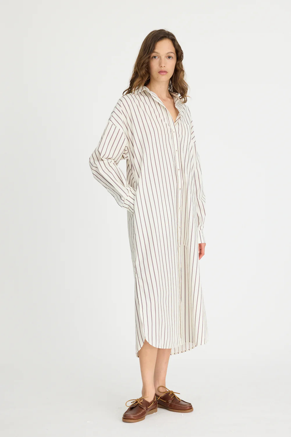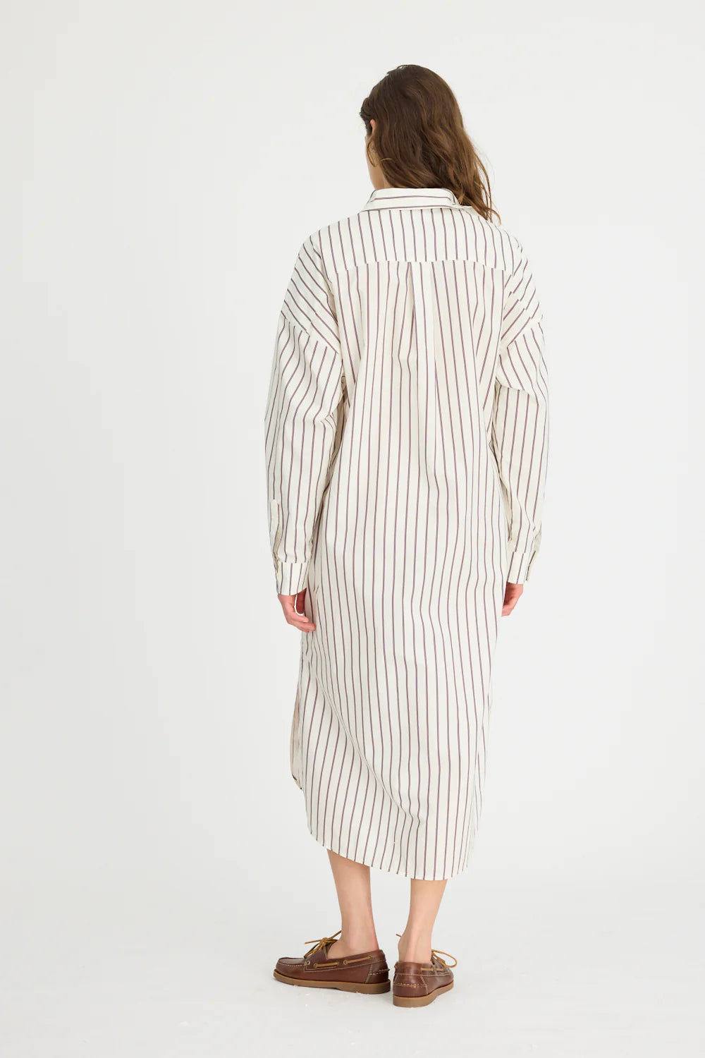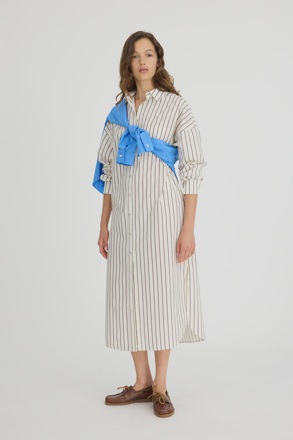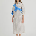 LMND Chiara Maxi Dress in Vanilla and Cinnamon and Ink Blue. Discover the upgraded Chiara Maxi Shirt Dress, now featuring extra length. Crafted from 100% Cotton poplin and garment-dyed, this dress boasts a classic rounded hem. Its oversized fit offers versatility, whether you leave it unbuttoned over pants, matching shorts, or your favourite swimsuit. Upgrade your style effortlessly with this wardrobe essential.