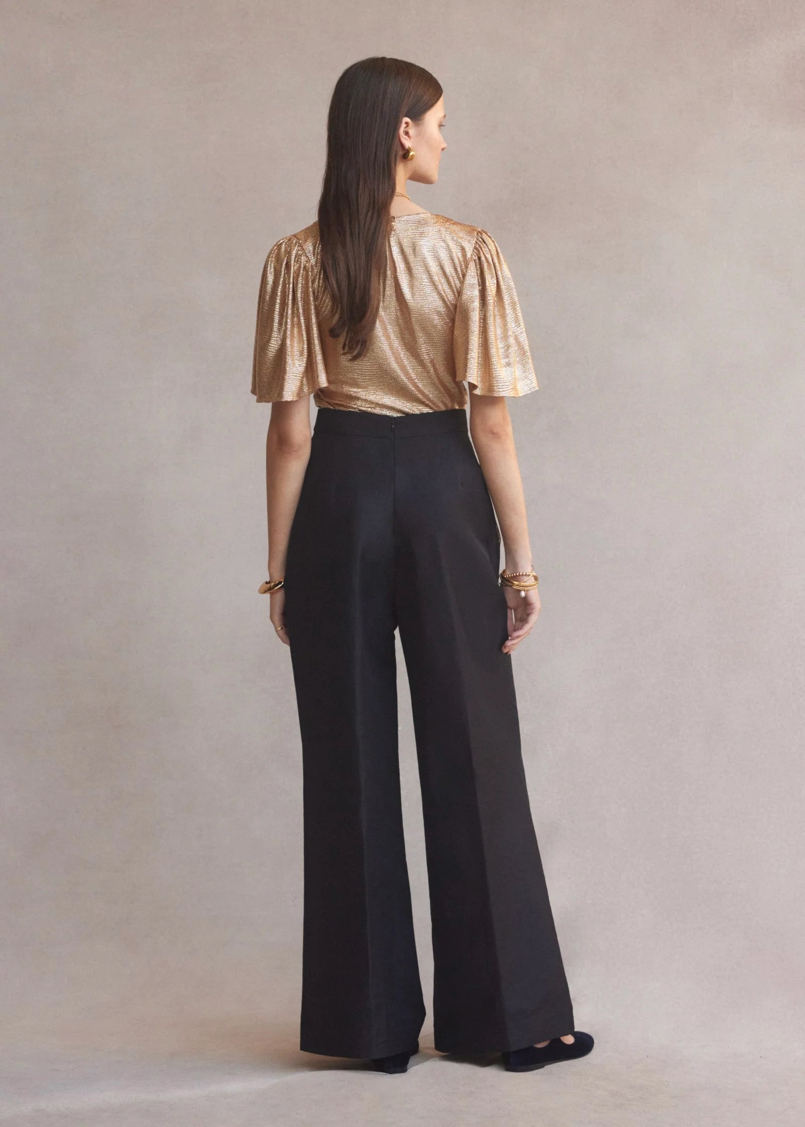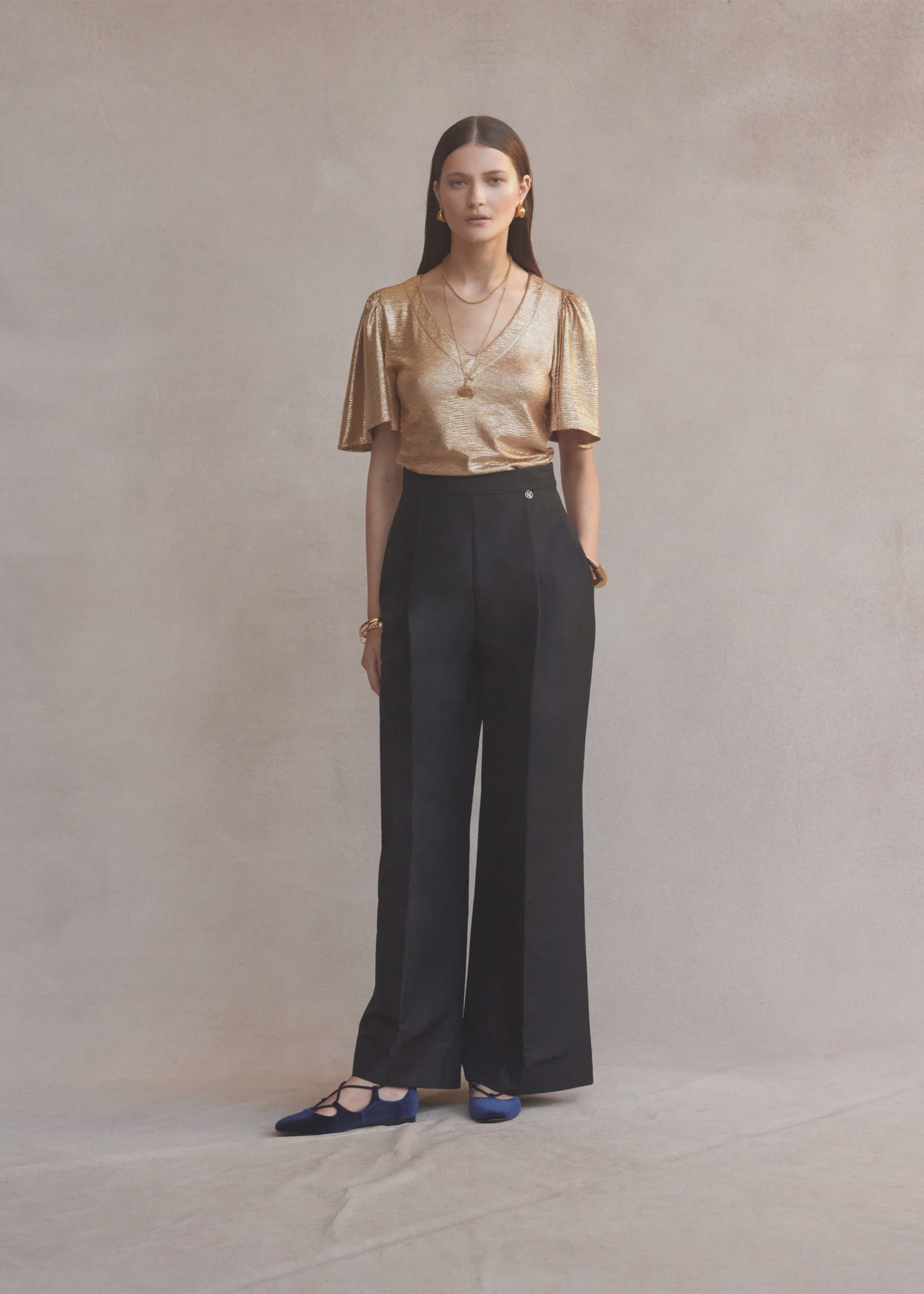 Luxe De Valentina Farfalla T-Shirt in Cartier Gold. The Farfalla V-neck Top in Gold Metallic features a deep v-neckline and fluted sleeves. Made in stretch metallic fabric that requires no ironing, the Farfalla top is comfortable and flattering on most body shapes.