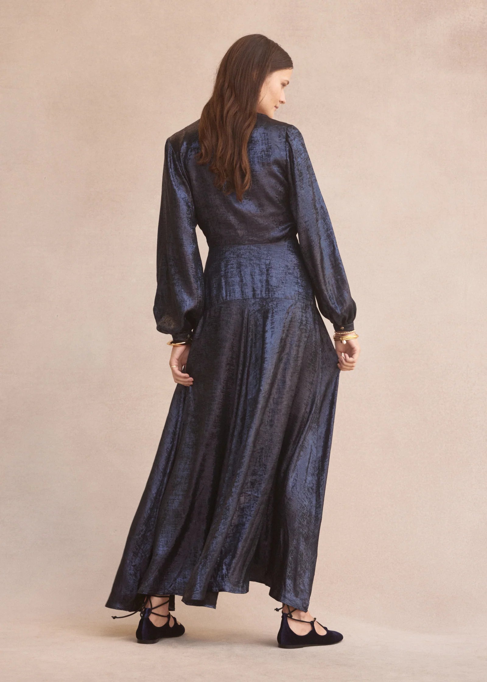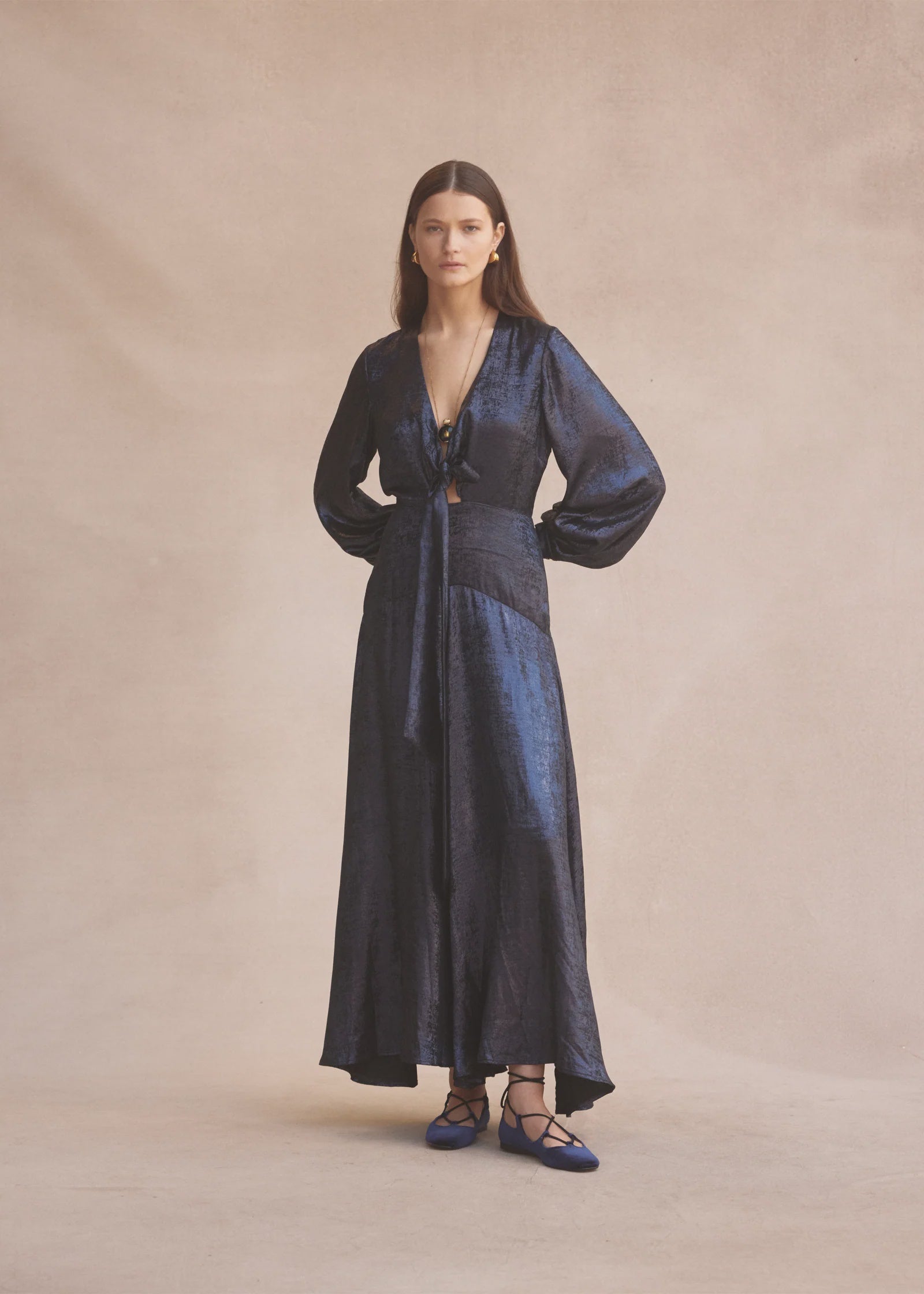 Luxe De Valentina Fontana Maxi Dress in Navy. The Fontana Maxi Dress in Gold Supernova features a V-neckline with front tie, long balloon sleeves with elastic cuff with gold button detailing. The dress is a relaxed fit through the bodice with a full maxi skirt that falls from a fitted panel across the hip with side zip. Made in soft, stretch metallic tulle, the fabrication features a tiny gold sequin pattern that gives a subtle shimmer. Ultra-light, soft and semi sheer, this dress is relaxed and elegant.