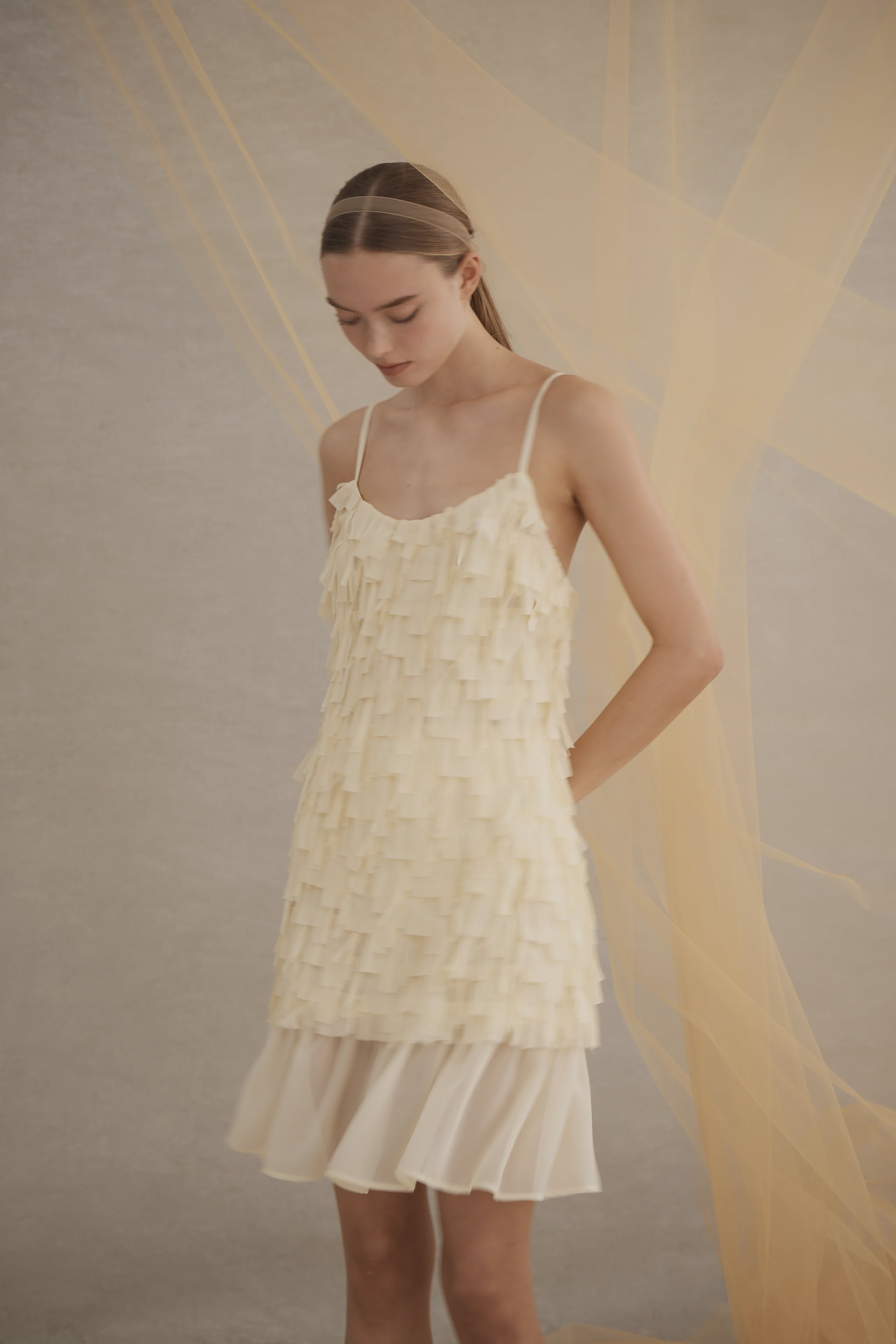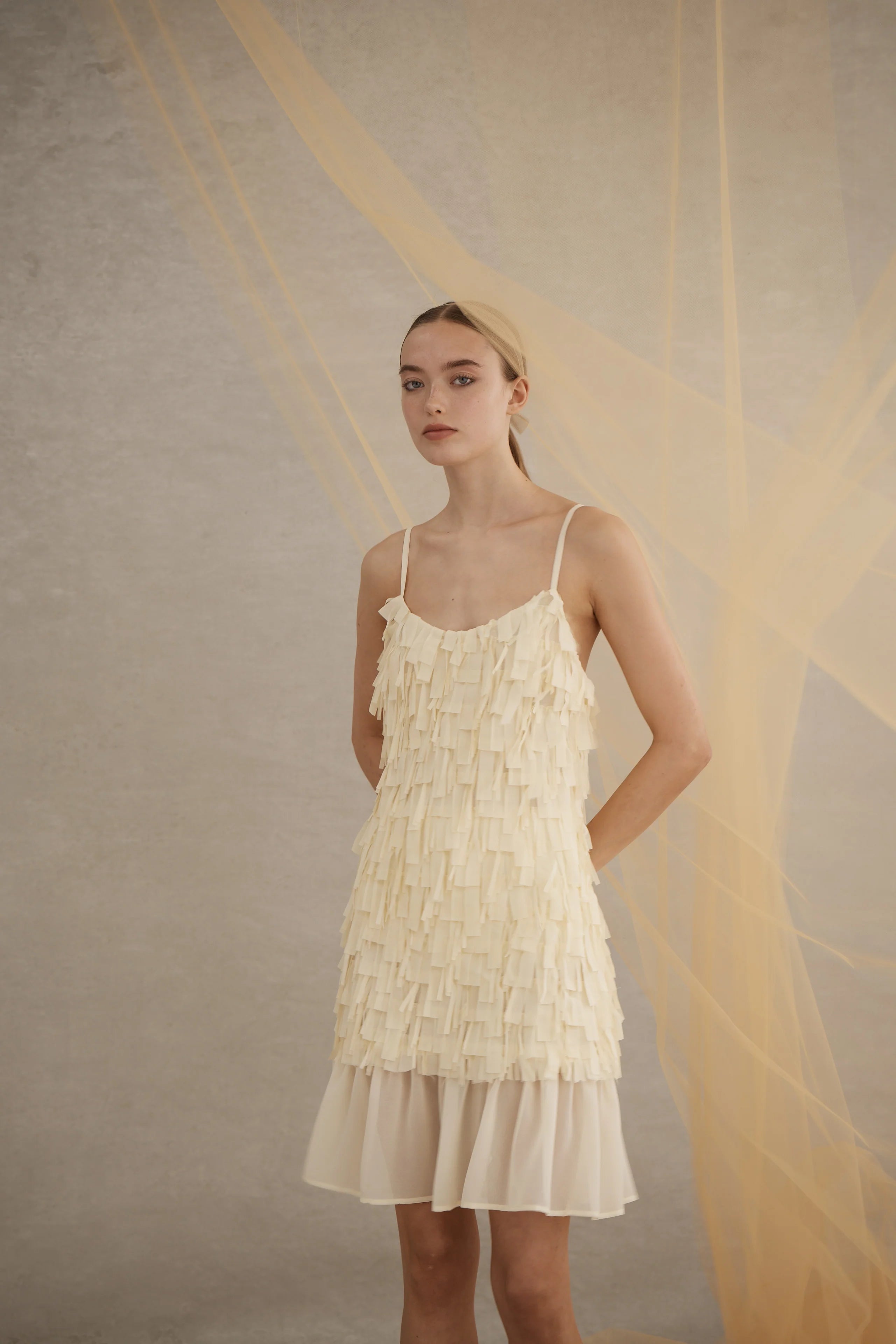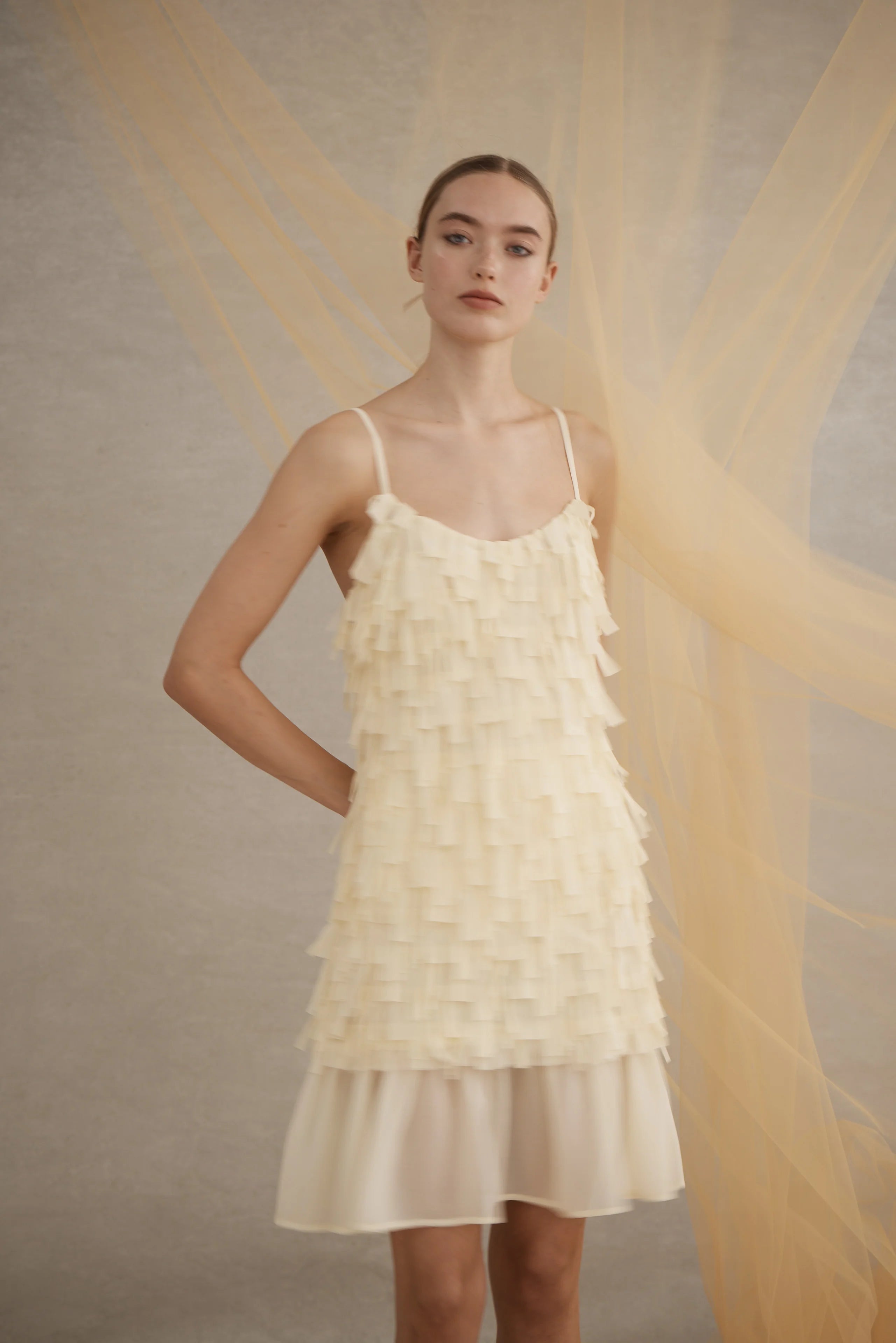 Luxe De Valentina Heartbreak Mini Dress in Butter Cream. The Heartbreak Mini Dress in Butter Cream is crafted from sheer chiffon with stretch tulle and features a drop-waist and adjustable spaghetti straps.