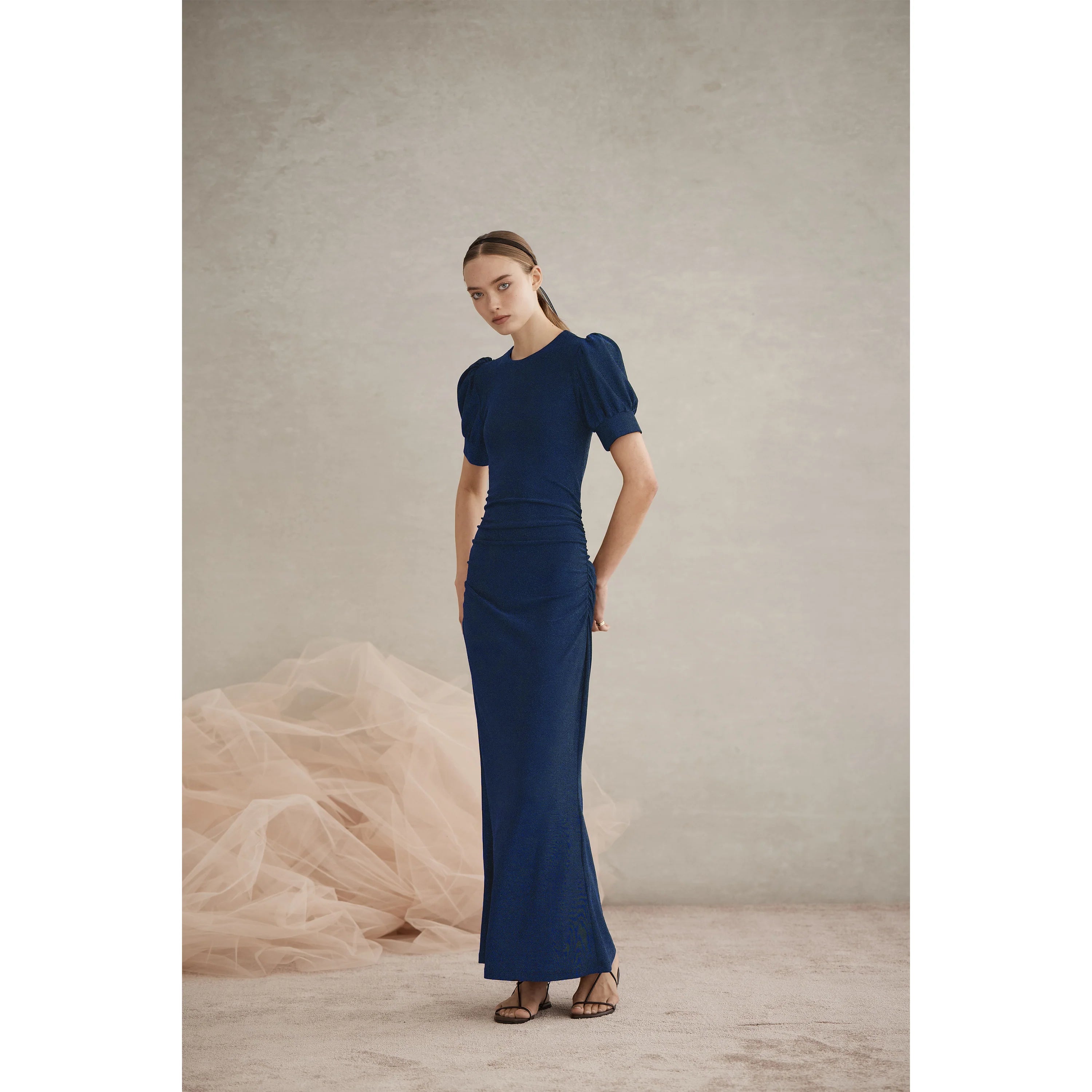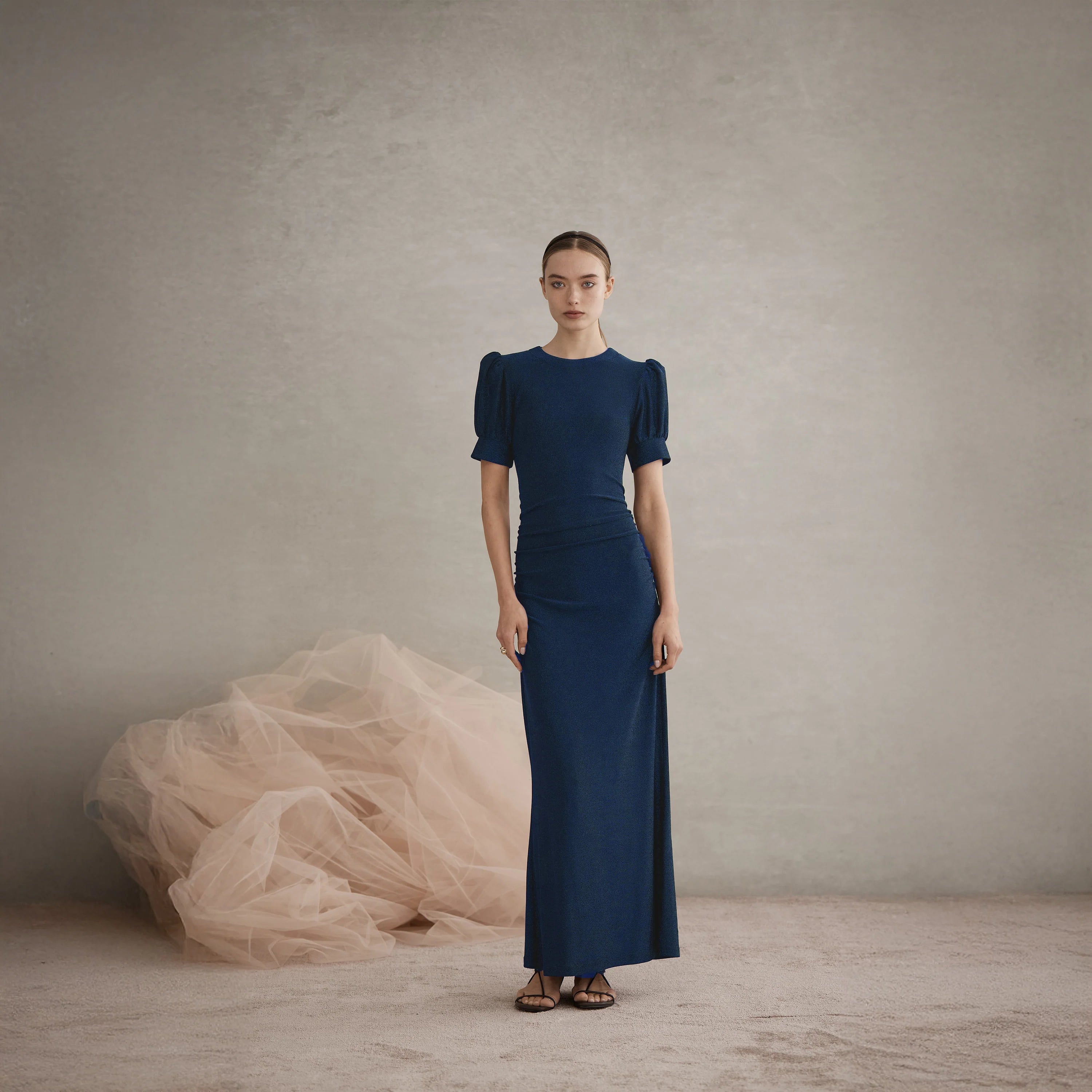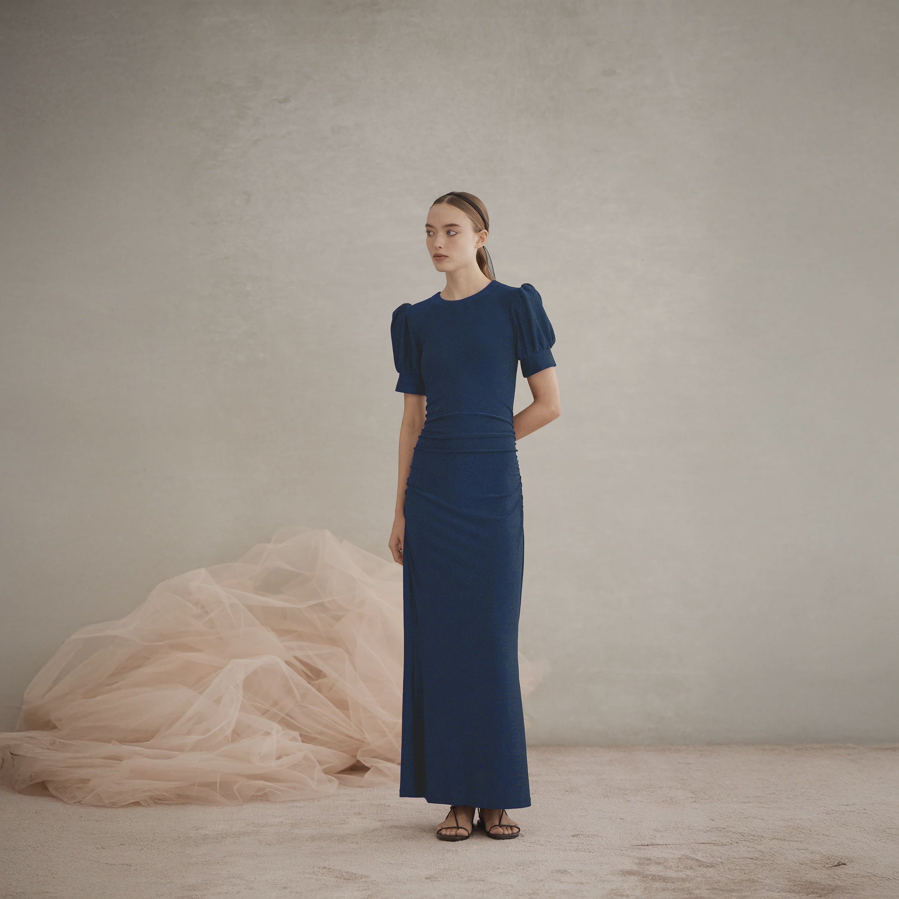 Luxe De Valentina Ruched Como Maxi Dress in Navy Fine Metallic Knit. Our Ruched Como Maxi Dress made in Navy Fine Metallic Knit is designed to flatter the body where ruching detail smooth and contour the body, offering gentle shaping and ease. Puff sleeves with shoulder pad support bring a touch of volume, while a round neckline finished with contrast piping and gold buttons deliver elegant detailing.