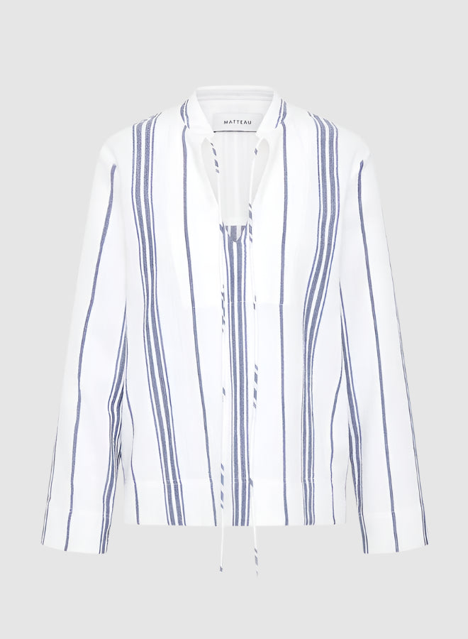 Matteau Fisherman Popover in Porto Stripe. Introducing the Fisherman Popover Shirt. Crafted from a textured cotton, this oversized silhouette features a crew neckline with rouleau ties at the neck. Style over swim for an easy beach look or with our Relaxed Crepe Pant for everyday.