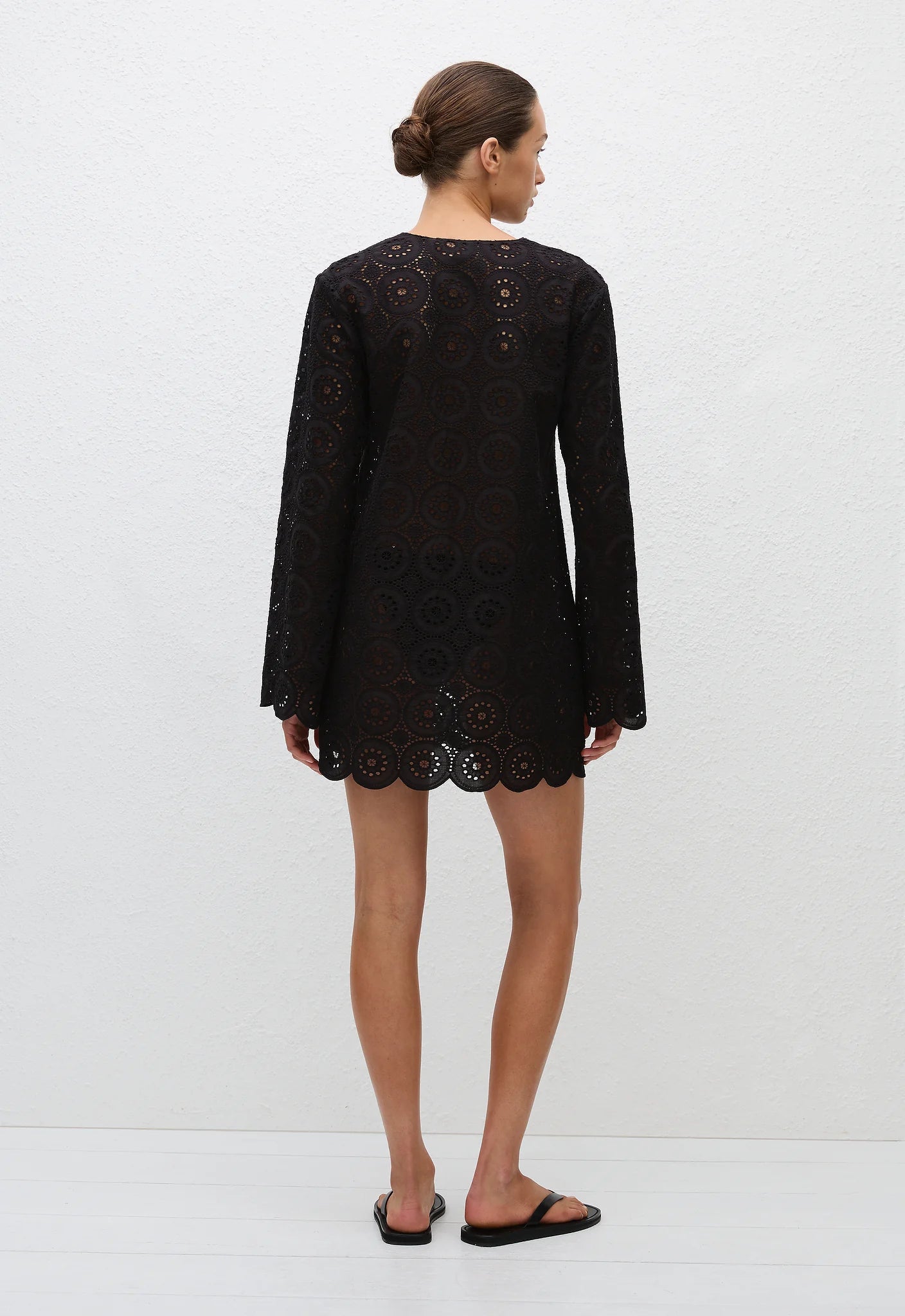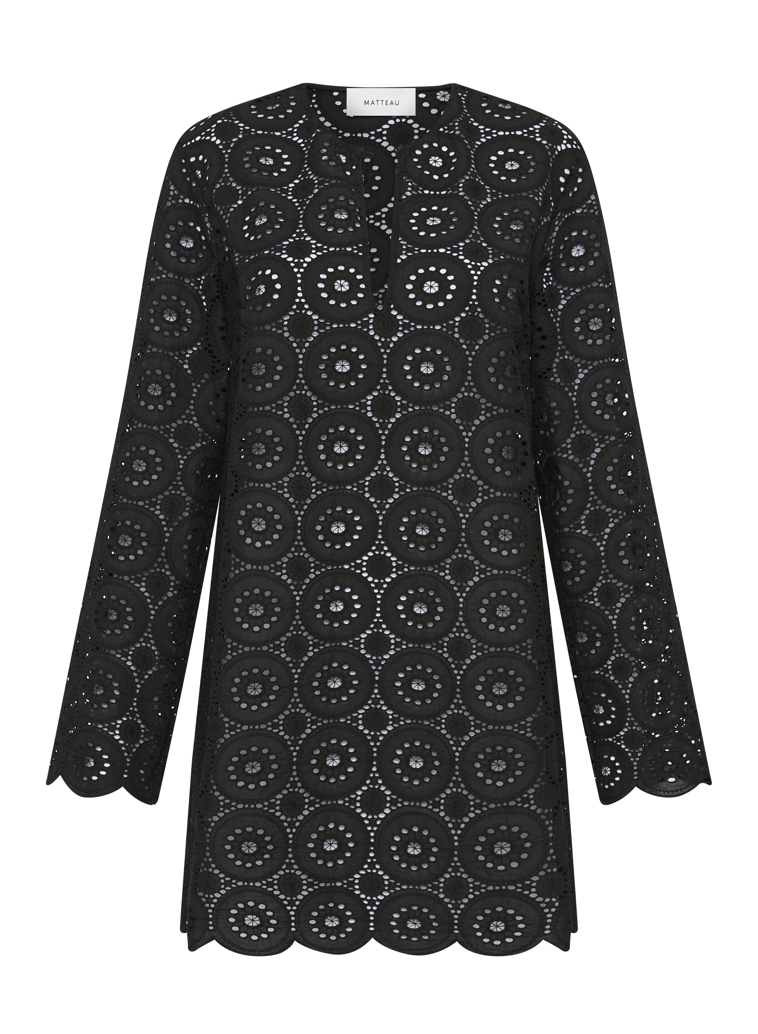 Matteau Broderie Mini Shirt Dress in Floral Broderie Black. This oversized yet elegant Broderie Tunic Dress in our delicate floral broderie features a scalloped hem finish on the body and sleeves. The perfect summer's day dress, wear it to the beach over one of our maillots or dress up with a pair of strappy sandals.