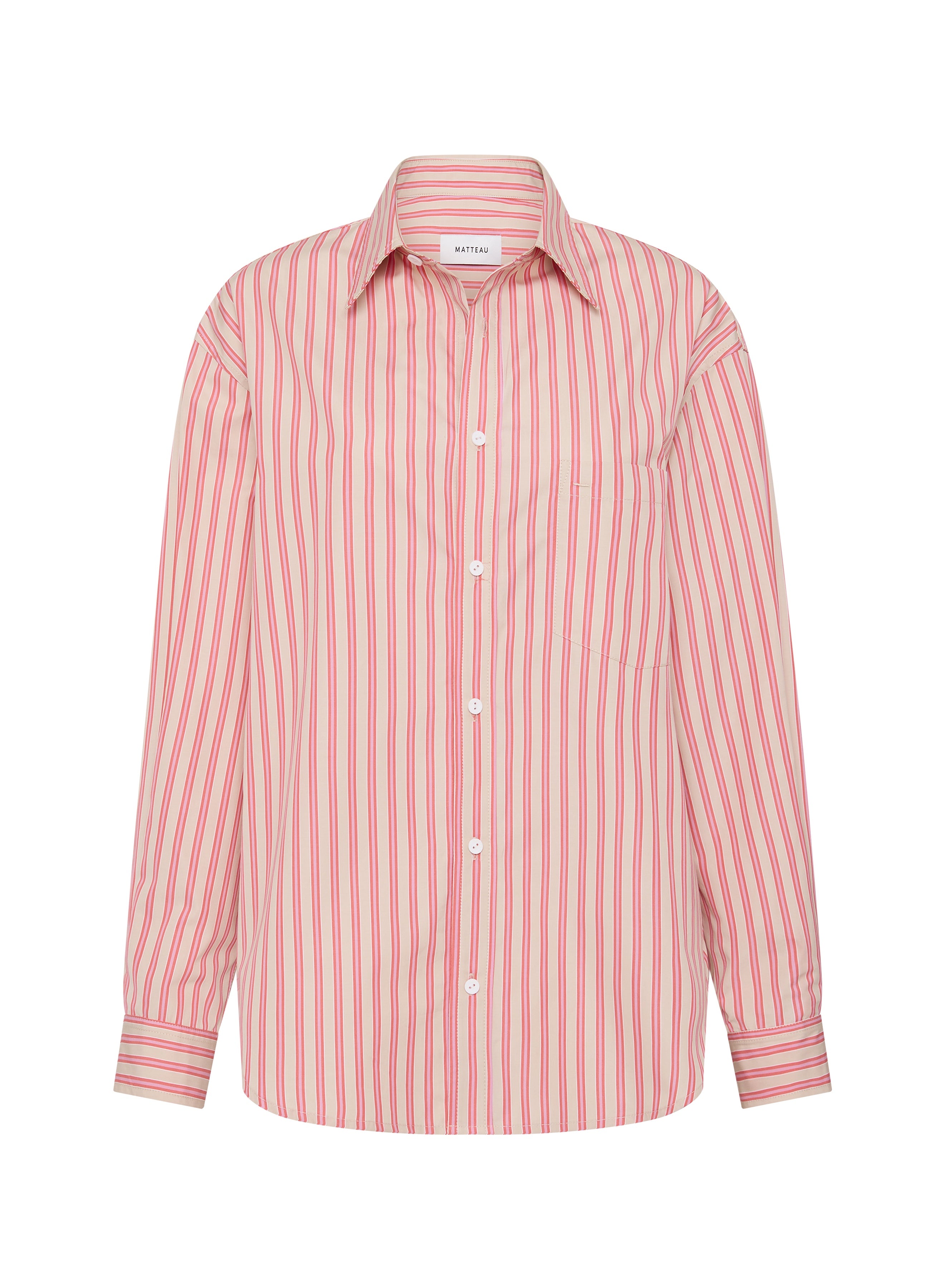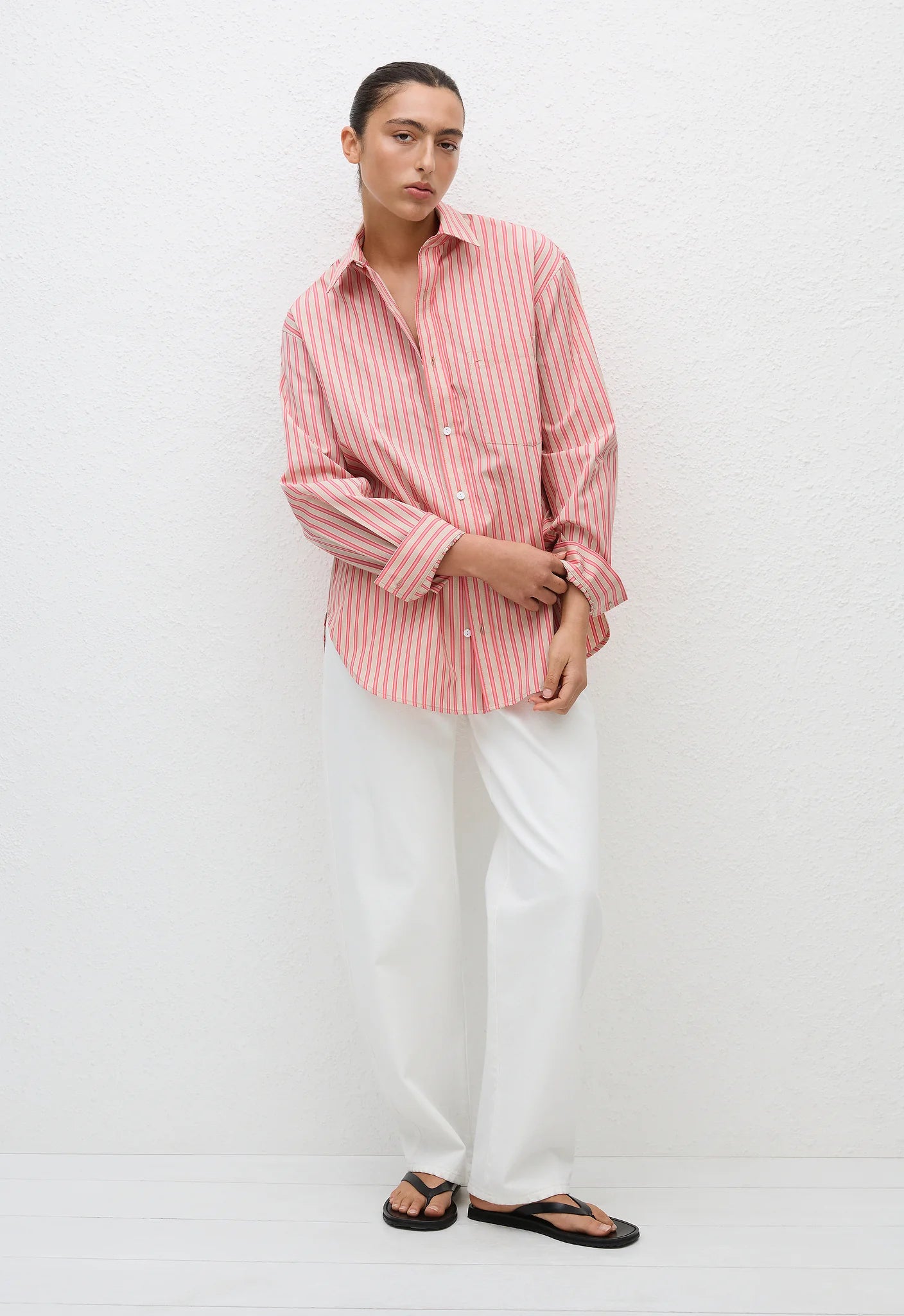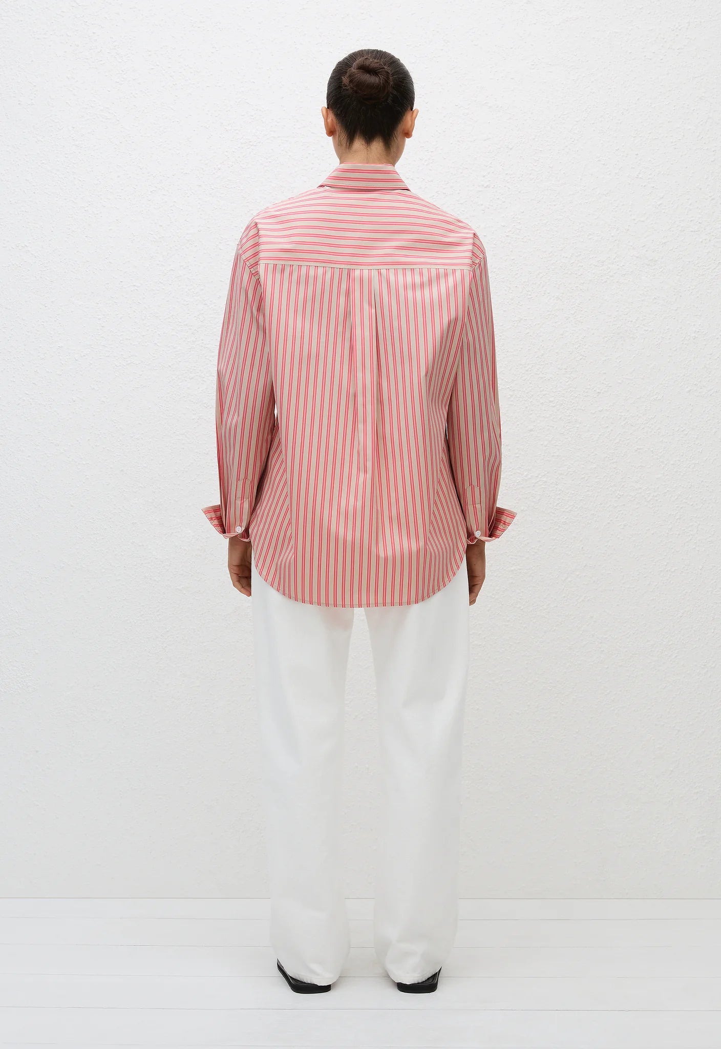Matteau Classic Stripe Shirt in Rose Stripe. A classic, oversized menswear-inspired shirt with a single front pocket. Made in an organic cotton, this woven-stripe shirt offers a relaxed fit with curved hems at the front and back, and a single box pleat at back yoke. Wear tucked in to our Relaxed Jean, and pulled together with our Everyday Belt and a pair of sandals.