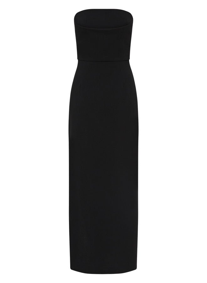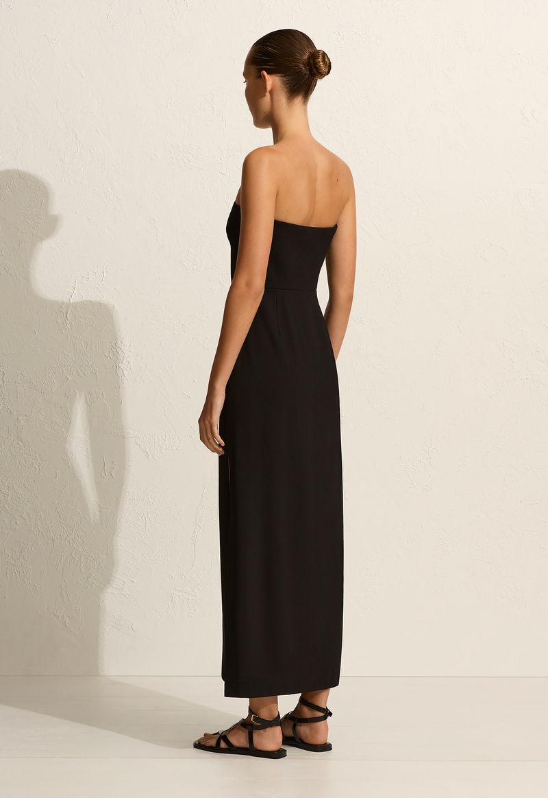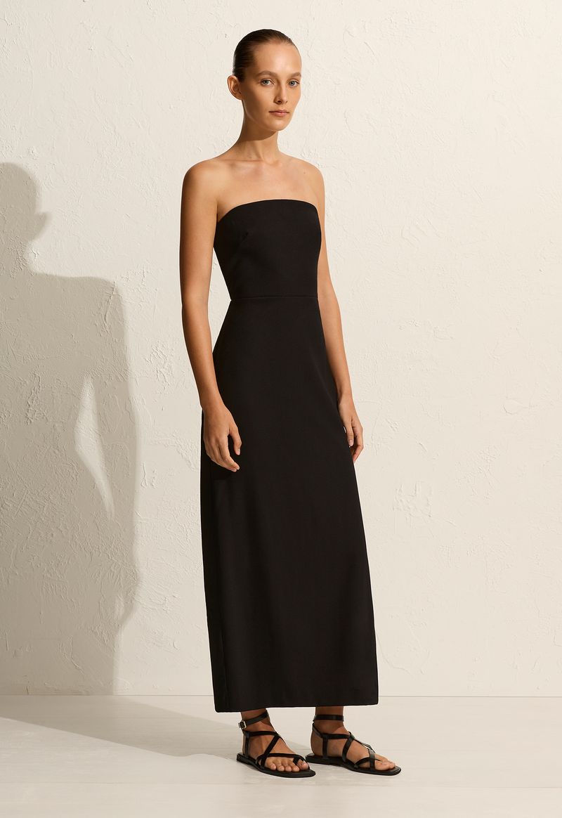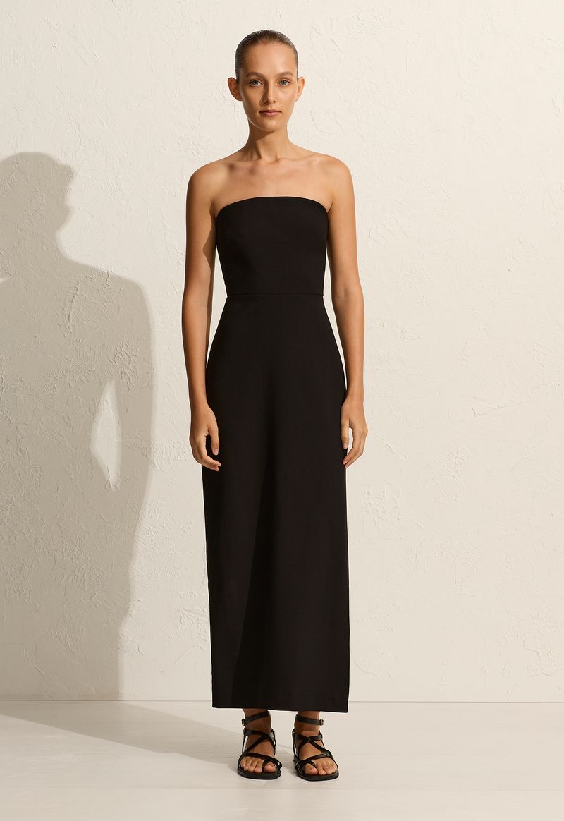 Yaz is 170cm and wears the Crepe Strapless Dress in Black in a size 4. This style is true to size, take your regular size.