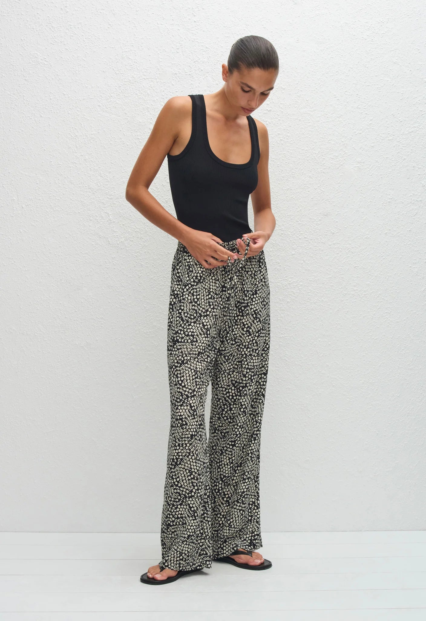 Matteau Drawstring Trouser in Kyoto. The perfect combination of comfort and elegance, this relaxed, straight-leg silk trouser features an elastic waist with functional drawstring, and side pockets. Made from our silk crepe de chine, we suggest pairing with our Ribbed Knit Tank or style as a set with a matching silk shirt.