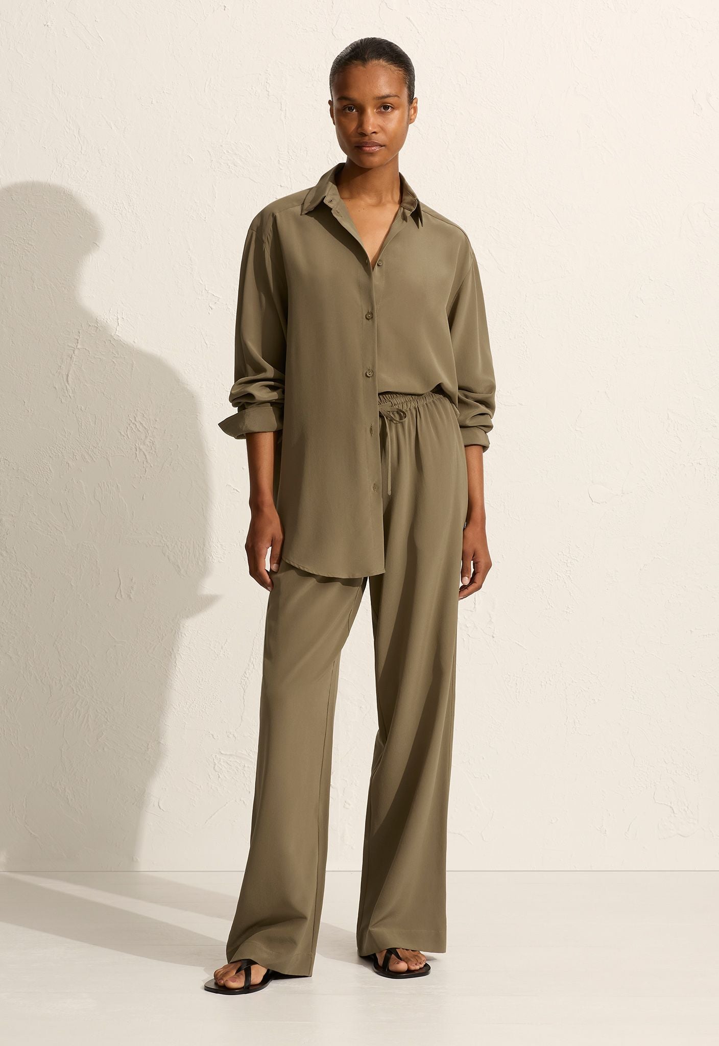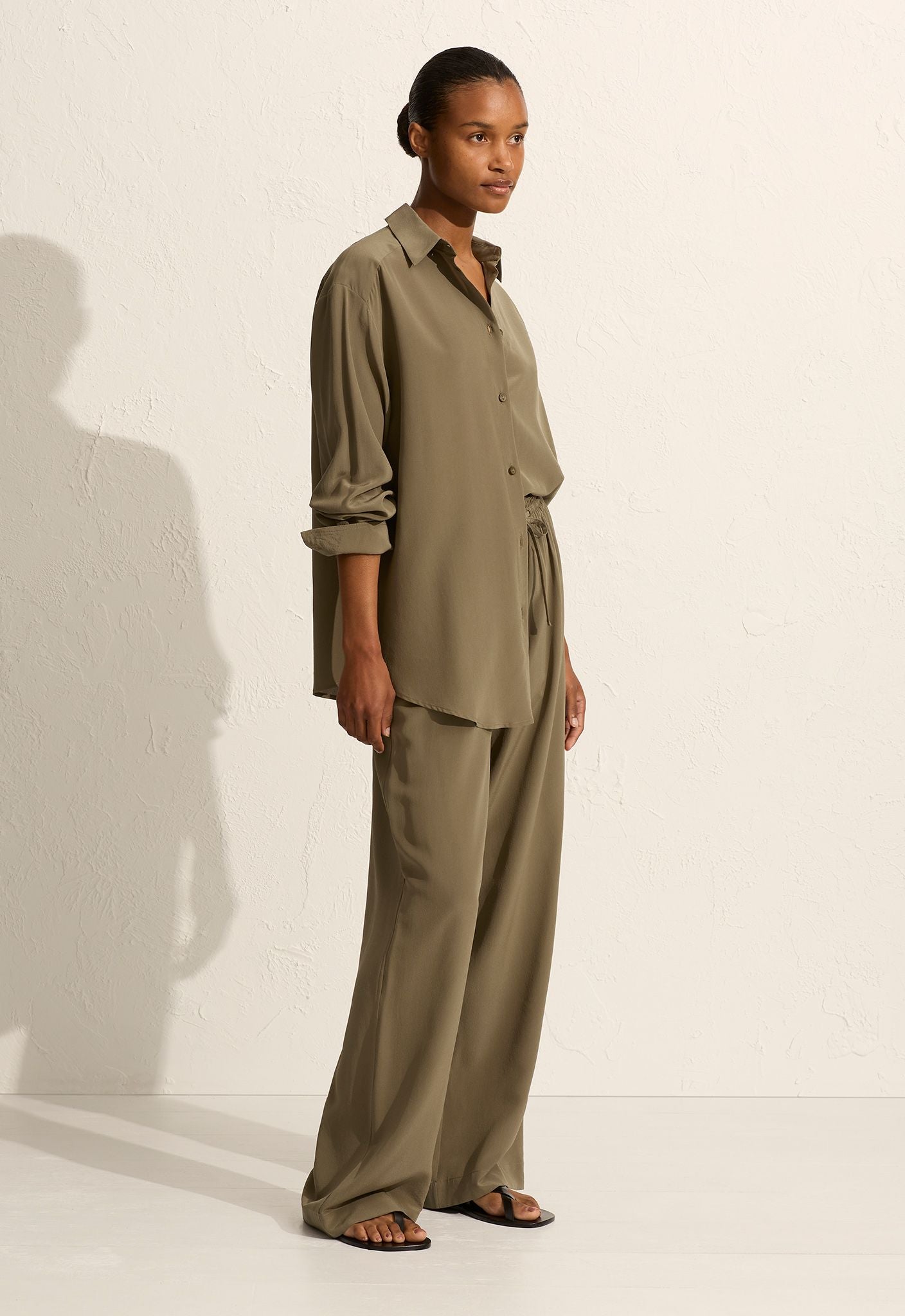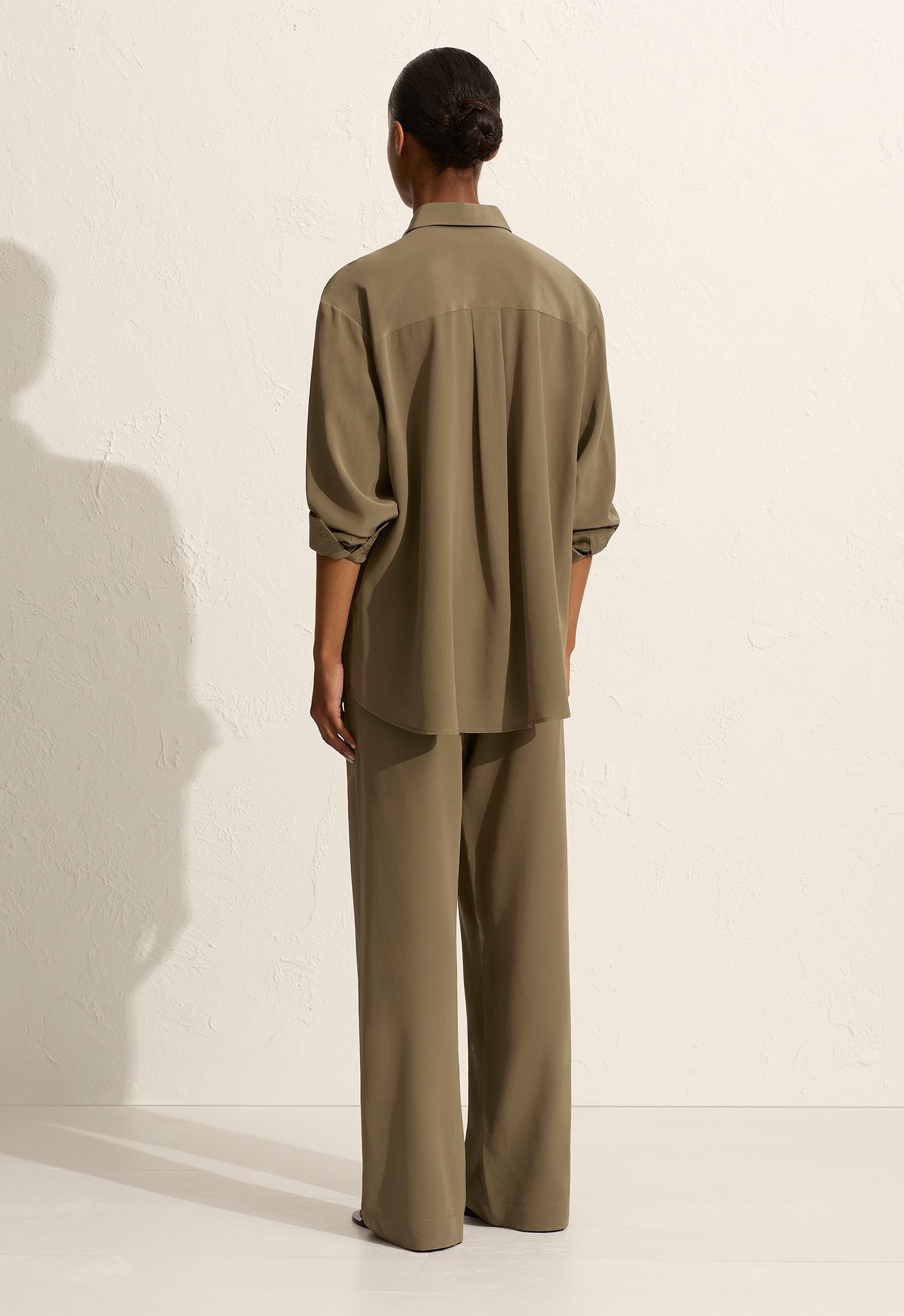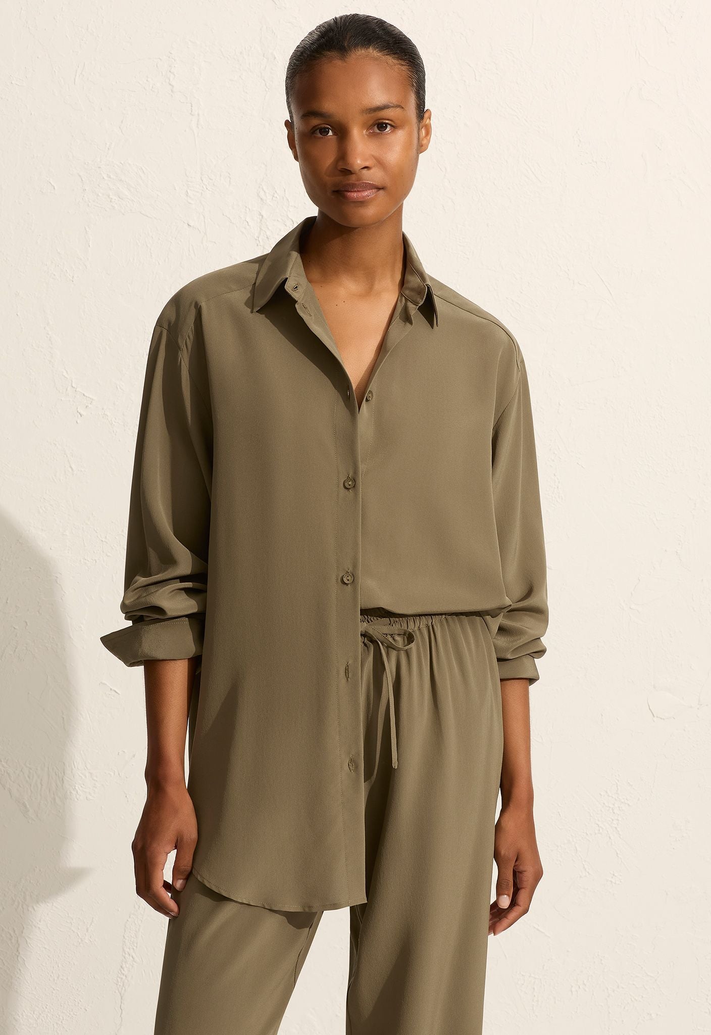 A classic relaxed long sleeve shirt in our silk crepe de chine. Featuring an exposed button placket, with side splits and a curved hemline. A slightly more refined shape from previous seasons, take your usual size or go one up for a more relaxed fit.
